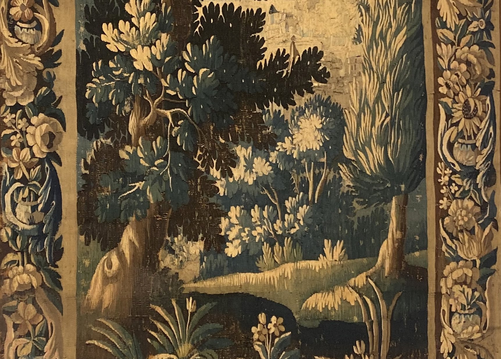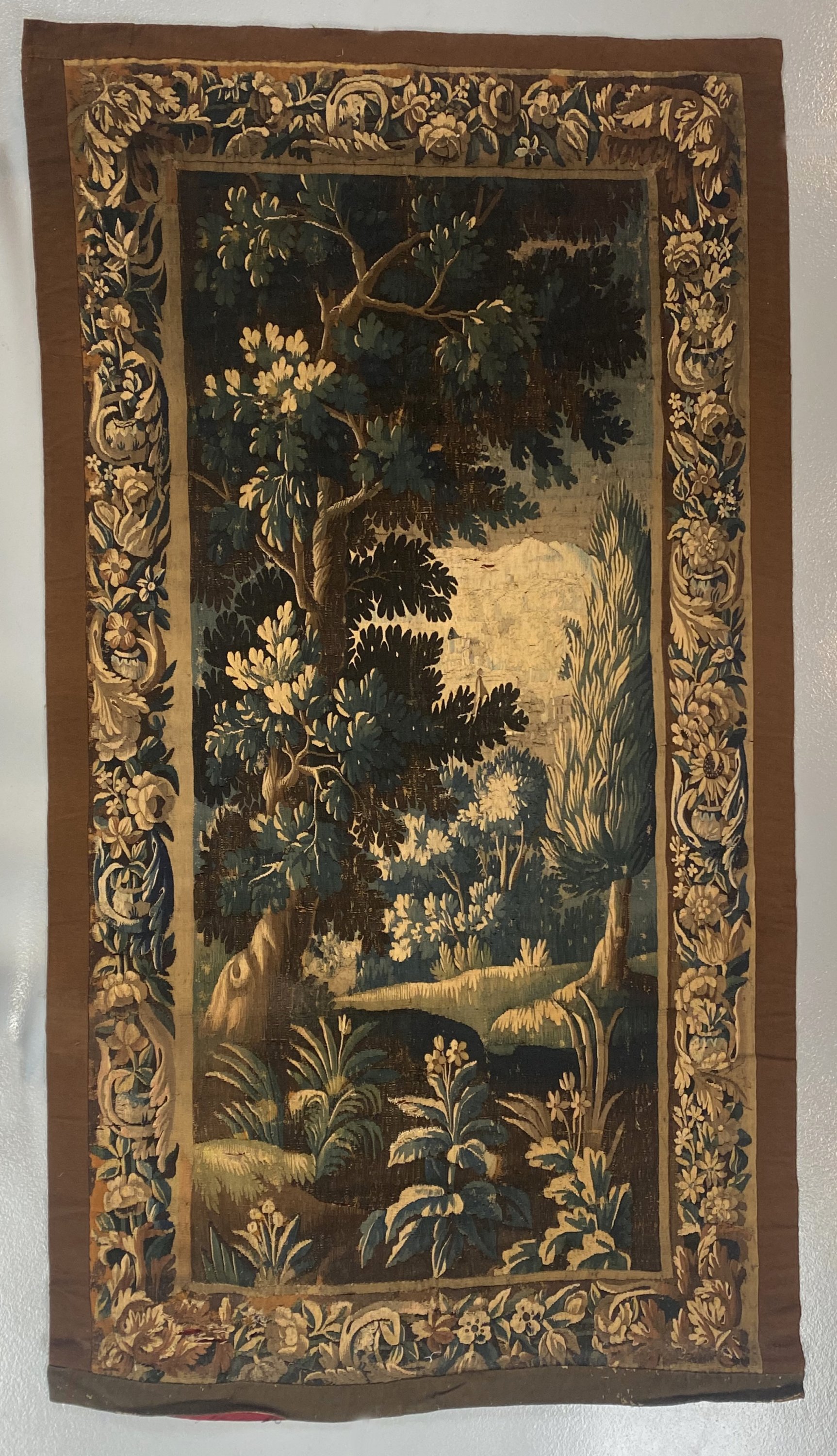 en laine et soie, verdure, avec sa bordure rentrayée de rinceaux de palmes et fleurs.