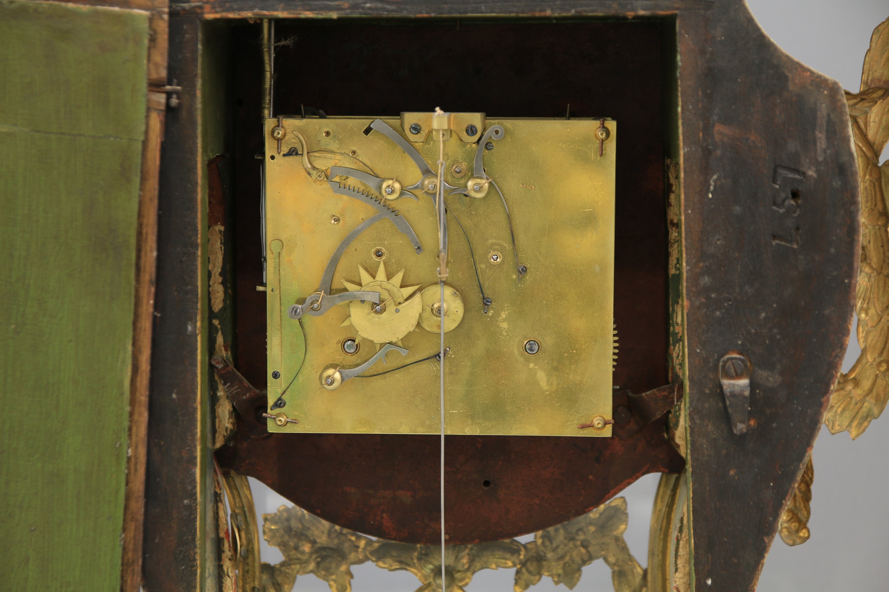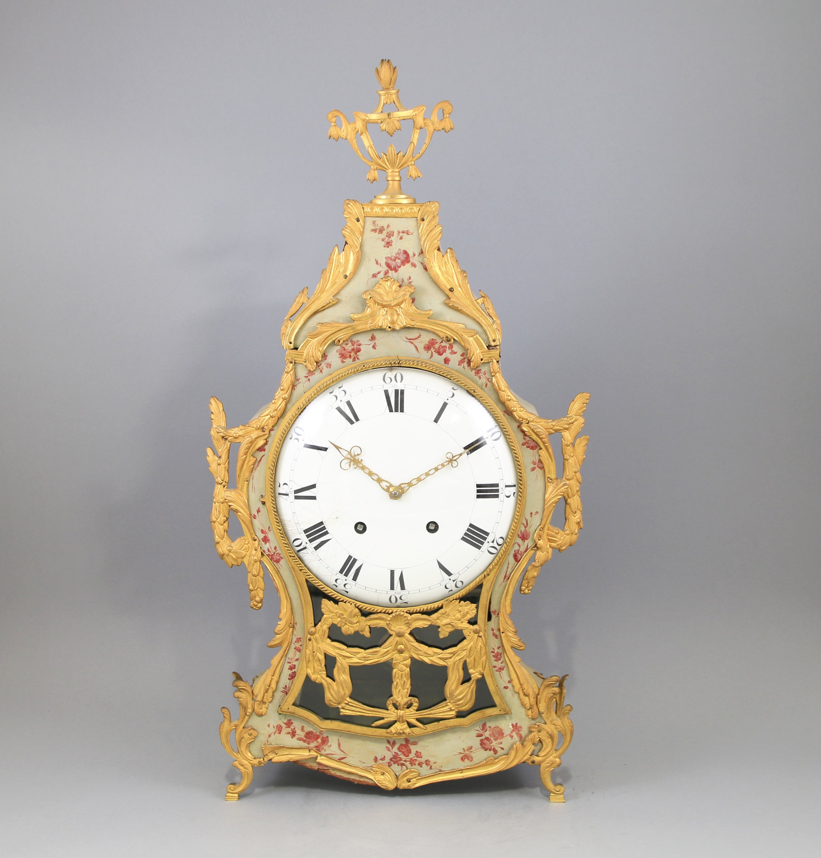 en vernis Martin coiffé en partie supérieure d'un vase. Le cadran émaillé blanc indiquant les heures en chiffres romains, les minutes par un chemin de fer.