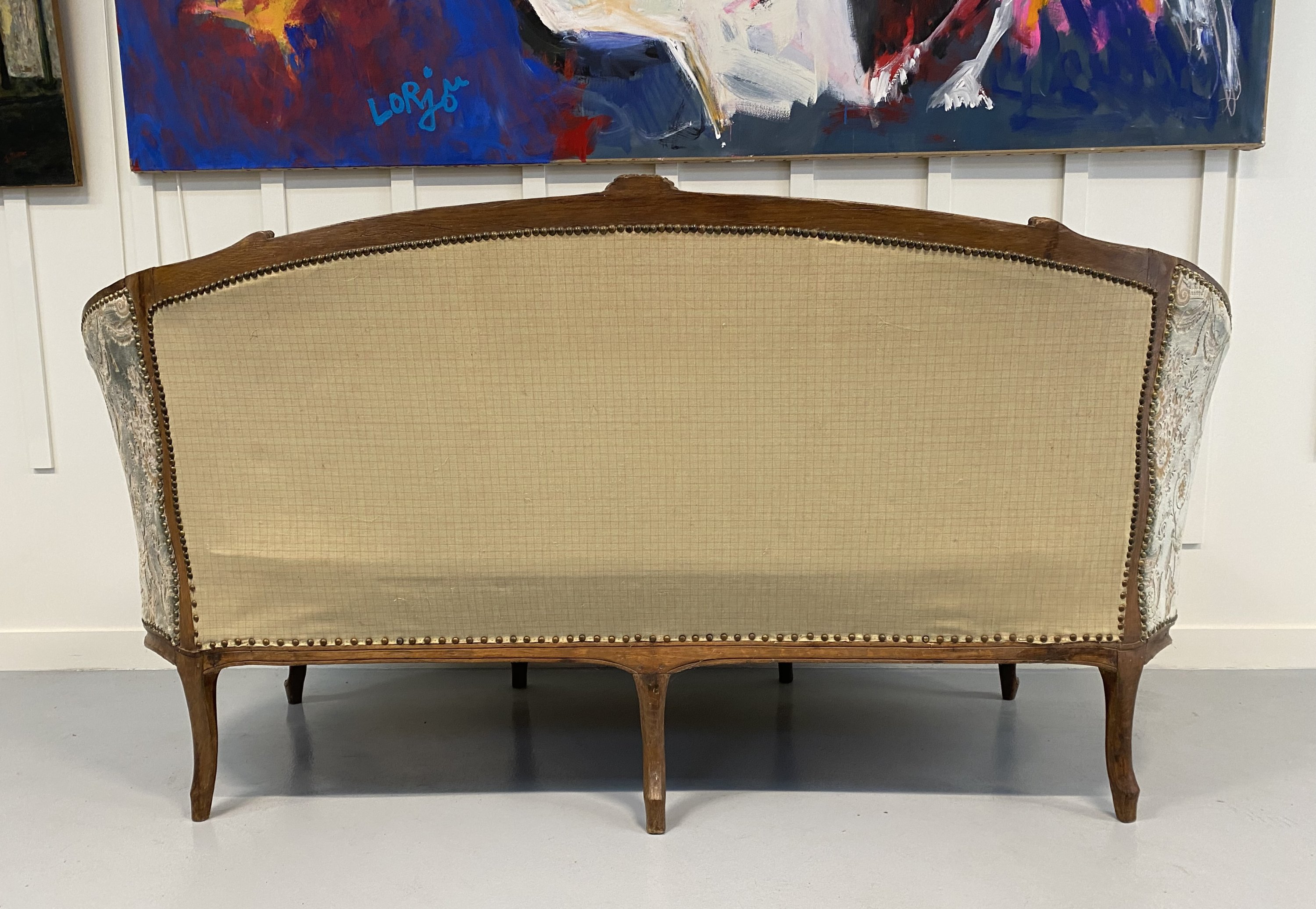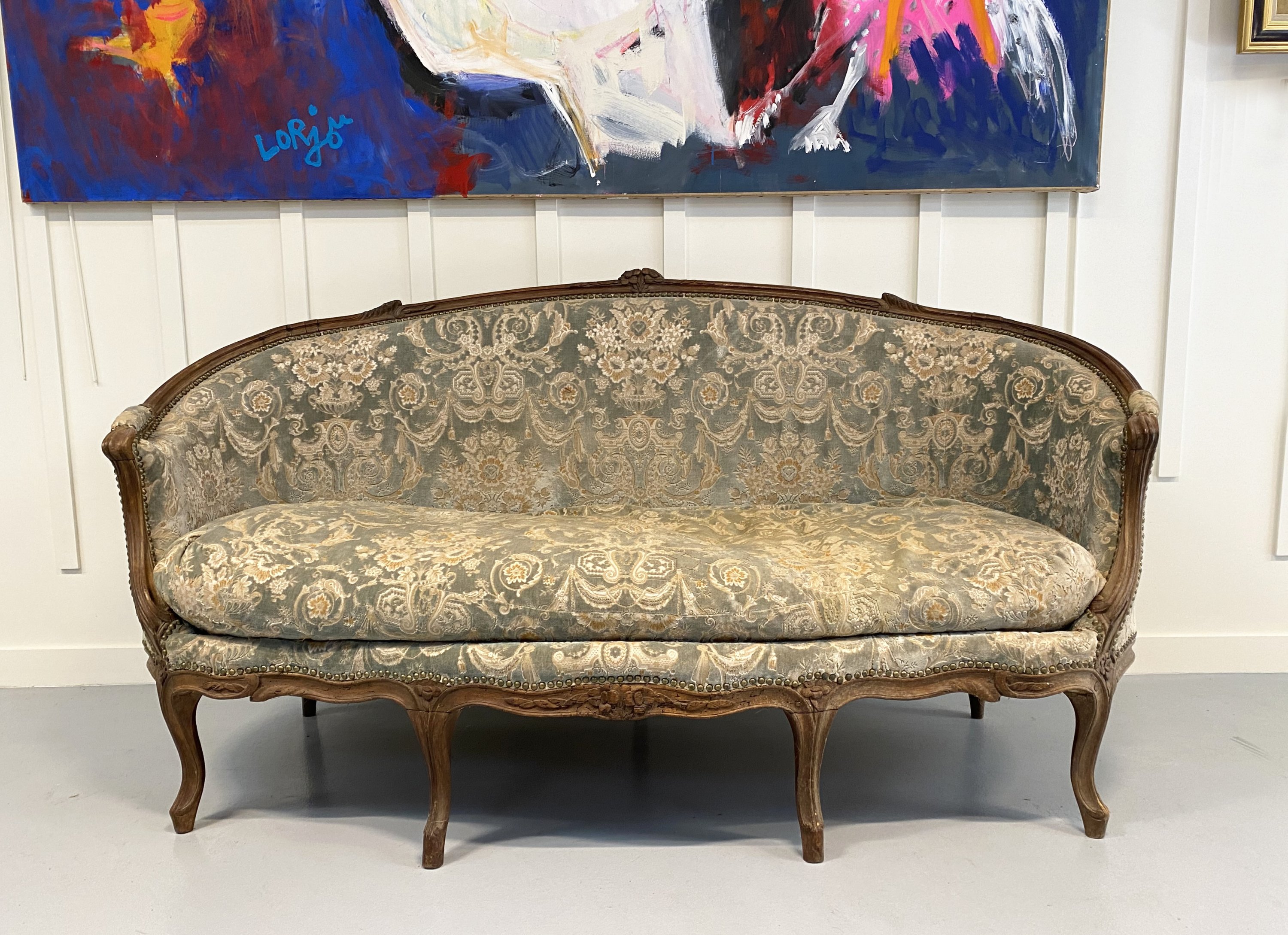 en hêtre mouluré et sculpté, à dossier sommé à l'amortissement de deux marguerites entourées à l'épaulement de feuilles d'acanthe. Les accotoirs à manchettes. Il repose sur sept pieds cambrés.