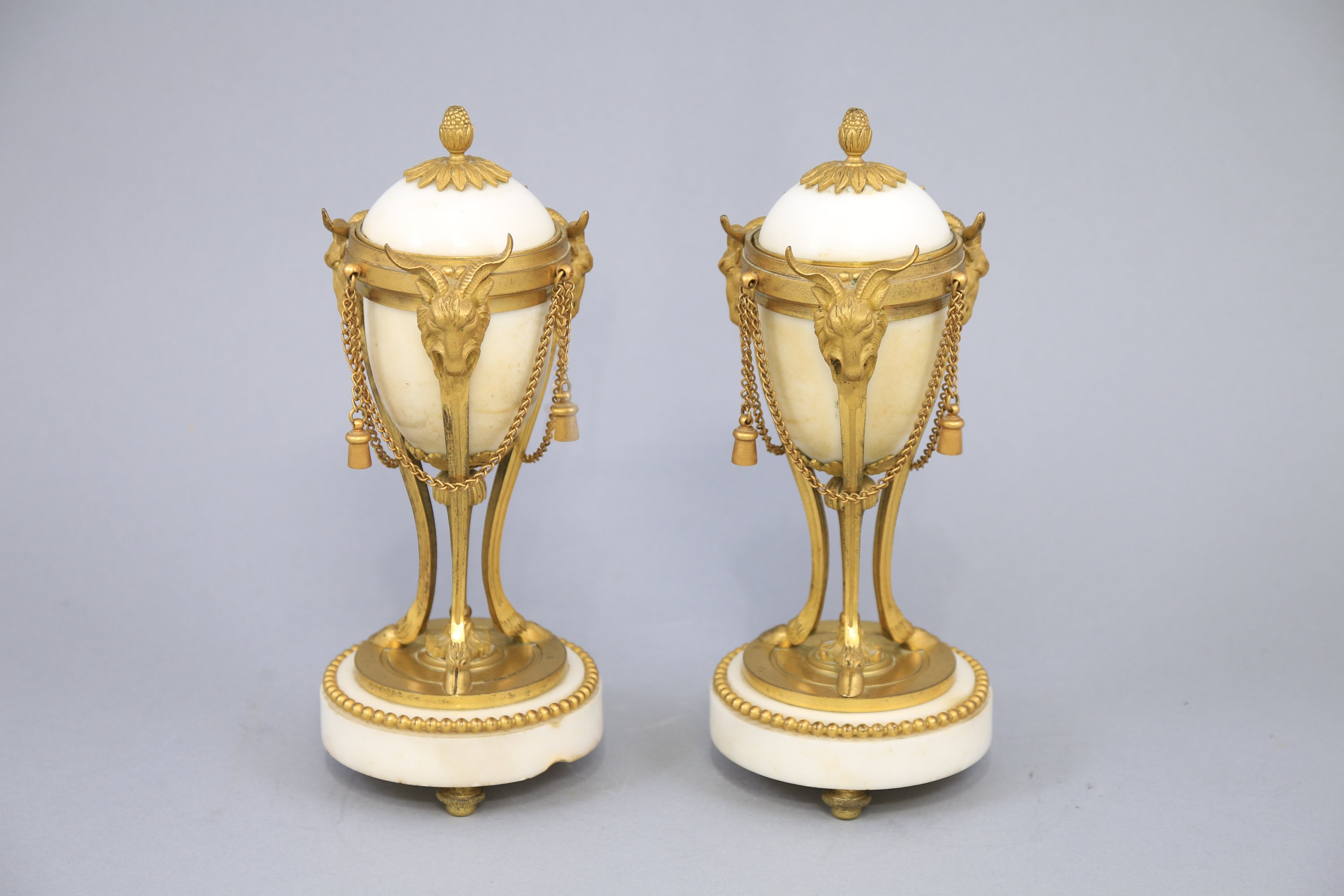 en marbre blanc, de forme ovoïde sur un piétement tripode en bronze doré et ciselé. La partie supérieure en dôme présente un fretel en forme de grenade sur une terrasse de feuilles se renversant pour former bougeoirs. Le piétement tripode en Athénienne à décor de têtes de bélier se terminant par des sabots. Un fût central fuselé terminé par une terrasse végétale. La base circulaire moulurée est soulignée par une frise de perles et soutenue par trois pieds à patins.