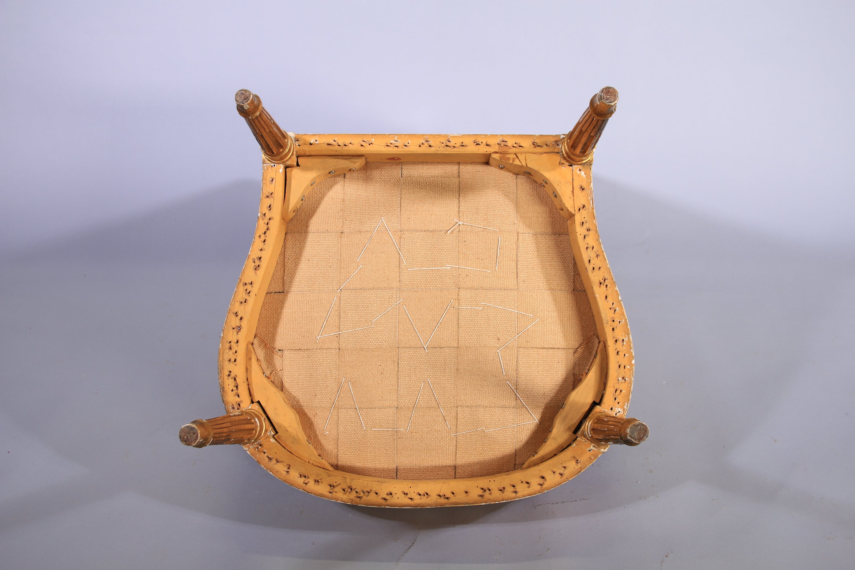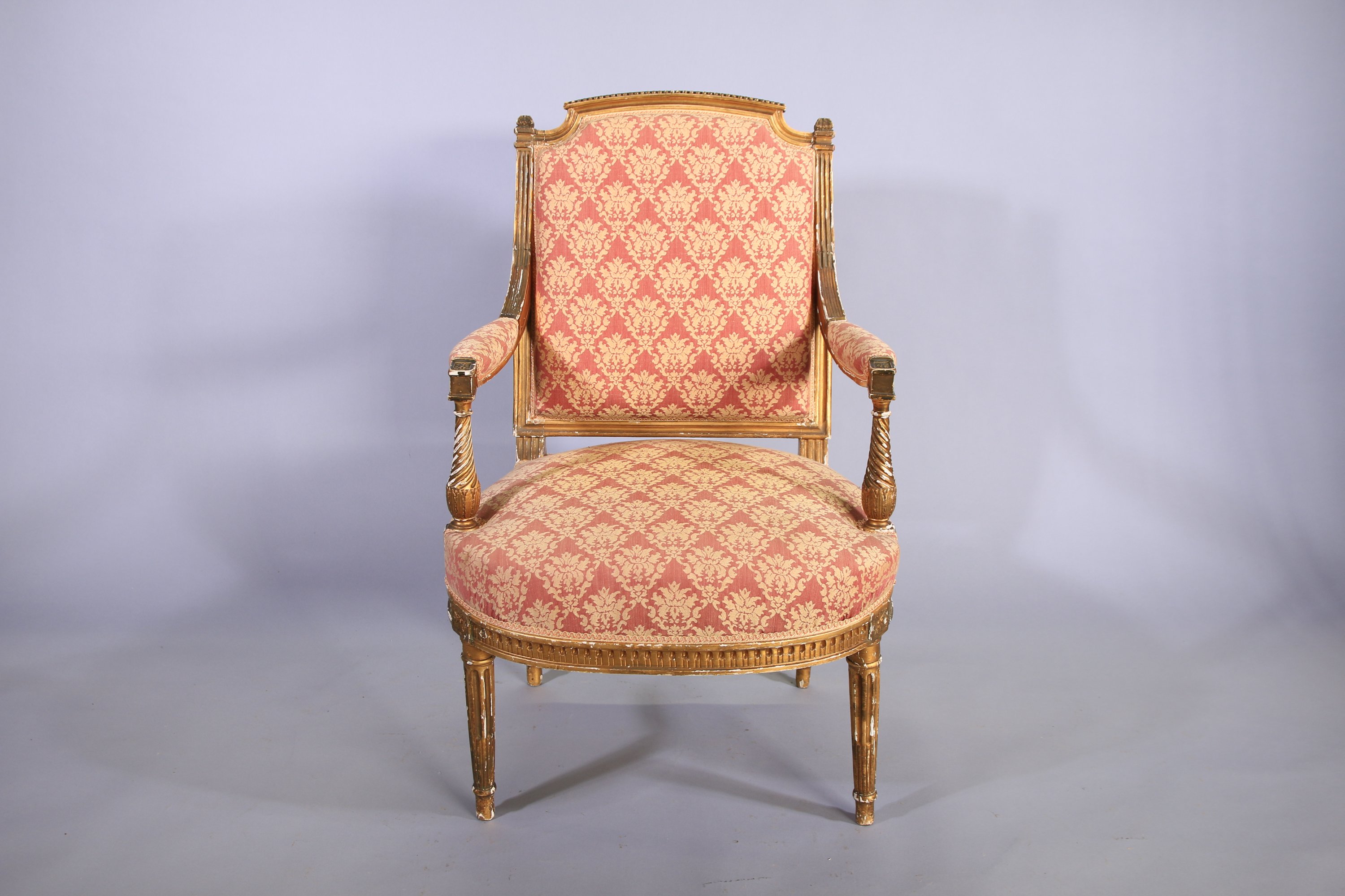en bois mouluré, sculpté et doré à dossier en chapeau de gendarme, les accotoirs à manchettes reposant sur des supports en colonne torsadée. L'assise en fer à cheval soutenue par quatre pieds cannelés et rudentés.