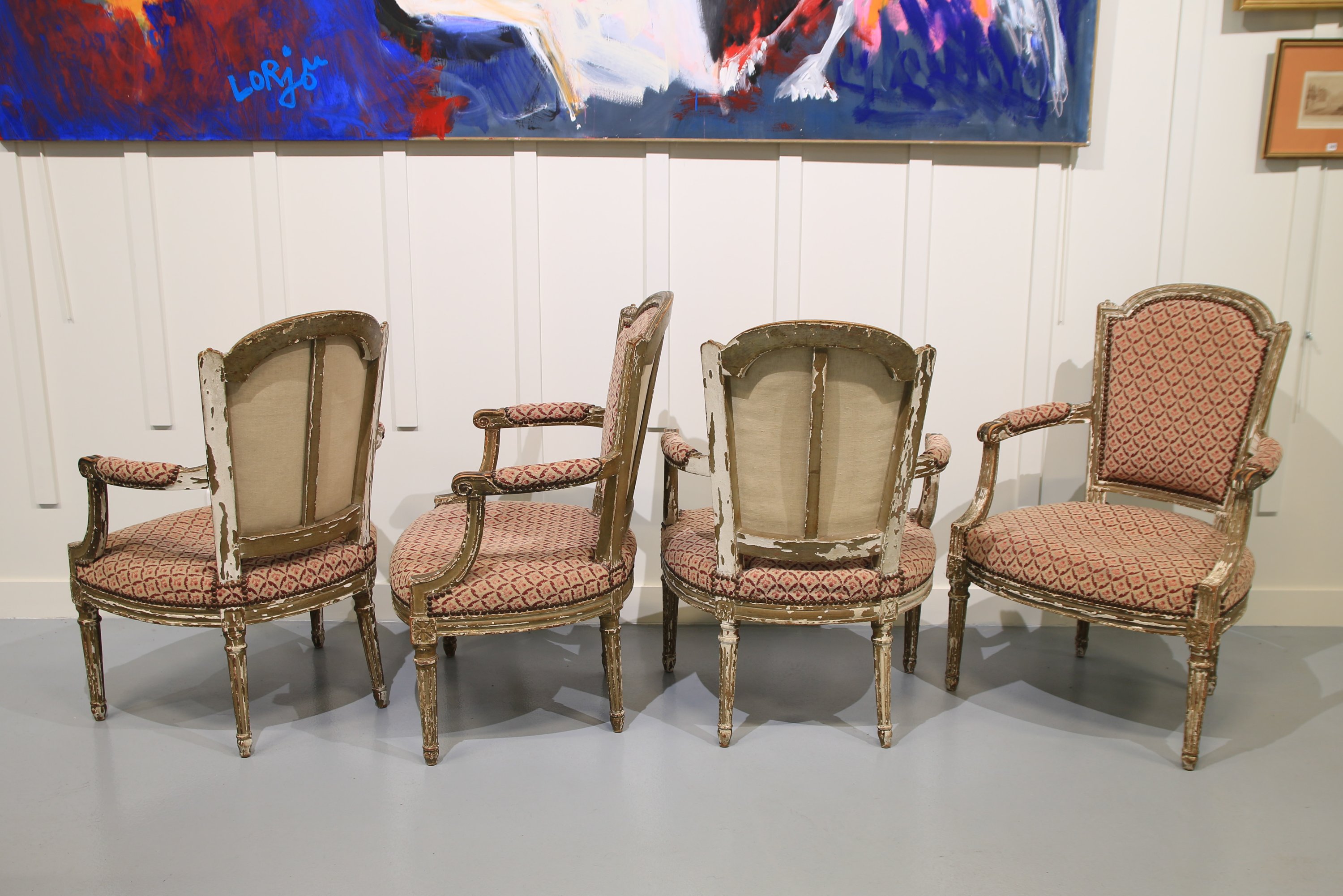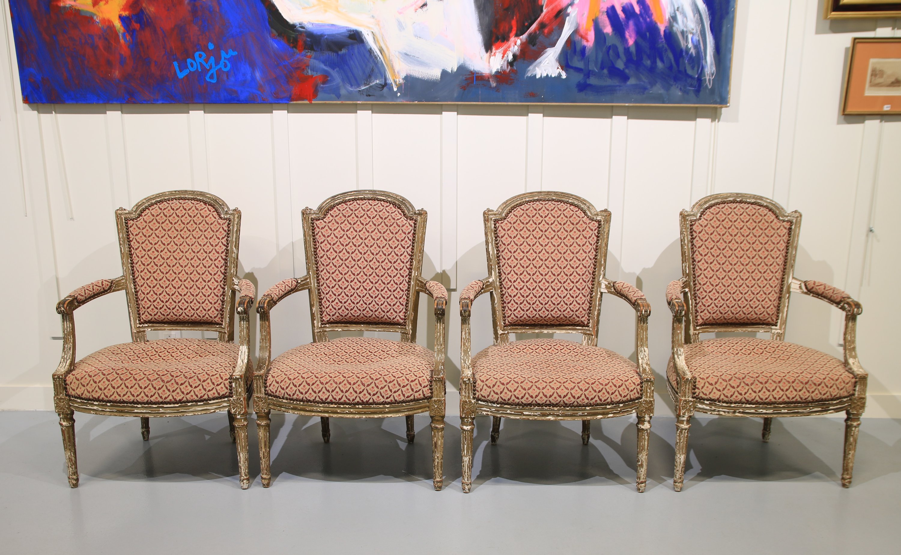 en hêtre mouluré, sculpté, laqué et anciennement doré. Les dossiers de forme trapézoïdale sont sommés de chapeaux de gendarme. Les accotoirs à manchettes sont soutenus pas des consoles cannelées retenues par des dés de raccordement à fleurettes. Ils reposent sur quatre pieds fuselés, cannelés et les antérieurs rudentés.