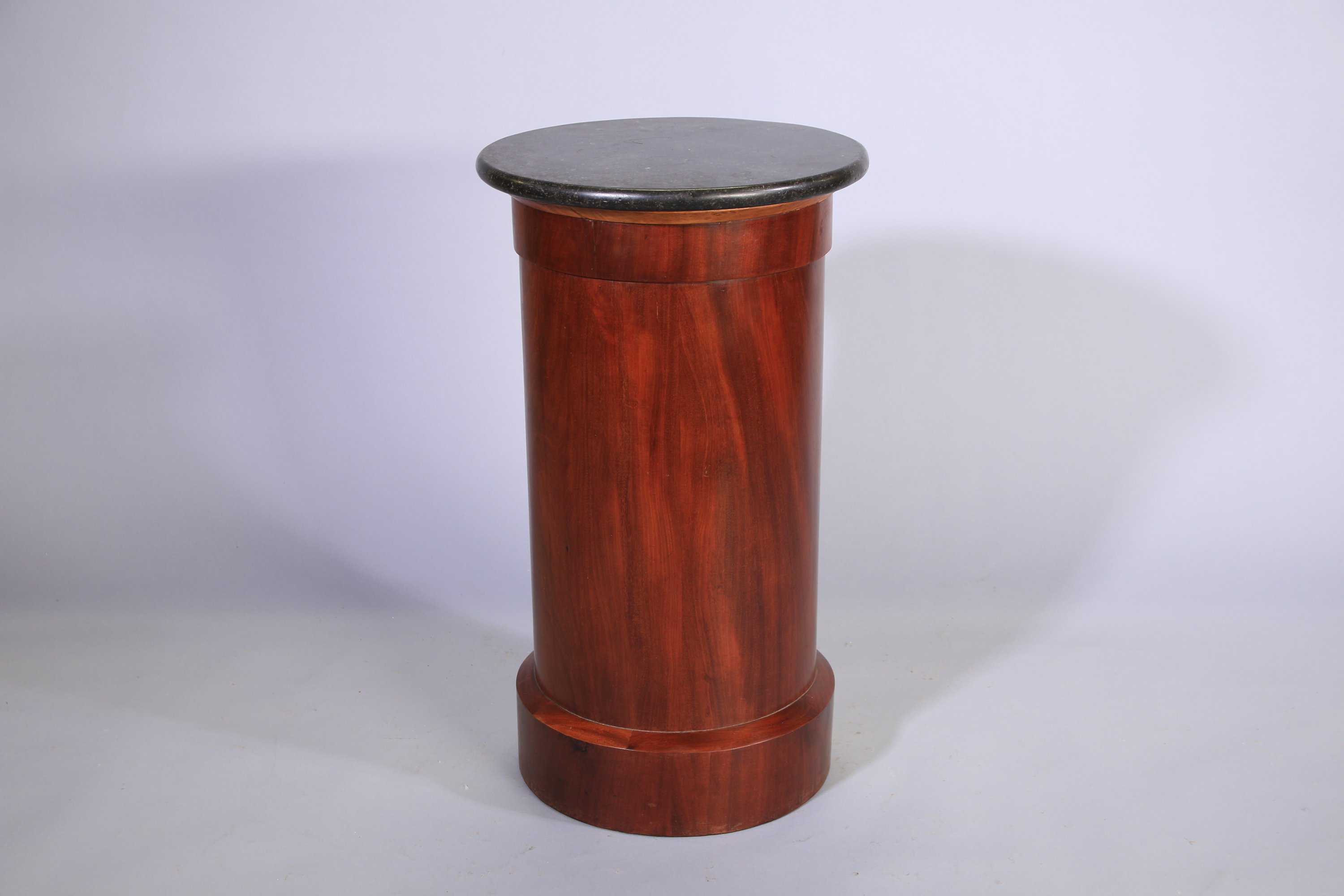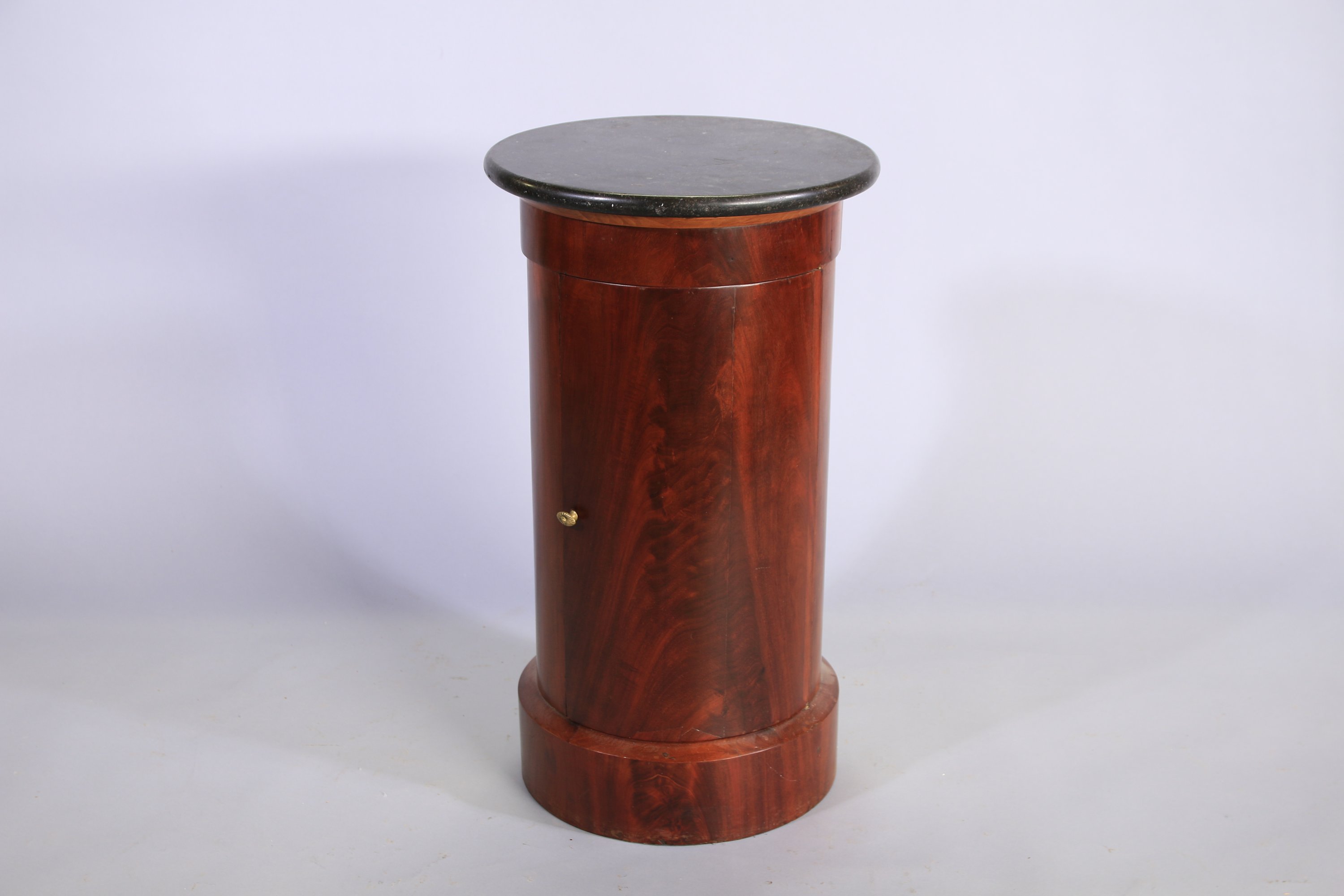 en placage d'acajou ouvrant par un vantail découvrant deux tablettes, dont une coiffée d'un marbre blanc. Il repose sur une plinthe.