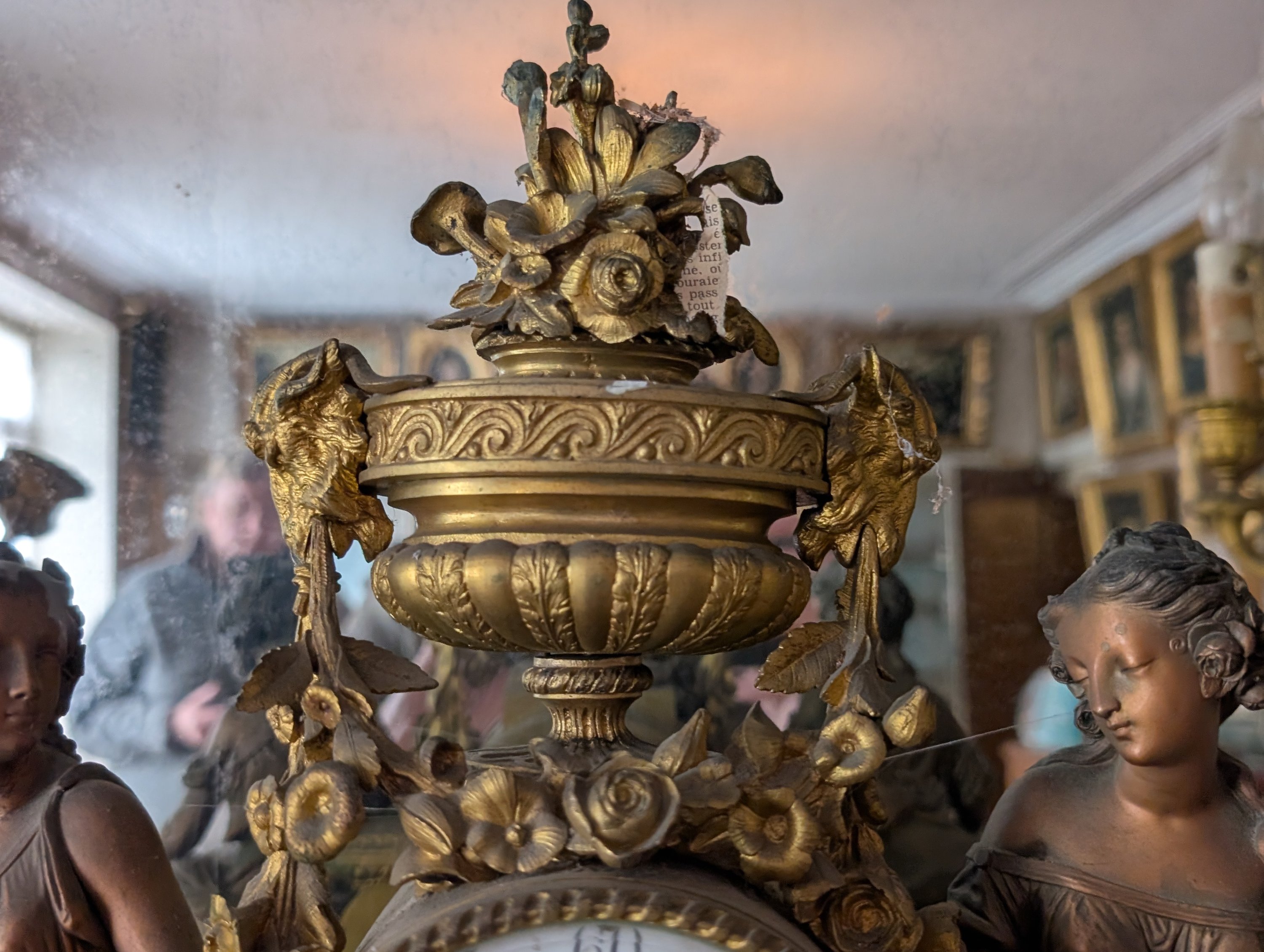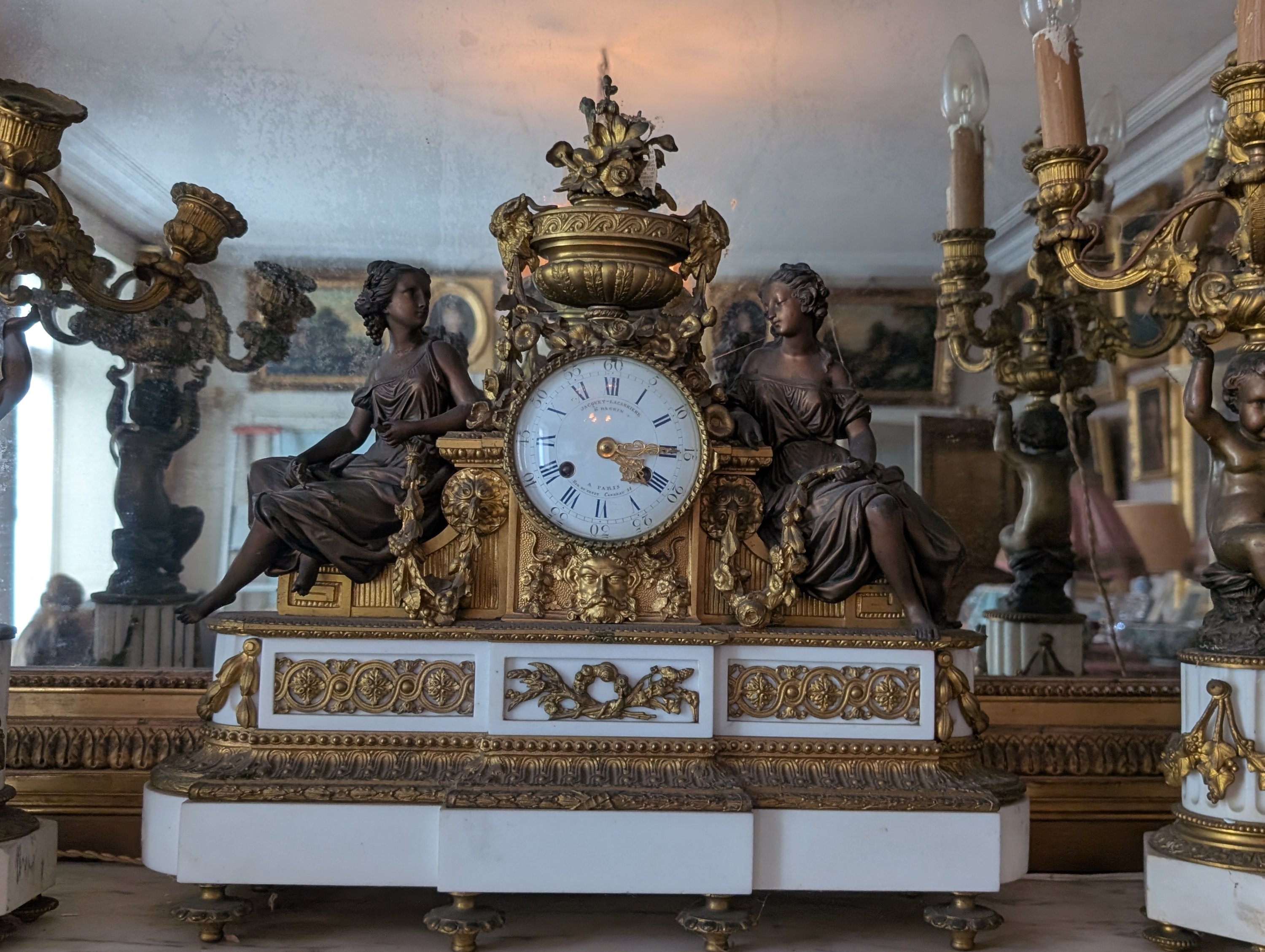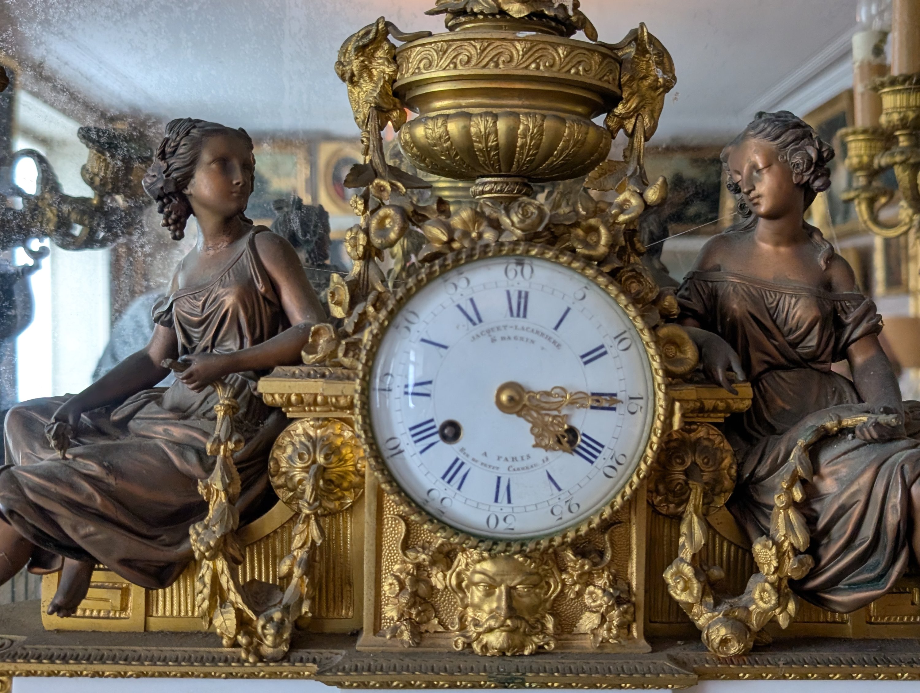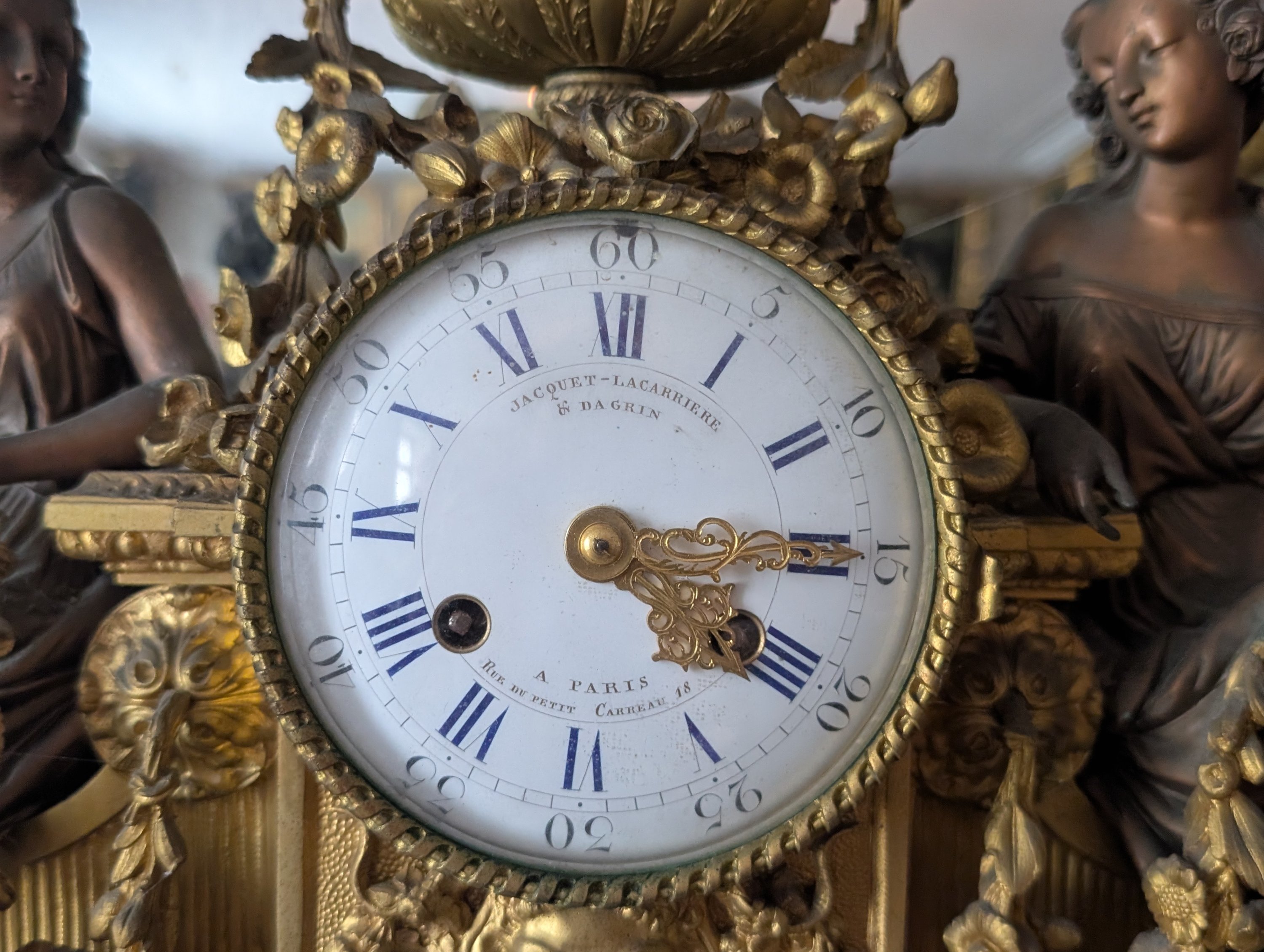 La pendule présente deux déesses encadrant le mouvement, cadran émaillé blanc indiquant les heures en chiffres romains et les minutes en chiffres arabes, signé "Jacquet-Lacarriere et Dagrin A Paris Rue du Petit Carreau 18". La caisse en bronze doré est surmontée d'une vasque couronnée de fleurs dont les anses en têtes de bélier laissent ploire des guirlandes de roses et de laurier. Elle repose sur une base de marbre blanc rehaussé d'ornements en bronze dorés figurant des guirlandes de fleurs, des épis de blés, des enroulements et des fleurettes, laquelle repose sur des pieds toupies.