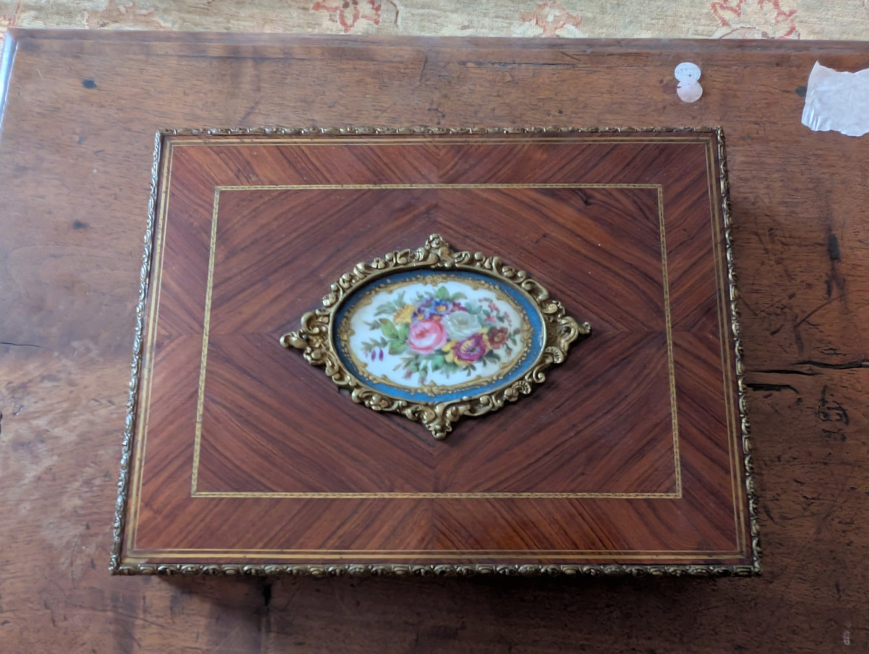 en placage de palissandre et de bois de rose, le couvercle orné d'une plaque de porcelaine (Sèvres ?) à motif d'une jetée de fleurs dans un encadrement de bronzes dorés.