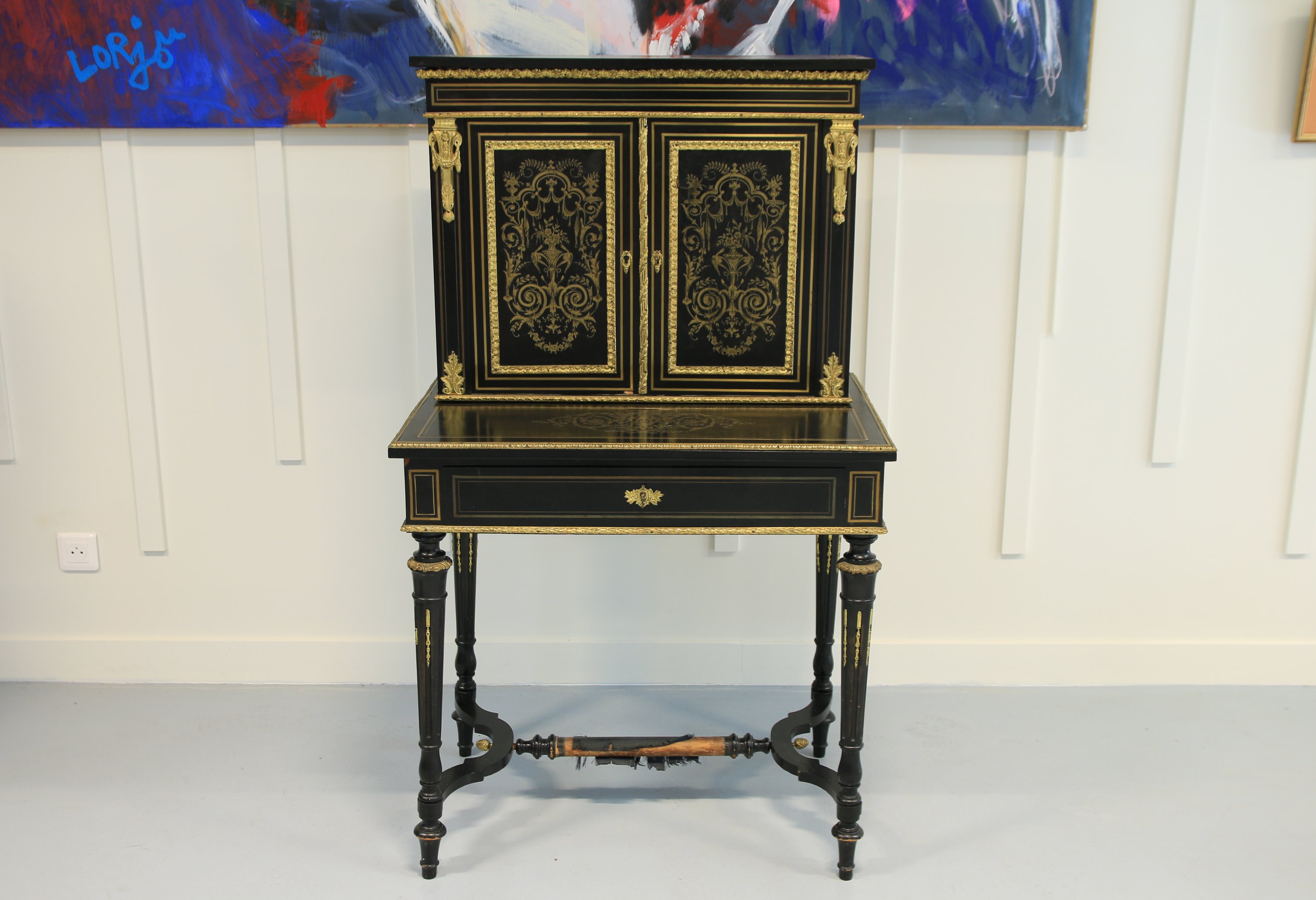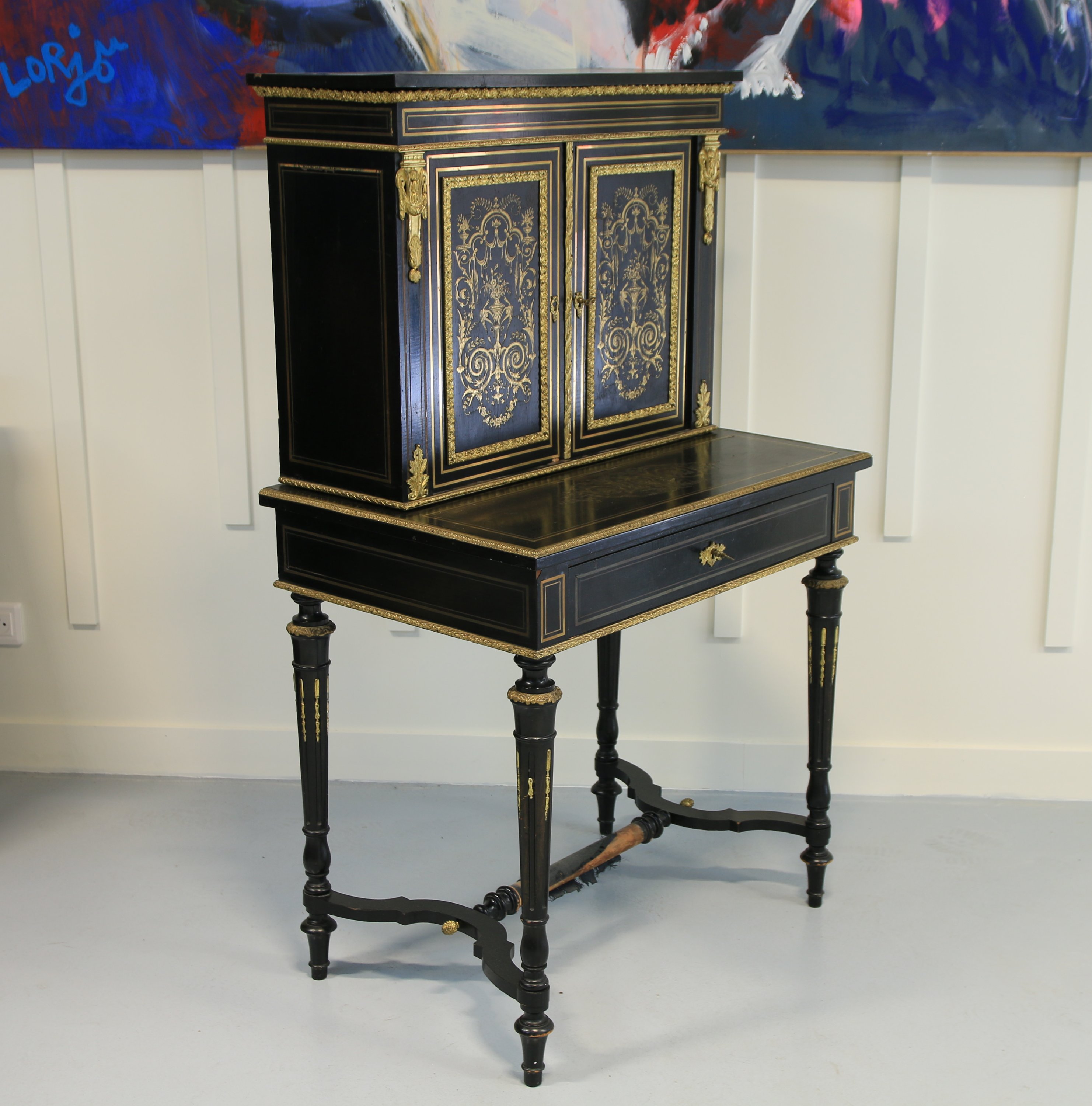 en bois noirci et marqueterie de laiton. Le plateau supérieur est décoré d'un double filet de laiton encadré par une frise végétale et de tores de laurier. Les deux vantaux sont ornés de rinceaux entourant un vase fleuri aux oiseaux affrontés. L'intérieur présente deux étagères et deux tiroirs plaqués de bois clair, bois de rose et loupe. La ceinture ouvre par un tiroir et repose sur quatre pieds fuselés et cannelés réunis par une entretoise en H.