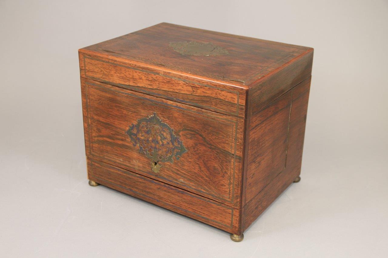 en placage de palissandre. Le couvercle décoré de deux cartouches en laiton à motif de rinceaux cernés d'un double filet. L'intérieur formé d'un plateau à une prise centrale présente seize compartiments à verres et quatre emplacements pour les carafons. Elle repose sur quatre pieds patins.