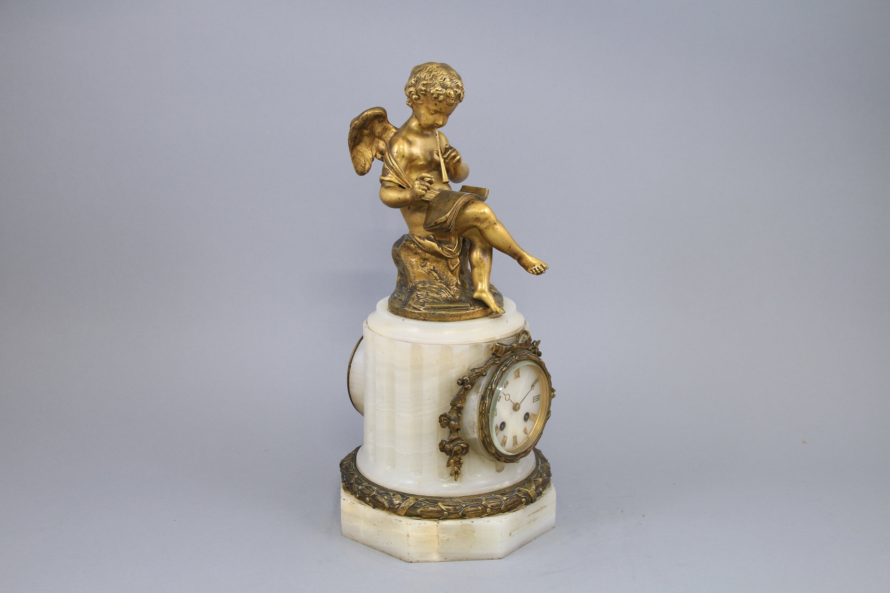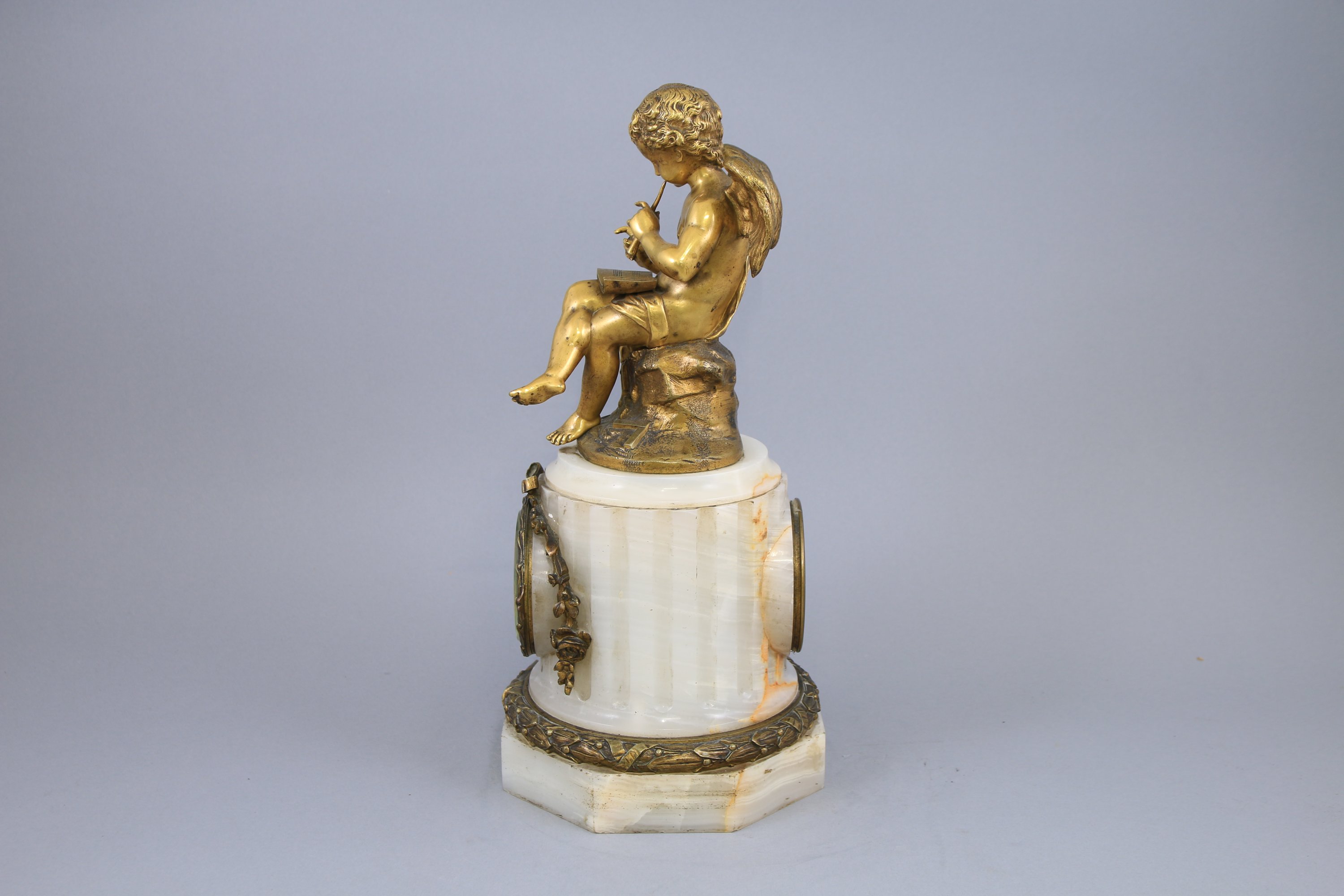 en onyx et bronze. Le cadran entouré d'une guirlande végétale indique les heures en chiffres romains. Il est inscrit dans une demi-colonne cannelée surmontée d'un sujet en bronze en forme d'un putto à la trompe et la partition de musique. L'ensemble repose sur une base octogonale décorée de tores de laurier.
