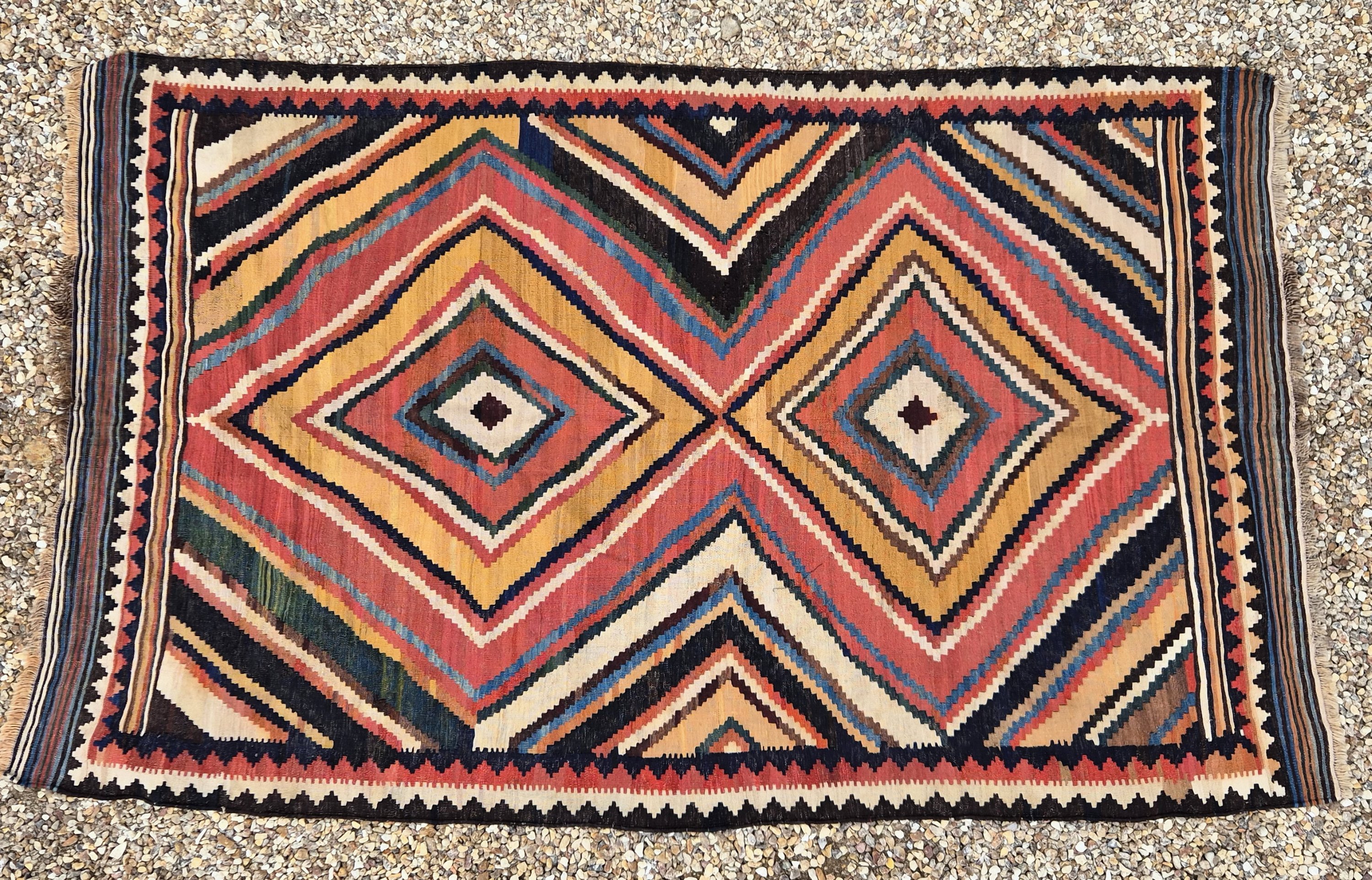 orné de deux médaillons cernés de bandes longitudinales multicolores.