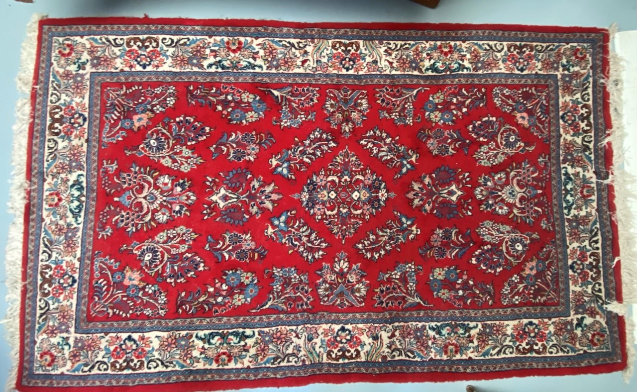- Perse (Baktyar ?). Tapis à fond rouge, médaillon floral dans des gerbes de fleurs, bordure crème de guirlande de fleurs dans des galons. Long. 224 Larg. 136 cm.