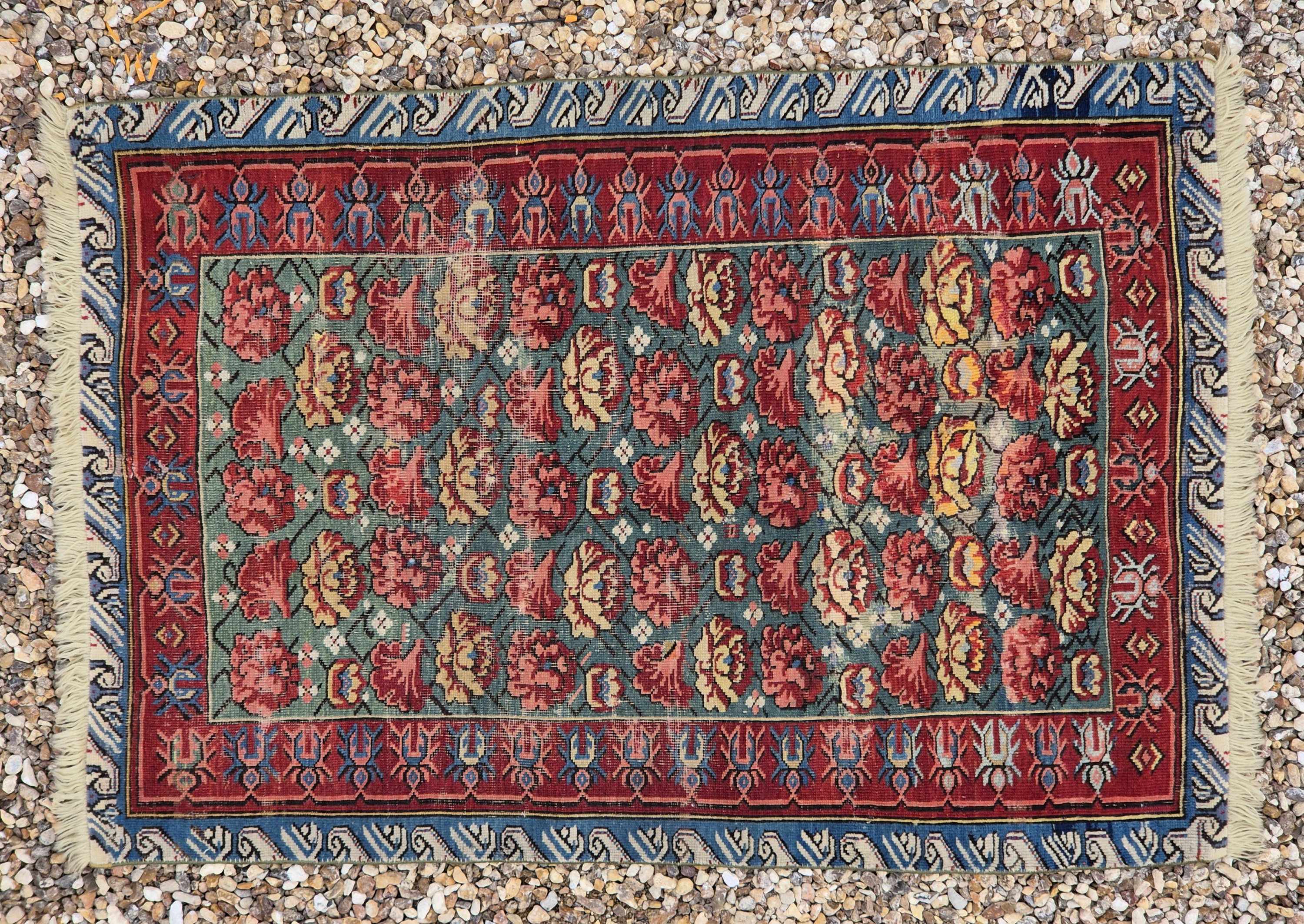 intéressant tapis ancien ou sur un fond vert se détache des roses stylisées rouge et bordure dite « à chien courant ».