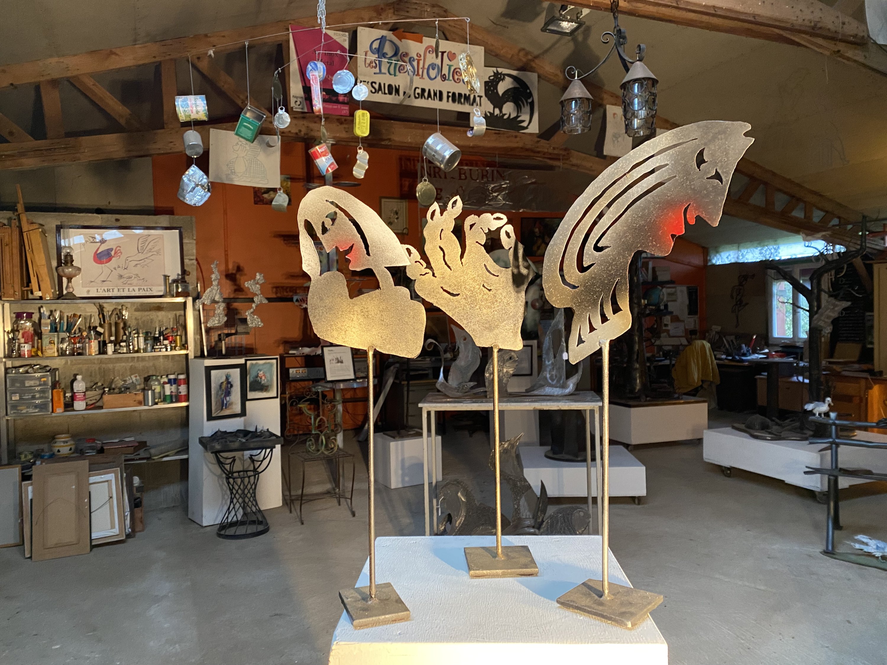 Trois sculptures en acier découpé, dont deux réhaussées.