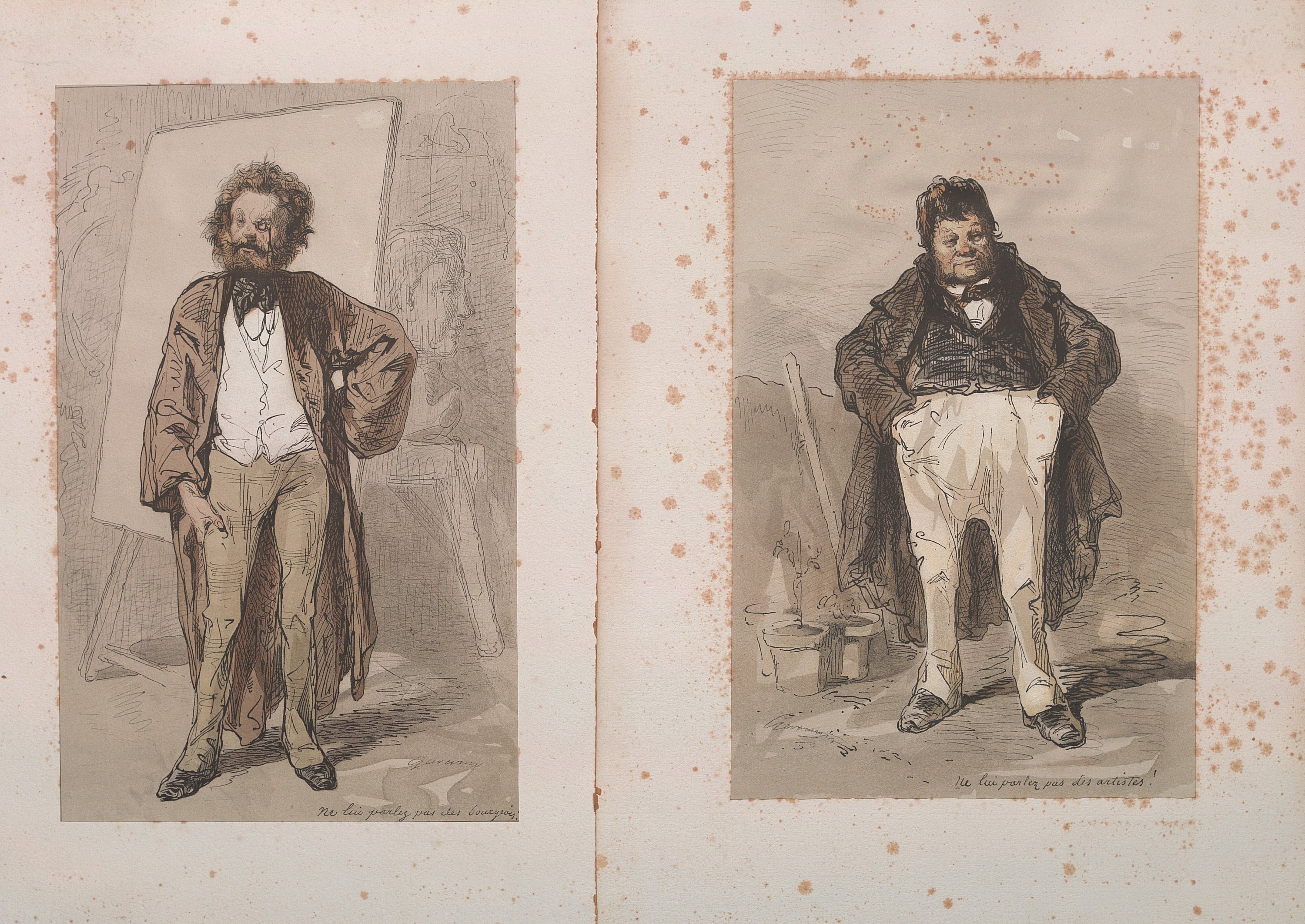 « Ne lui parlez pas des bourgeois » ; « Ne lui parlez pas des artistes ! », chromolithographies contrecollées sur papier fort, 28,5 x 18 cm ;