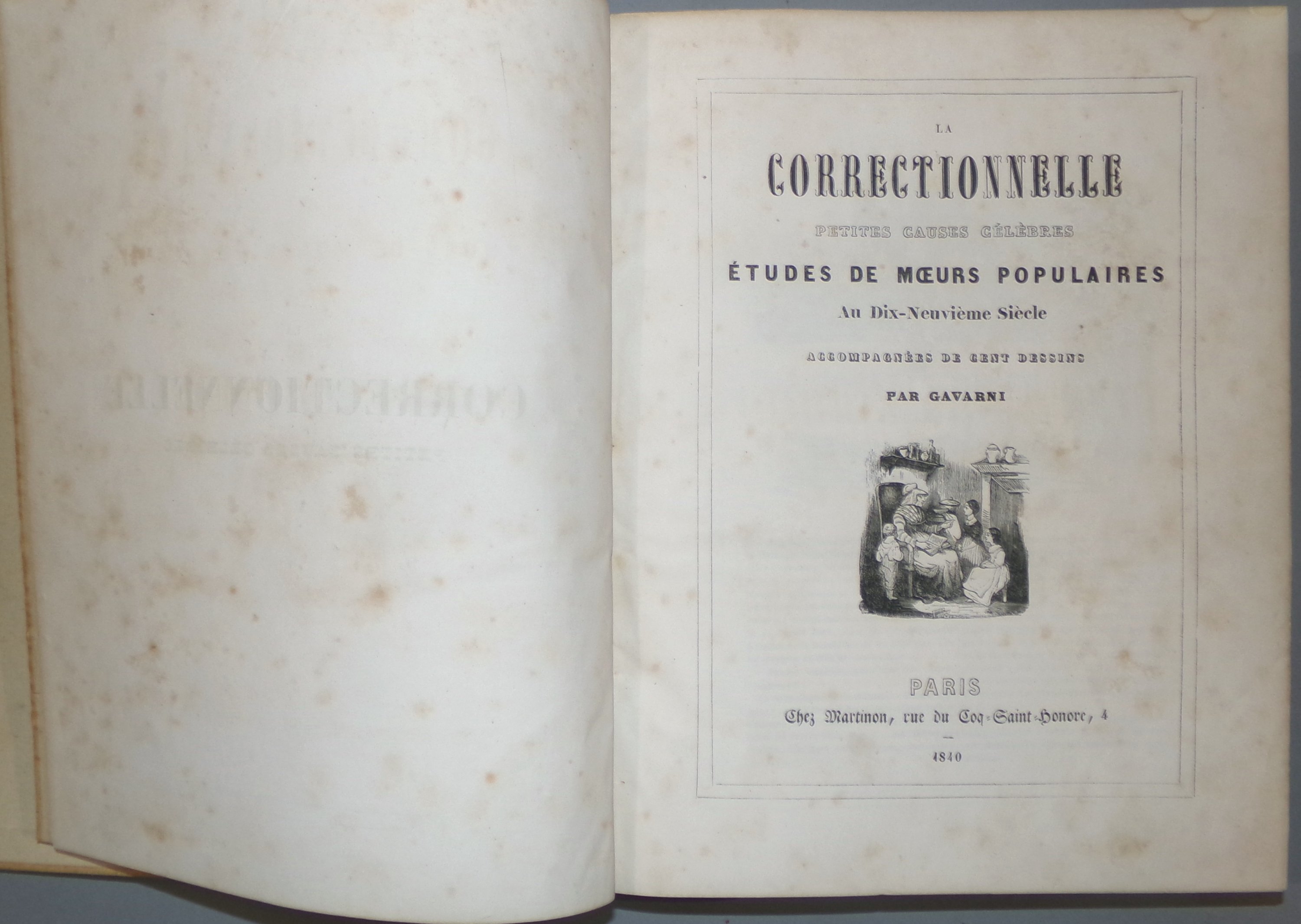 La Correctionnelle. Petites causes célèbres. Etudes de moeurs populaires au XIXème siècle. Paris, Martinon, 1840. In-4, cartonnage imp. de l'éd. (rest.) Ill. des 100 dessins en noir par Gavarni. Bel état (rousseurs éparses).