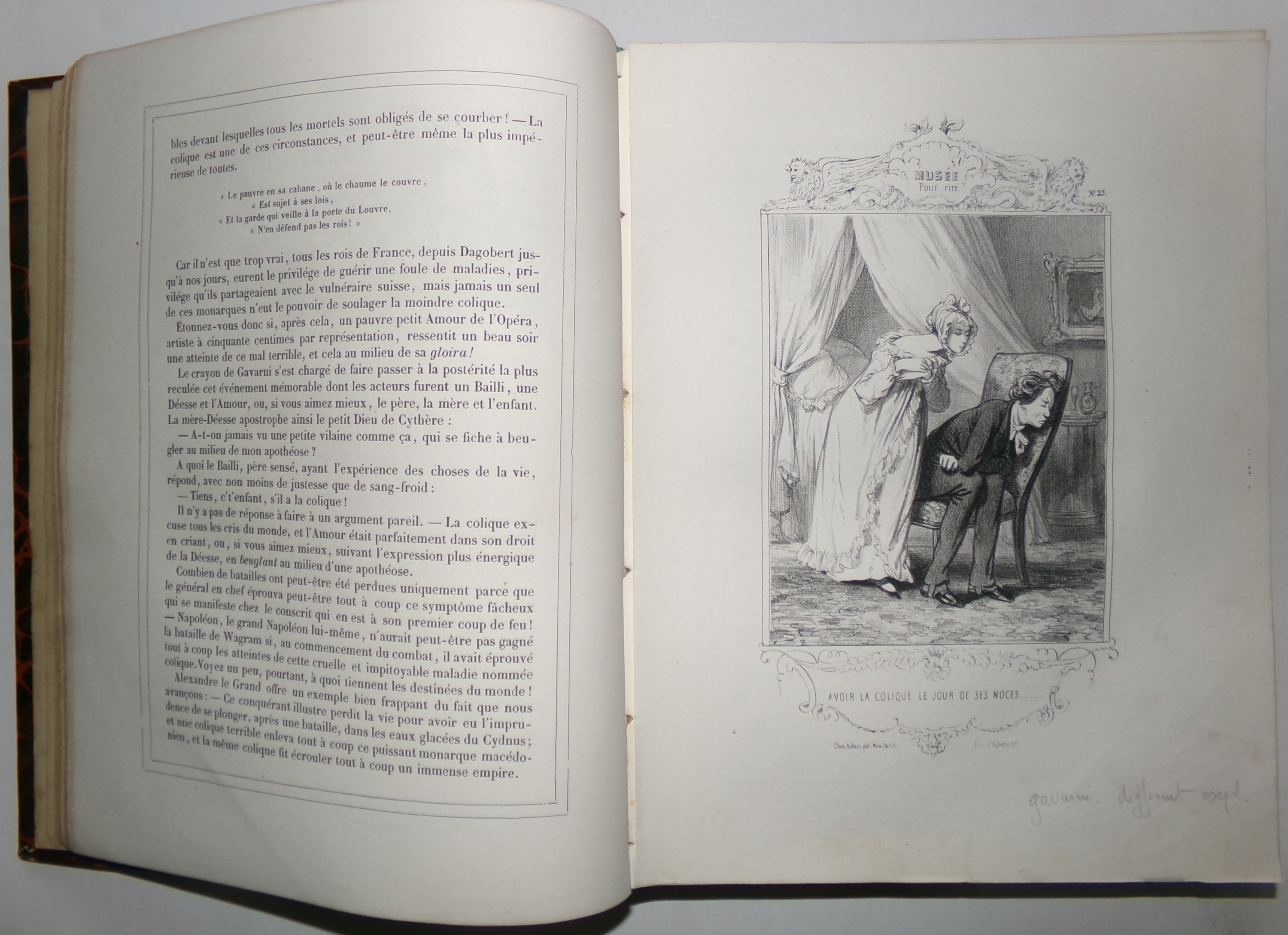 Le Musée pour Rire, Dessins par tous les caricaturistes de Paris. Paris : Aubert, 1839. 2 tomes en 1 vol. rel. in-4. Collection des 100 livraisons de chacune 4 pp. illustrées par Daumier, Gavarni, Bouchot, etc. Sans pages de titre ni tables.