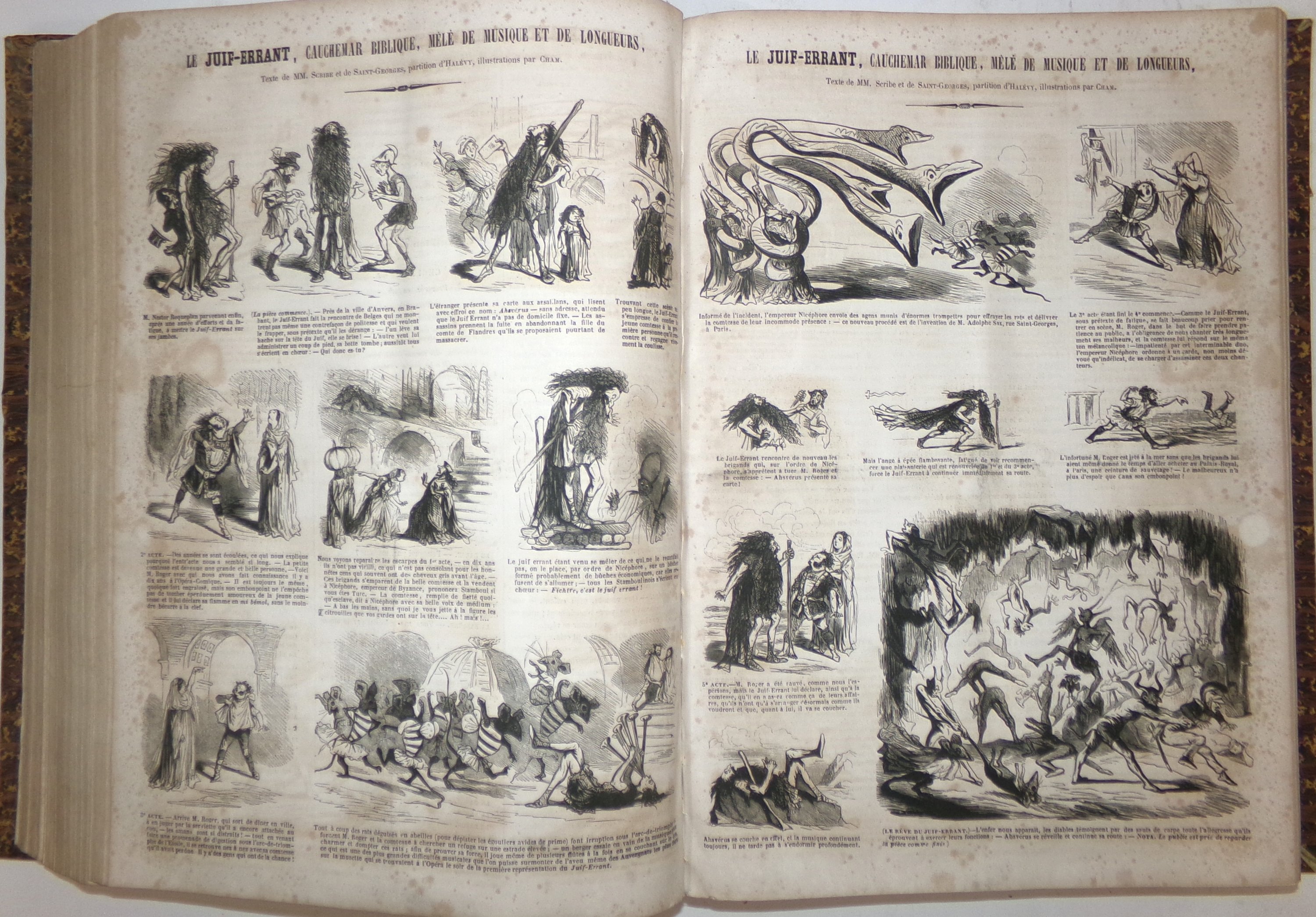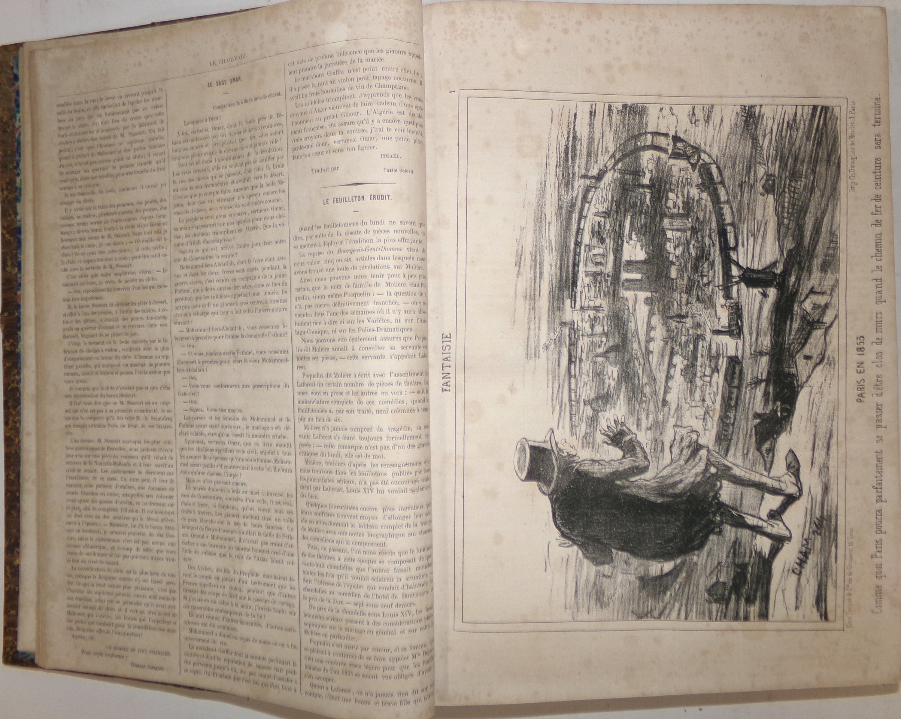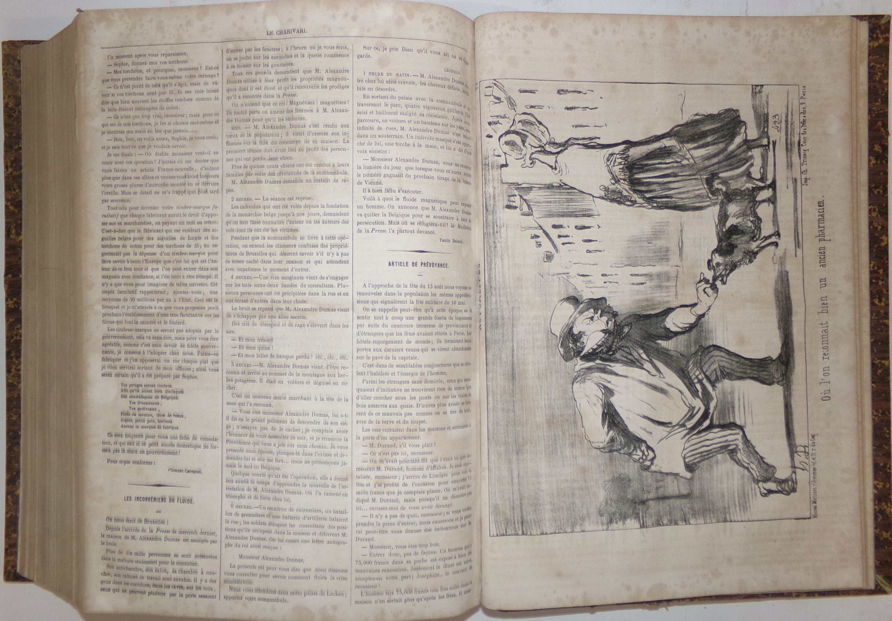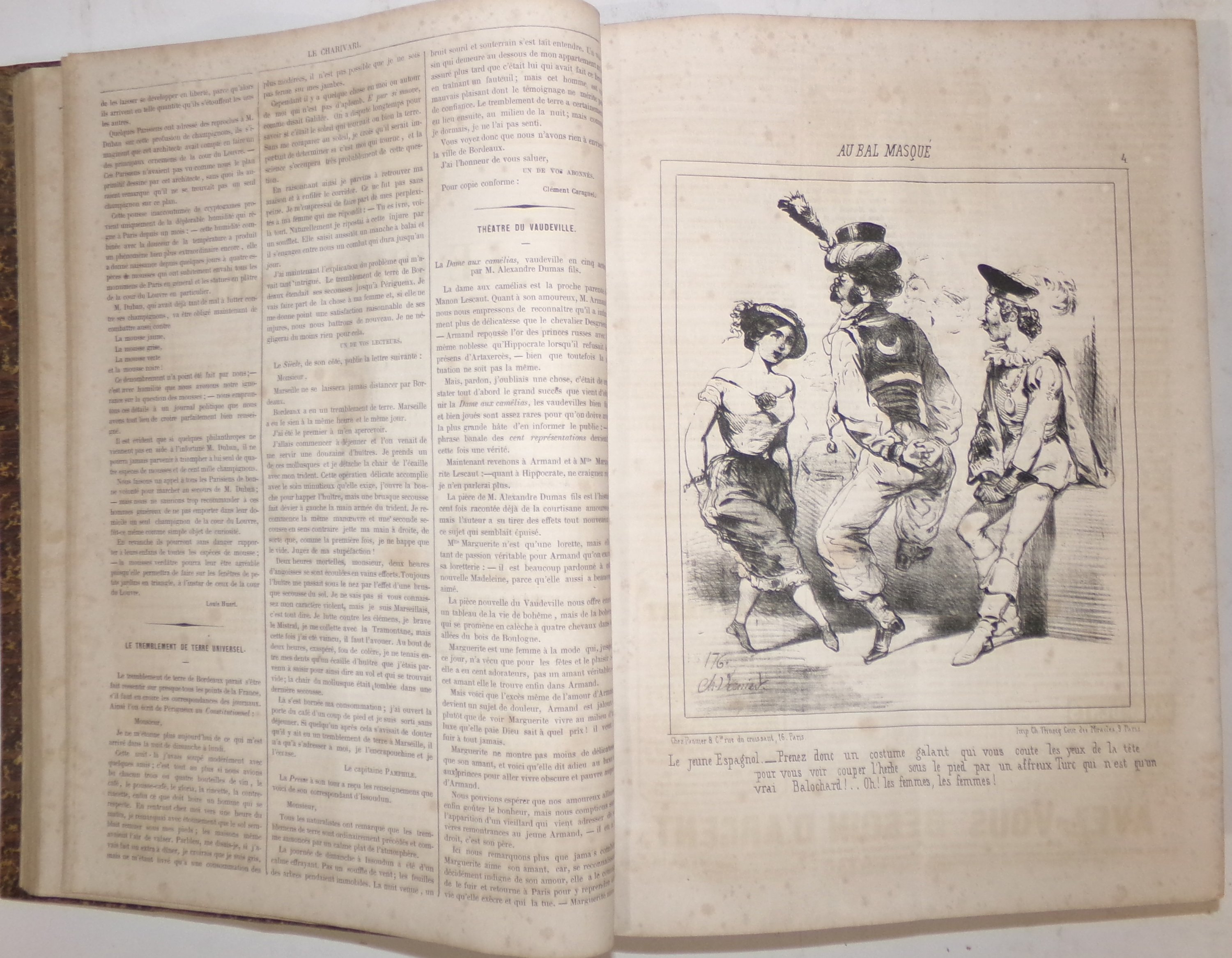 1 vol. rel. in-4 contenant du n°1 (1er janvier 1852) au 244 (31 août 1852) (manque 21, 38, 45) ; nombreuses illustrations de Cham, Vernier et principalement de Daumier sur les thèmes : Enfantillages (1), Les Parisiens en 1852 (11), Scènes parisiennes (3), Physionomies des chemins de fer (10), Croquis musicaux (16), Physionomies du palais de justice (1), Croquis variés (1), Le public du Salon (12), Paris l’été (1), Les bons Parisiens (1), Paris qui boit (6), Paris qui mange (1), Scène de la vie de province (3), Actualités (14), Croquis parisiens (2), Tout ce qu’on voudra (14), Les trains de plaisir (6) (rousseurs, qqs manques marginaux) T.B.E.