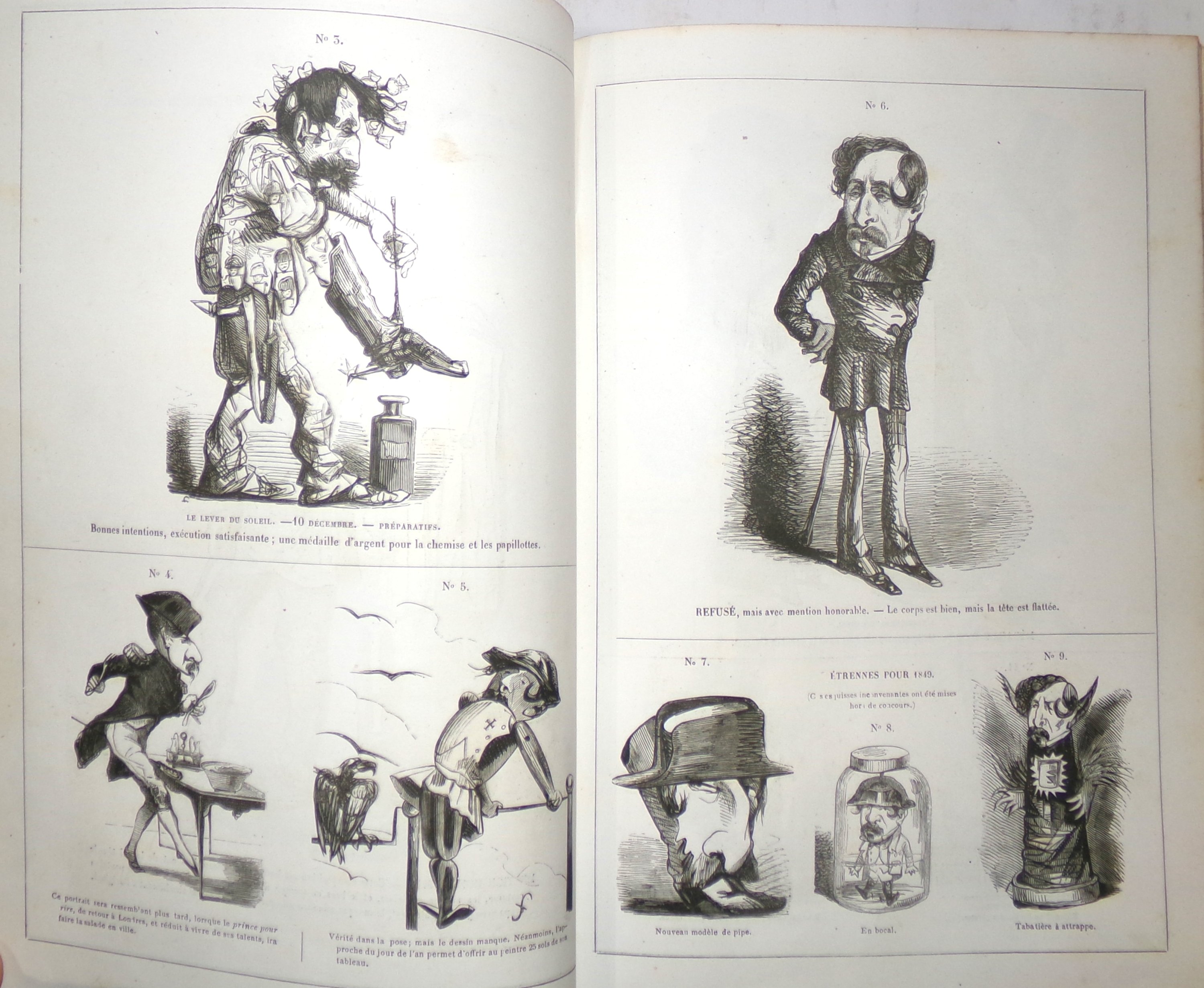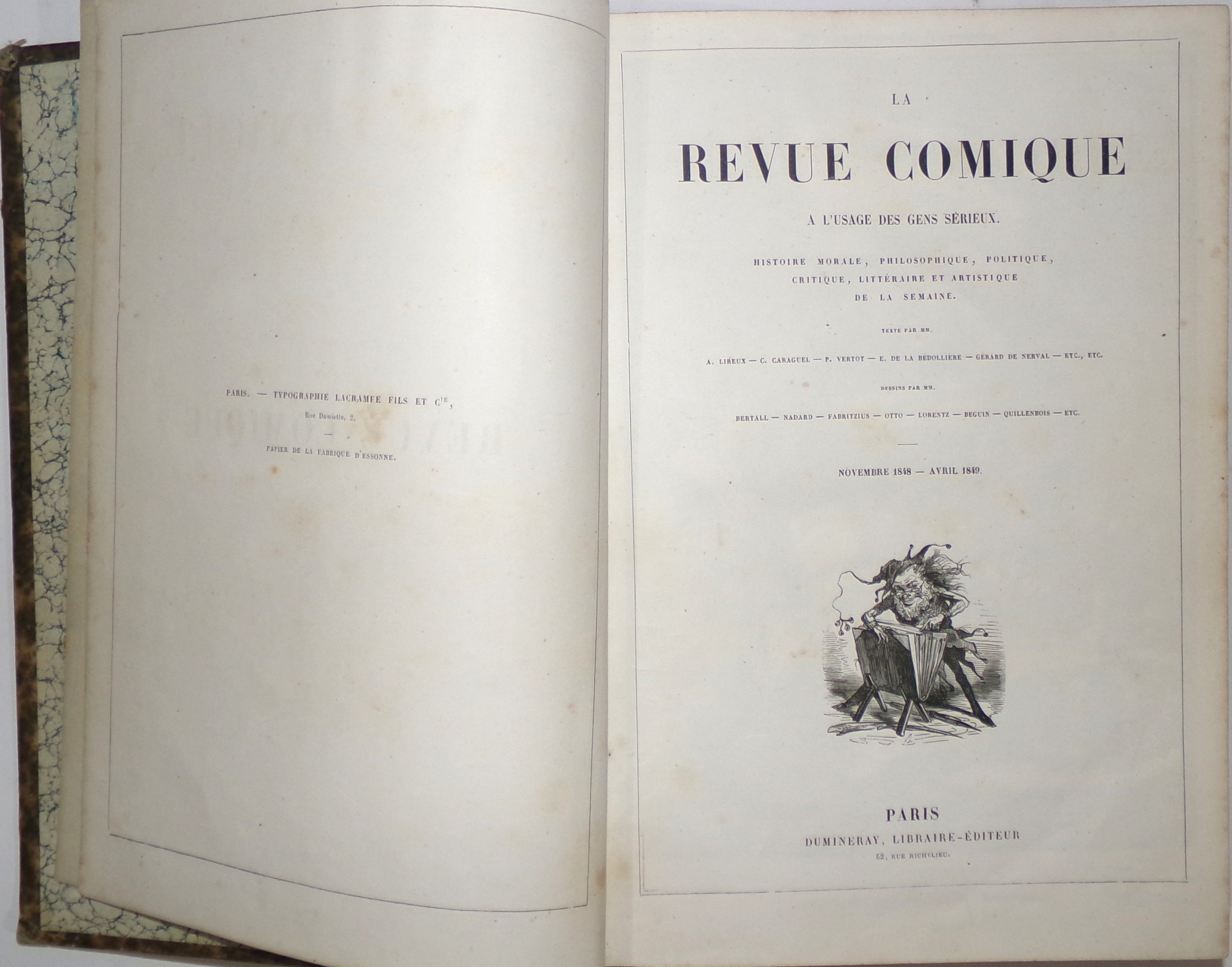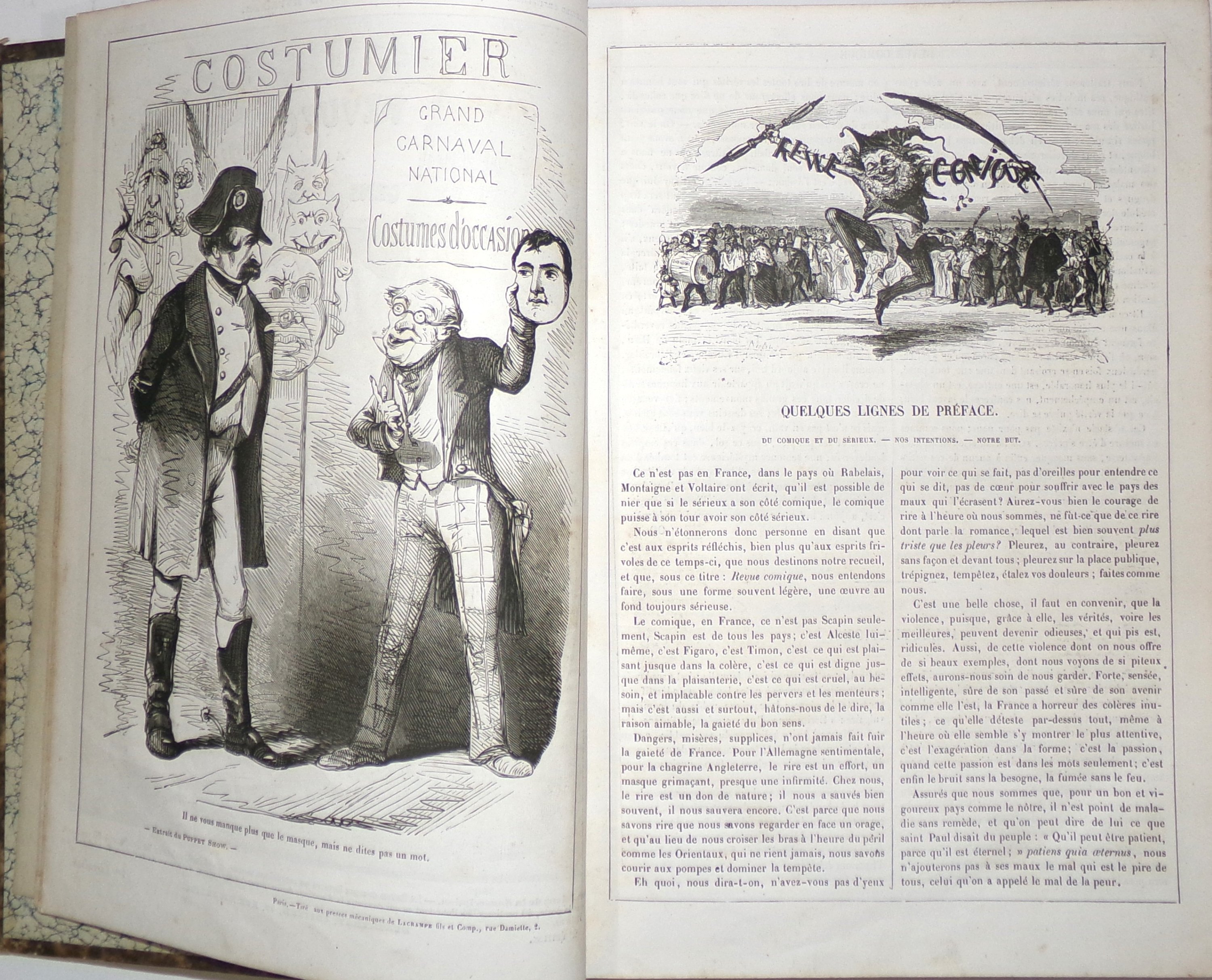 Novembre 1848 à avril 1849 ; mai 1849 à décembre 1849. 2 tomes en 1 vol. in-4 rel. Paris, Dumineray et au bureau de la Revue Comique. Page illustrée de la 1ère livraison, 368 et 188 pp.