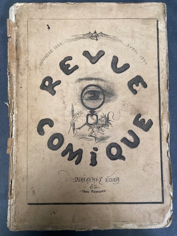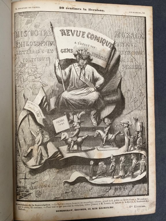 La revue comique à l’usage des gens sérieux, Histoire morale, philosophique, politique, critique, littéraire et artistique de la semaine. Novembre 1848 à avril 1849. 1er tome in-4 rel. Paris, Dumineray et au bureau de la Revue Comique. Page illustrée de la 1ère livraison, 368 pp. Dessins in-texte et h.-t. de Nadar, Achille Béguin, Bertall, Alcide-Joseph Lorentz, Nadar, Otto, Quillenbois, etc. Jules Hetzel créa cette revue pour soutenir la candidature du général Cavaignac contre Louis Napoléon. Elle prit fin sous les coups de la censure. B.E. (couv. en l’état., rousseurs éparses)