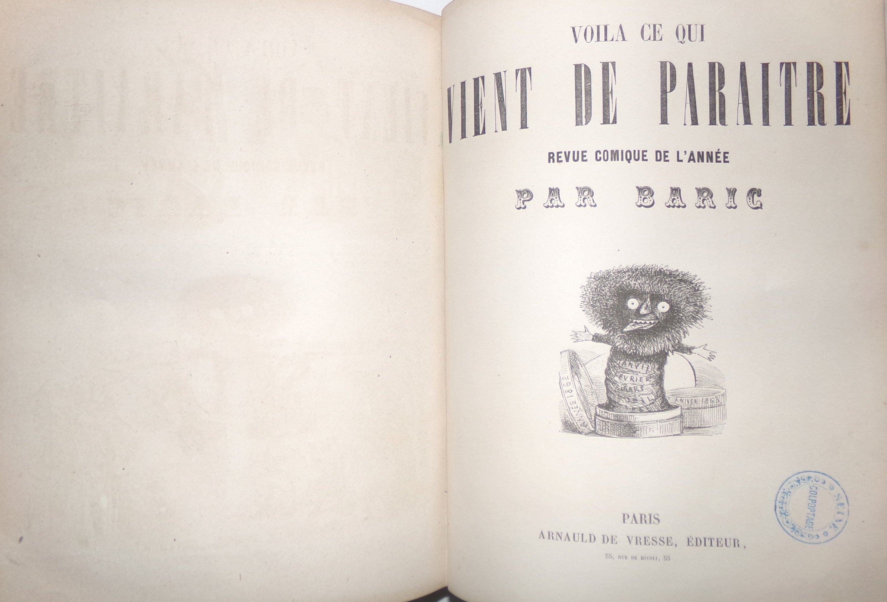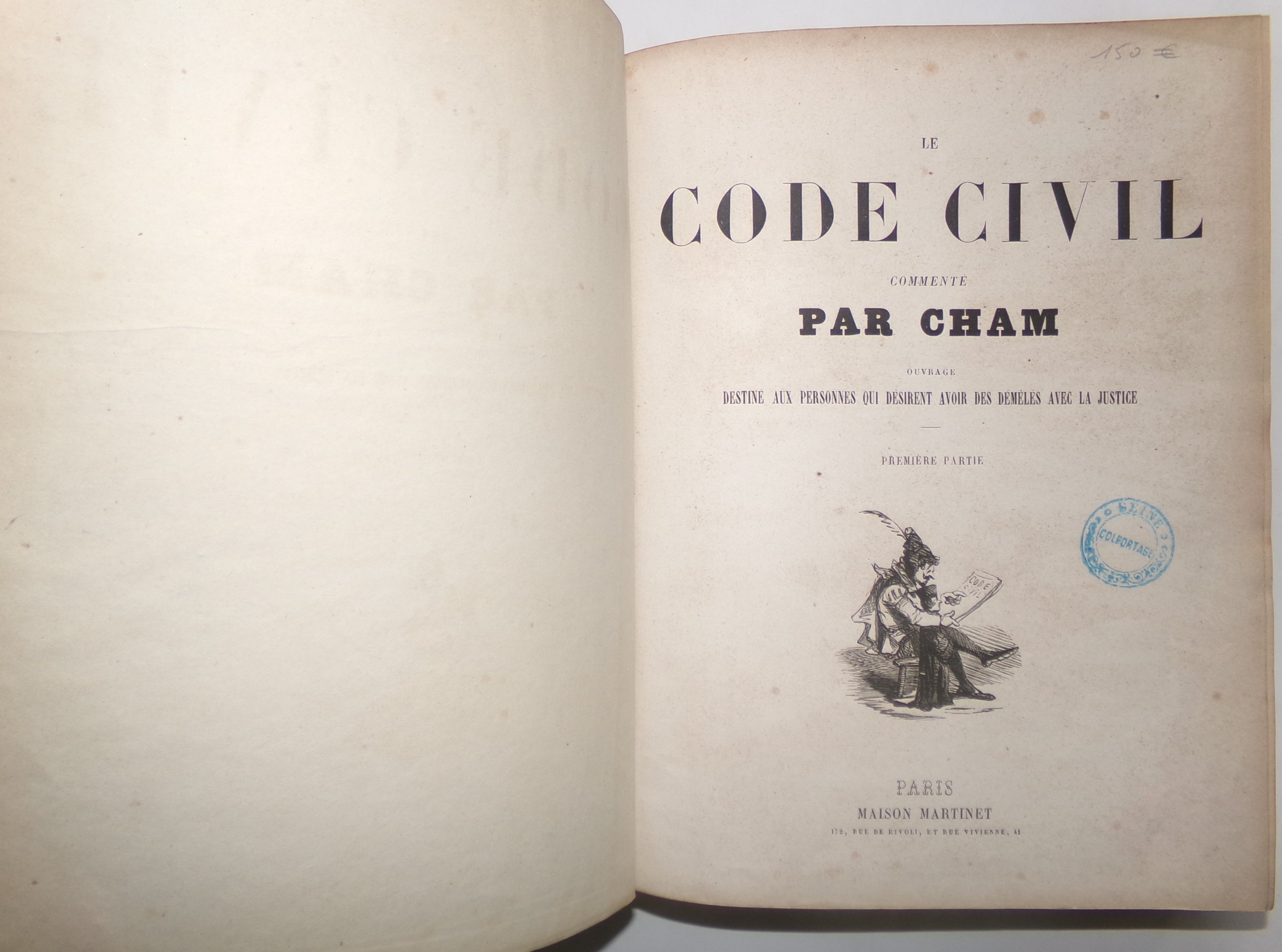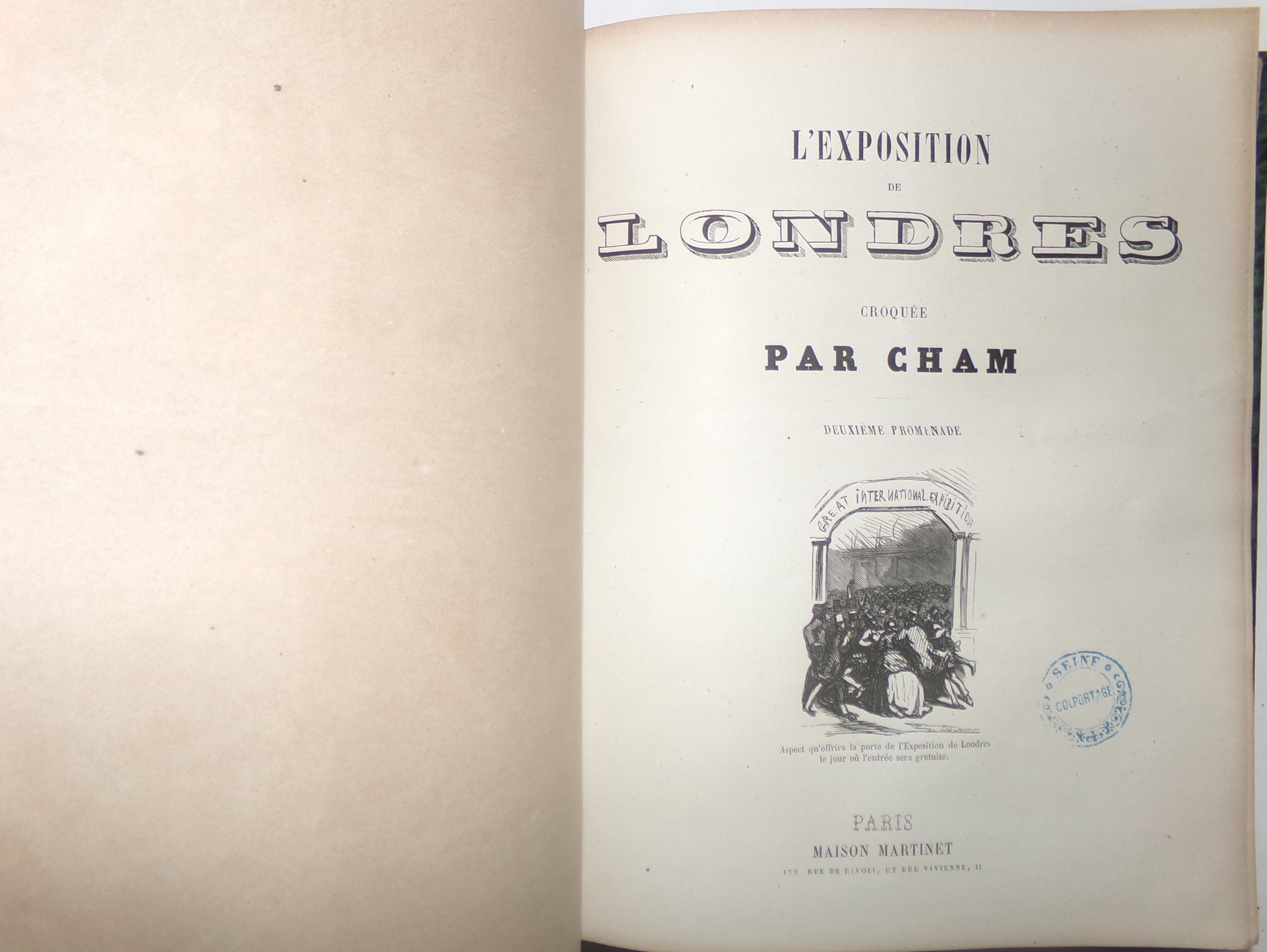 Recueil factice de 15 fascicules imprimés de caricatures en majorité croqués par Cham (14 fasc.) et par Baric (1 fasc.) en 1 vol. rel. ½ basane in-8 : Le code civil commenté par Cham, ouvrage destiné aux personnes qui désirent avoir des démêlés avec la justice (3 parties) ; L’exposition de Londres (2 parties) ; Choses et autres ; Cours de physique ; Au bal de l’Opéra ; La bourse illustrée ; Les jours gras ; Baigneurs et buveurs d’eau ; Pendant la canicule ; Spahis et turcos ; Promenades au jardin d’acclimatation ; Voilà ce qui vient de paraître, revue comique de l’année par Baric. Tampon bleu de colportage de la Seine sur chaque couv., publiés à Paris par la maison Martinet et Arnauld de Vresse, vers 1861-1863 ;
