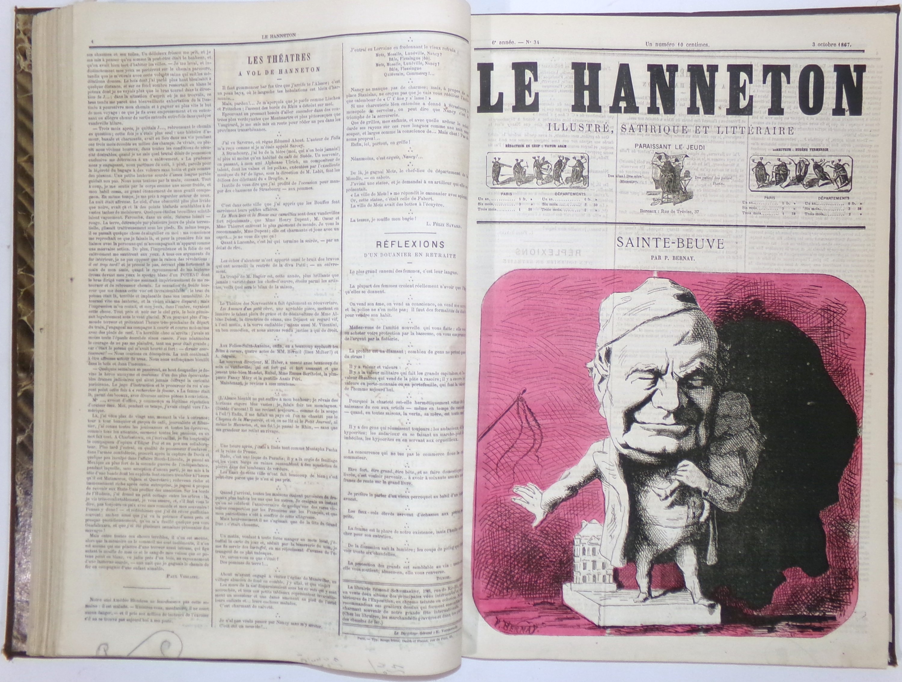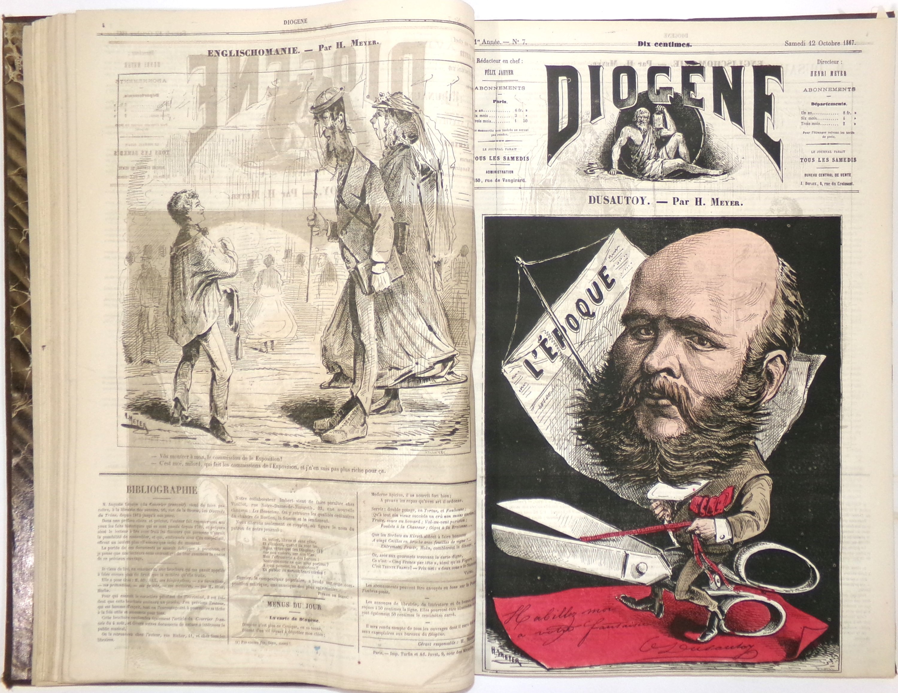 Rare et belle réunion de journaux satiriques illustrés parisiens et provinciaux, en 7 vol. rel. in-fol. plein percaline, 1865-1868, ayant pour titre en lettres dorées « Charges et actualités - G.R. »