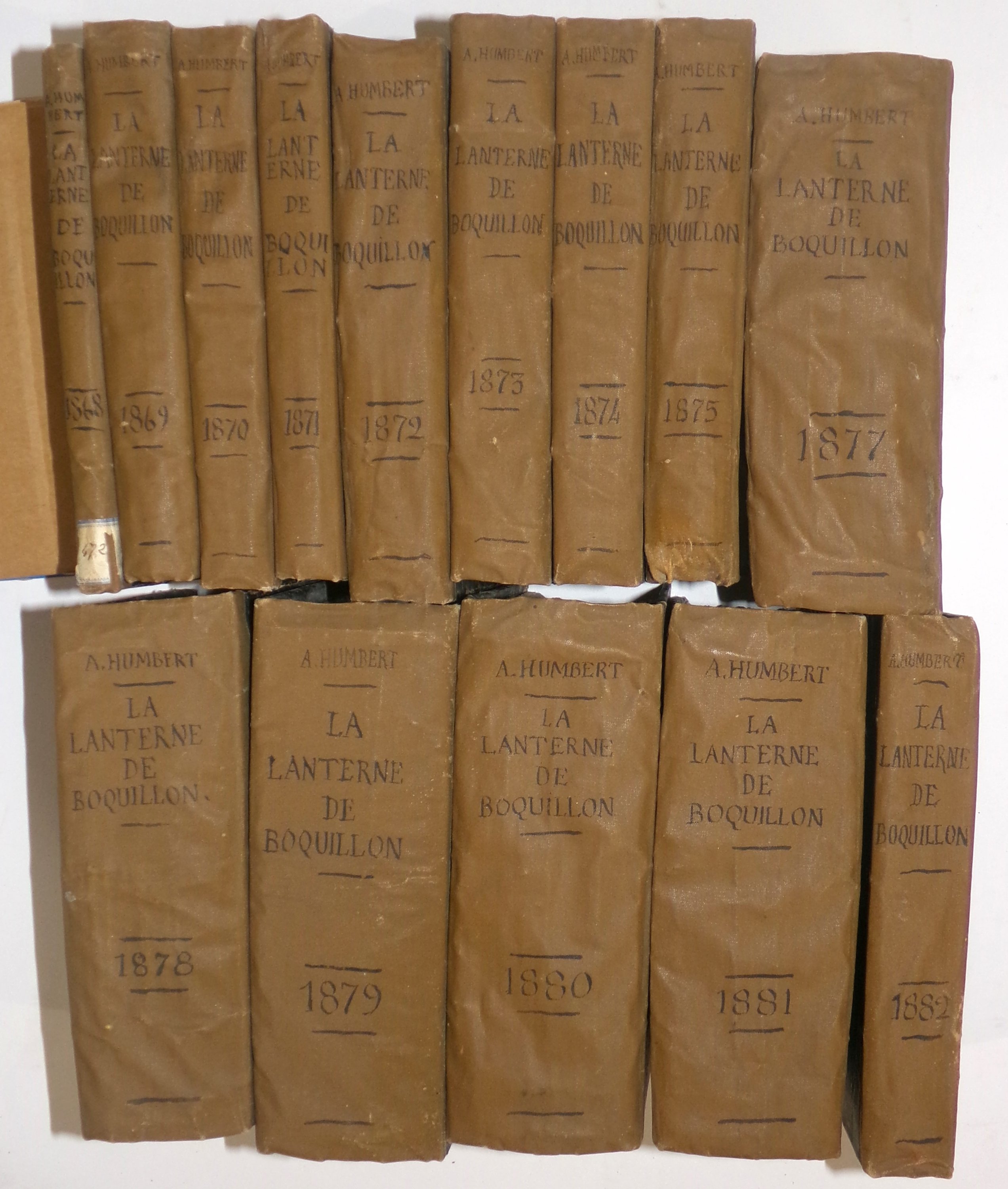 Joint : 24 numéros dépareillés en double ; 3 vol. rel. ½ chagrin in-12 La Lanterne d’Henri Rochefort, 1869 (n°33 au n°49) ; 10 numéros « Les Guêpes », broch. in-12, 1840-1841, revue satirique fondée et écrite par le romancier et journaliste Alphonse Karr.