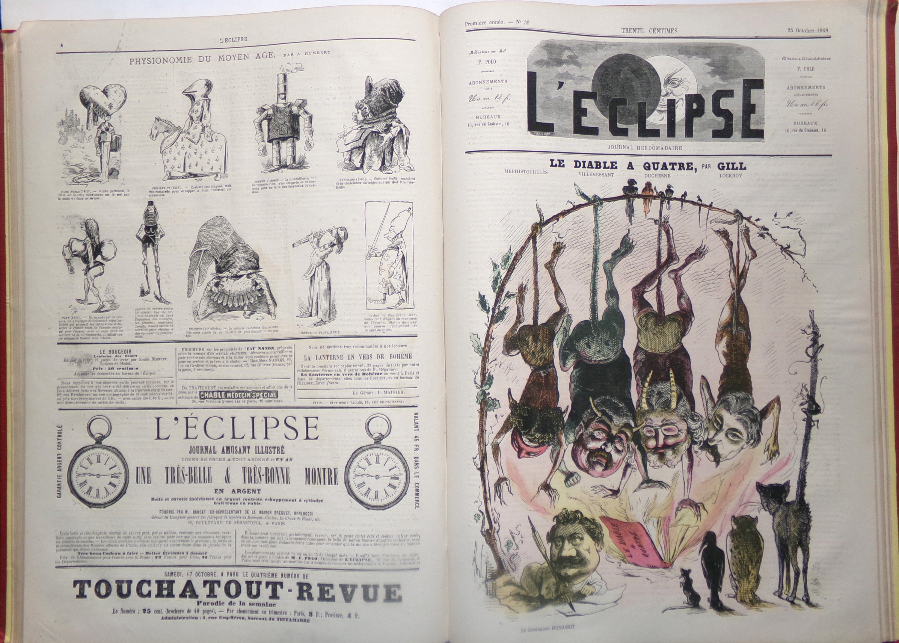 Dirigée par François Polo, « L’Eclipse » forme la continuation de « La Lune », interdit par la censure en décembre 1867. La boutade « La Lune devra subir une éclipse » détermine le nom du successeur de « La Lune » : « L’Eclipse ». Le premier numéro paraît le 26 janvier 1868. Illustré essentiellement par André Gill, « L’Eclipse » connut de nombreuses censures et interdictions de publication : du 4 octobre 1868 au 14 août 1870, l’administration n’interdit pas moins de 22 numéros de l’Eclipse. Cette censure réagissait souvent au dernier moment, si bien qu’il fallait composer une nouvelle caricature dans la hâte. Les exemplaires recomposés portent en général le numéro du fascicule suivi de la lettre « b » pour bis. Les caricatures touchaient aussi bien des personnages de la vie politique que ceux de la vie artistique et littéraire. En 1876, deux ans après la mort de François Polo, la vente du journal s’essoufflant, il fut décidé d’en réduire le format. Gill n’y trouvant pas son compte et rêvant de grandes compositions, commença une nouvelle aventure avec « La Lune rousse » dont le premier numéro parut le 10 décembre 1876.