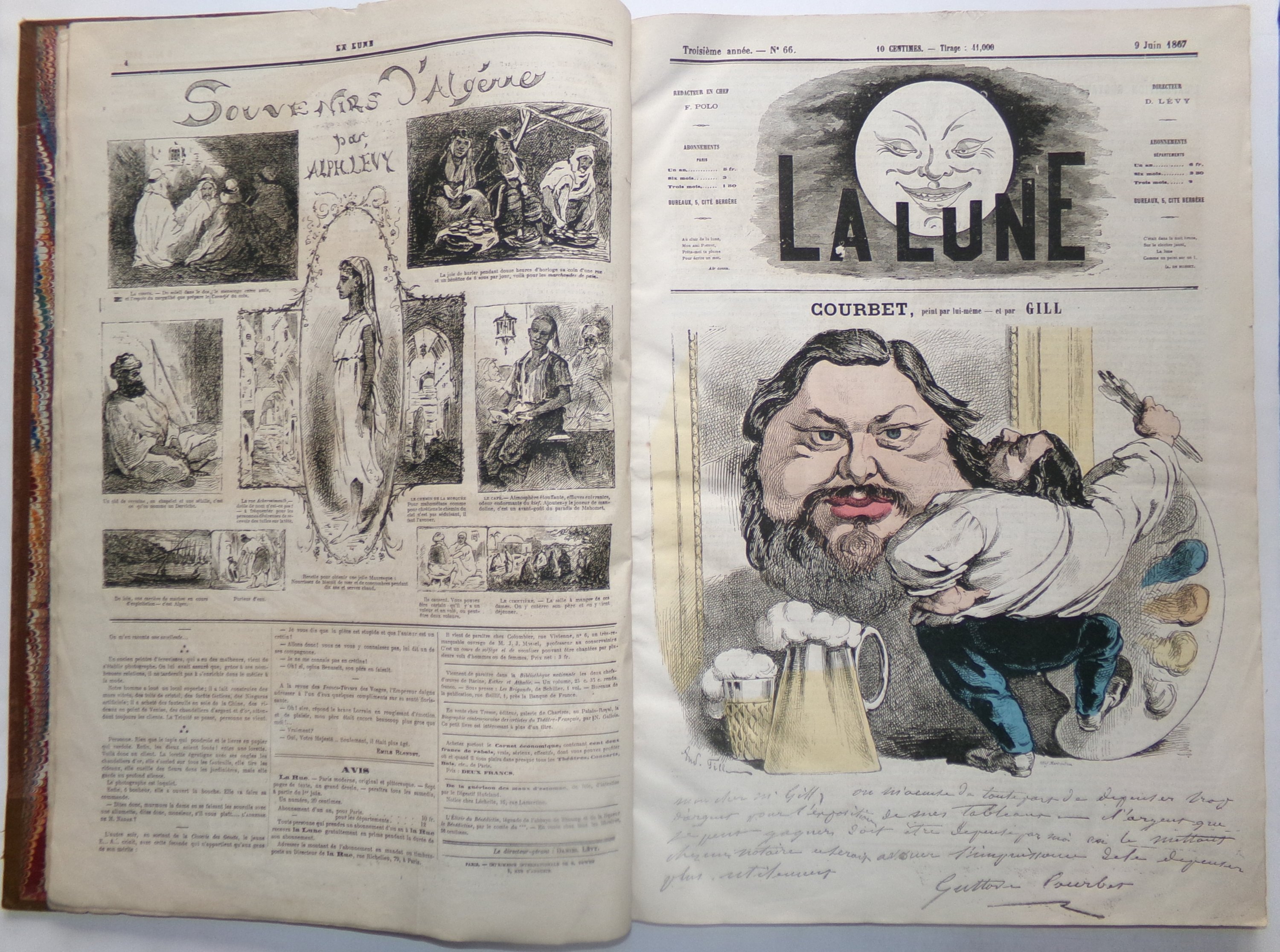 1 vol. in-fol. rel. ½ chagrin contenant La Lune, n°64 (26 mai 1867) au n°97 (10 janvier 1868), L’Eclipse, n°1 (26 janvier 1868) au n°35 (20 sept. 1868). T.B.E.