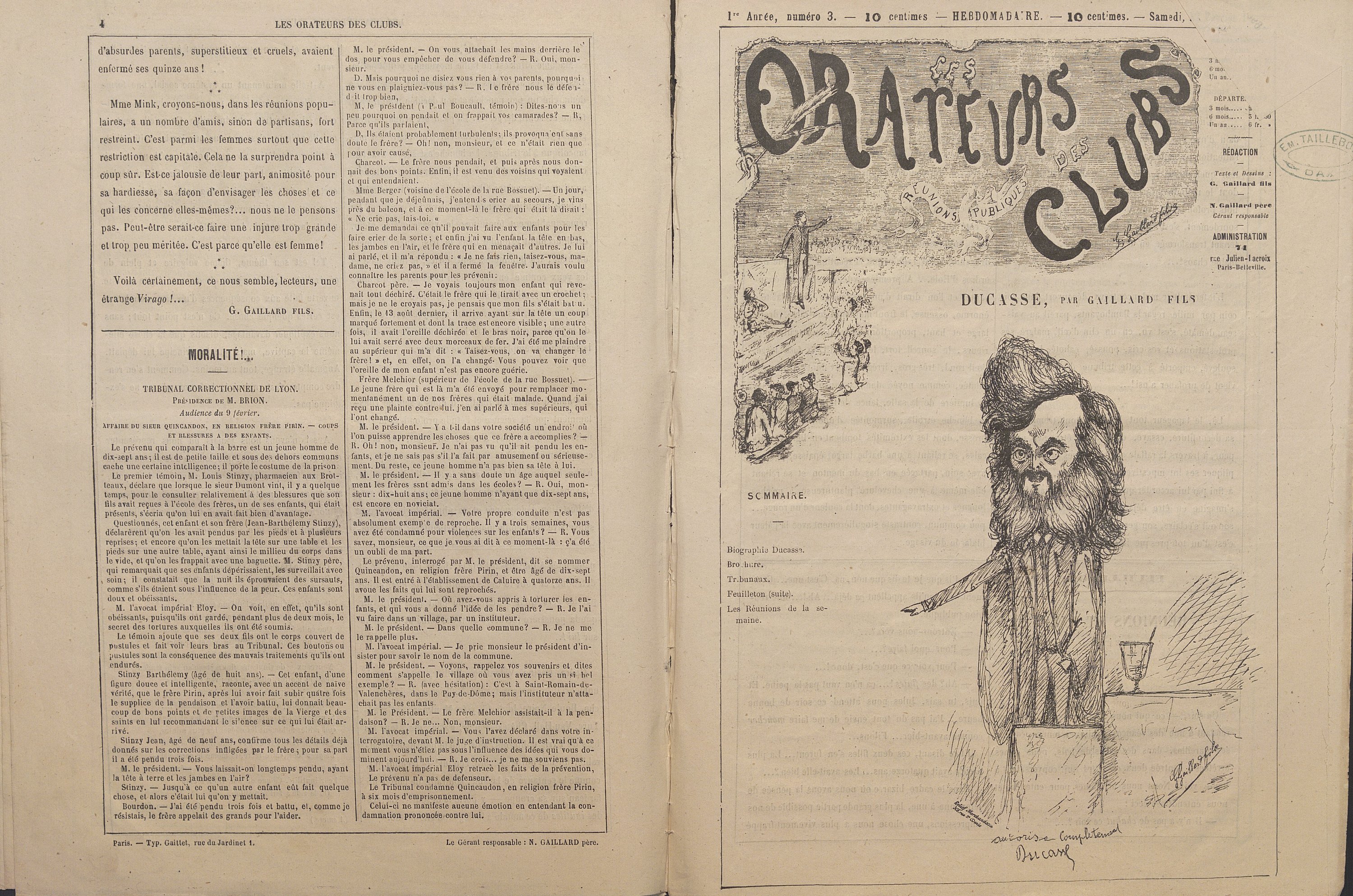 Rarissime hebdomadaire éphémère fondé par Napoléon Gaillard (1815-1900), néo-babouviste, propagandiste de la libre-pensée et de l’athéisme auquel collabore son fils Gustave, ayant pour objectif de faire connaître les orateurs révolutionnaires les plus populaires qui animaient les « clubs rouges. »
