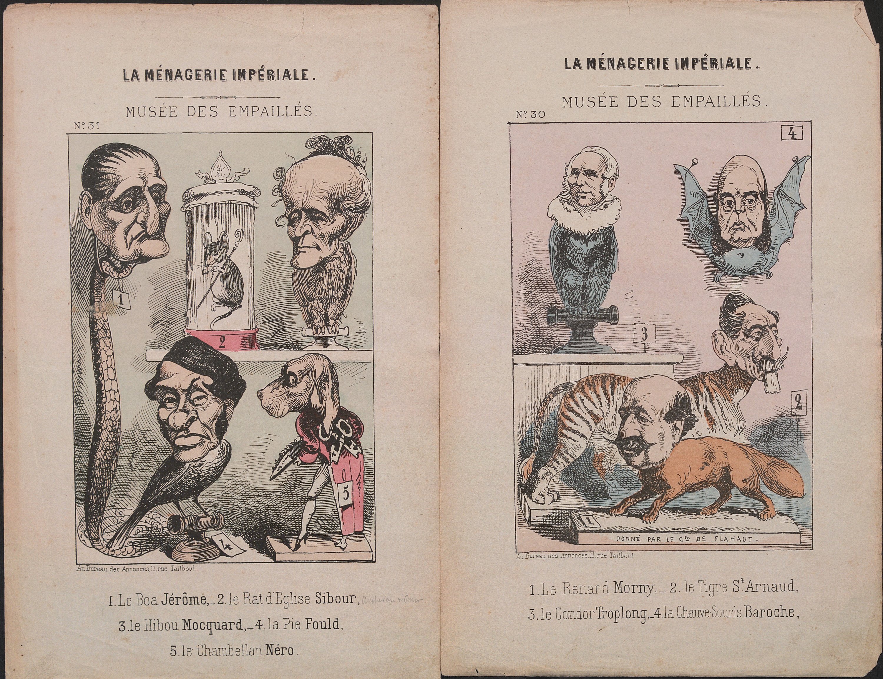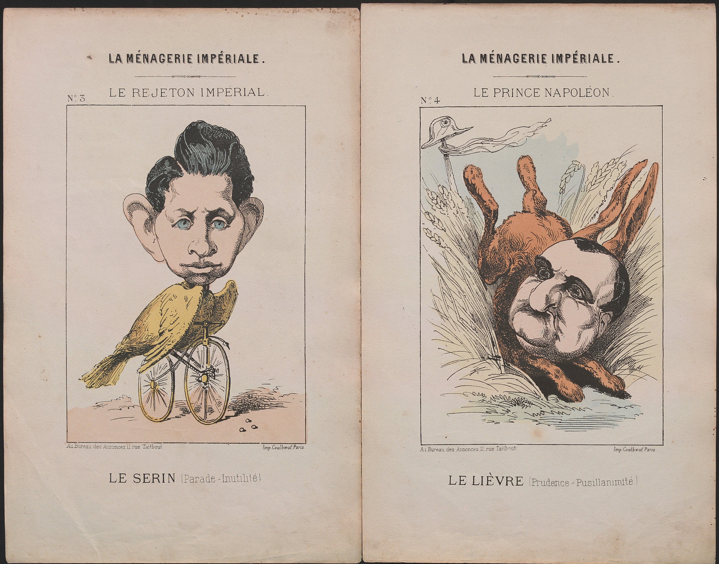Recueil complet des caricatures de la famille impériale et des principaux dignitaires du Second Empire représentés sous des traits d’animaux. Ajouts de notes manuscrites au crayon précisant l’identité ou la fonction des personnages représentés.