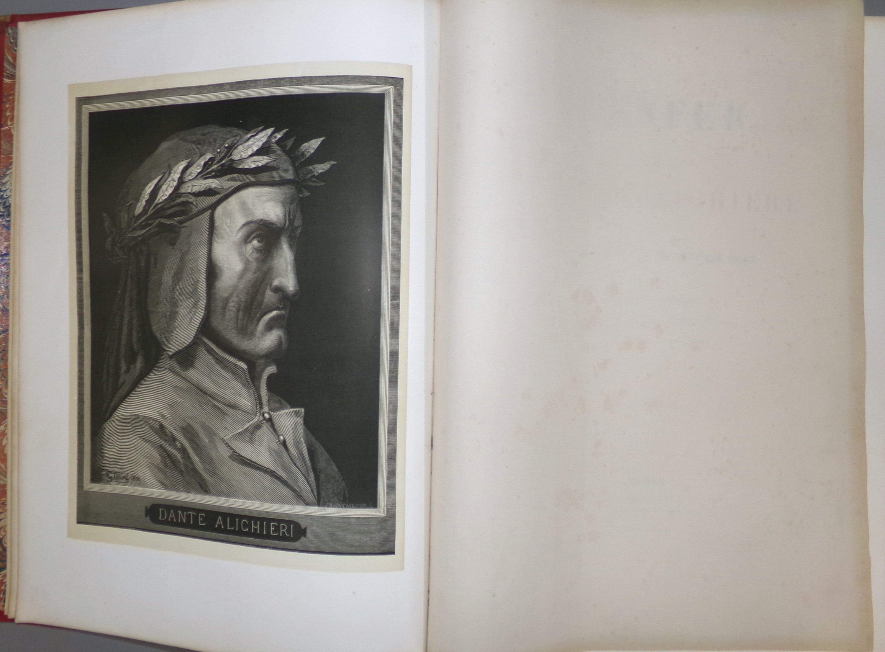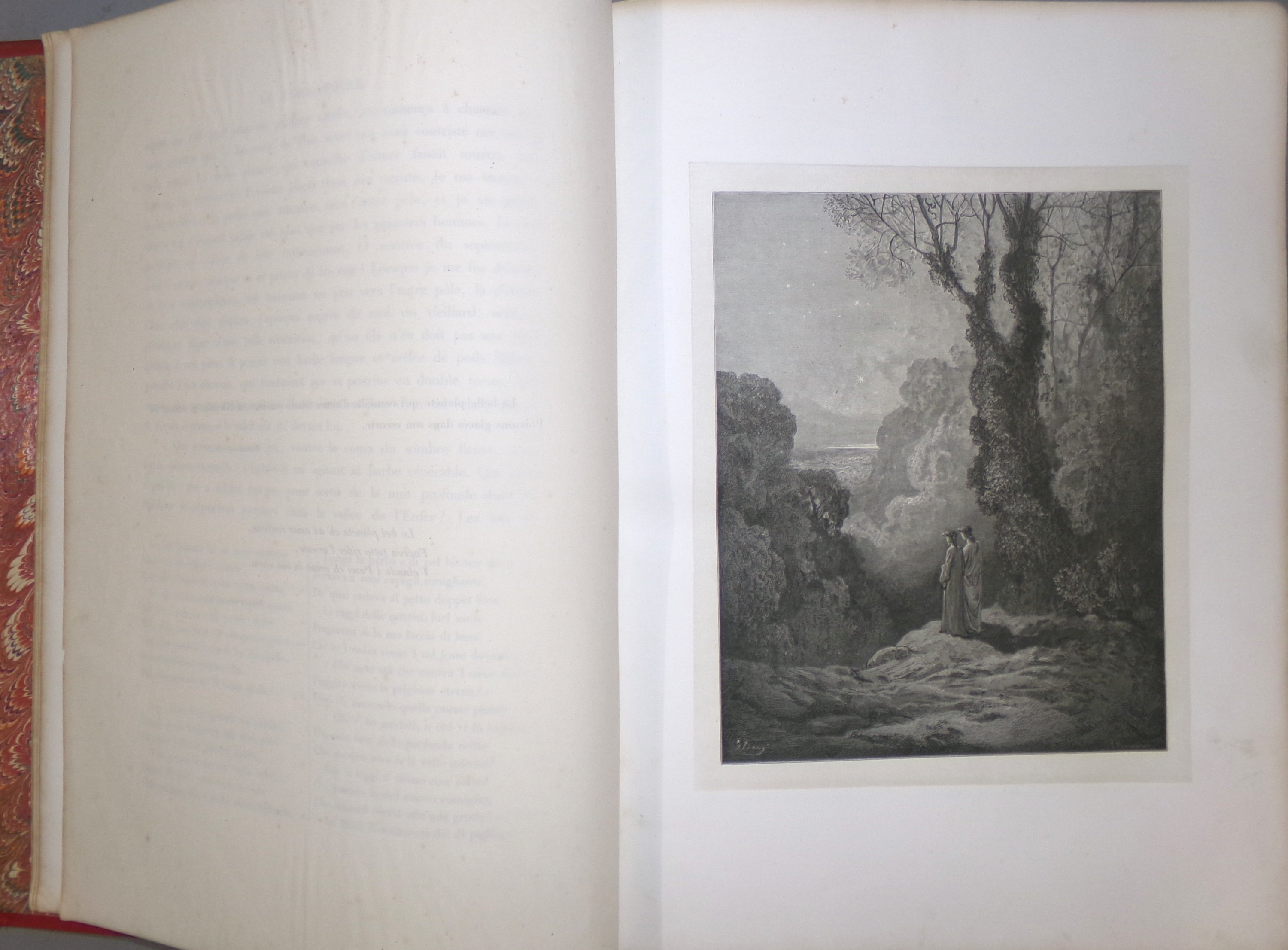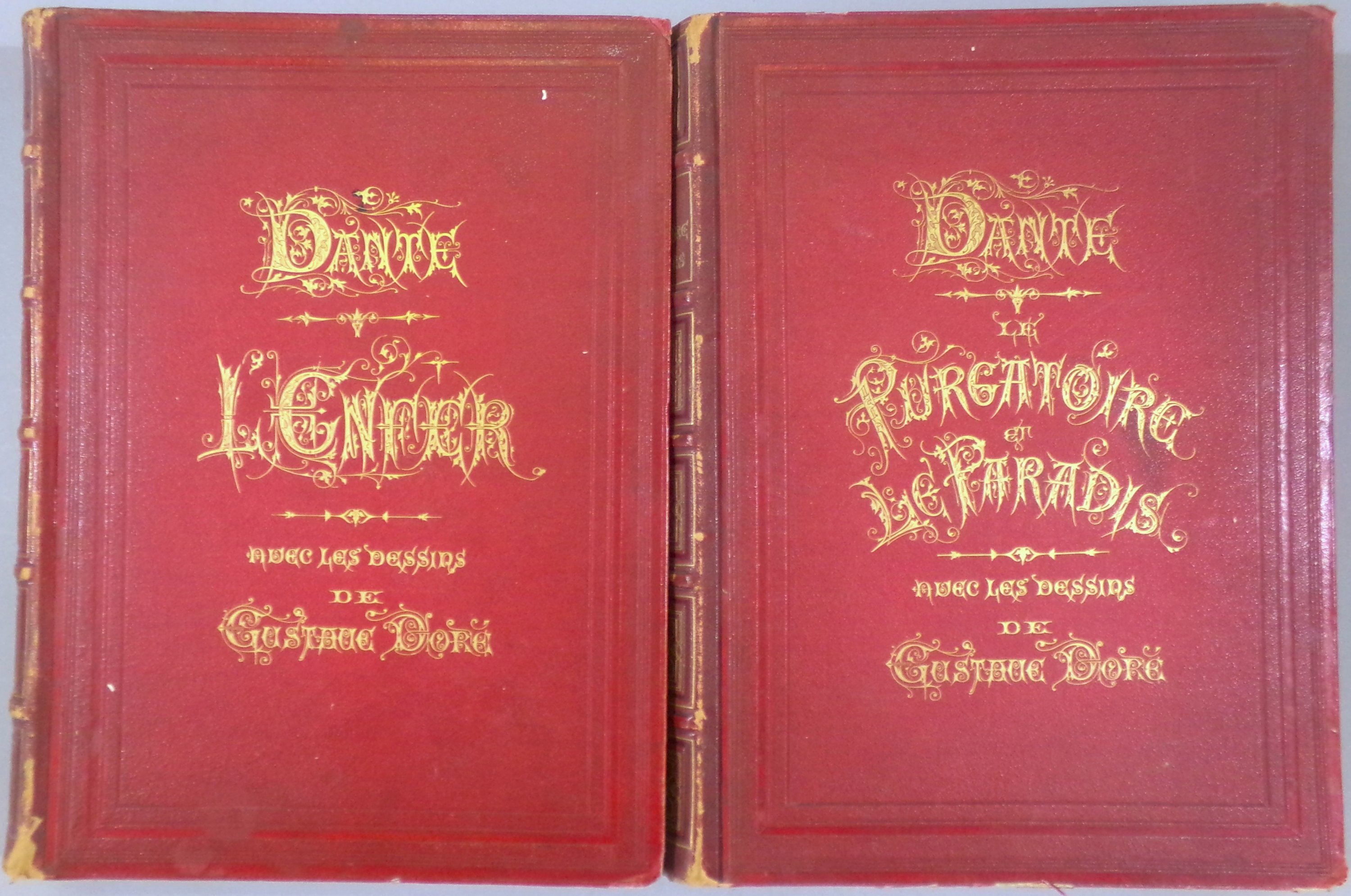 Dante. L'Enfer et Le Purgatoire, Le Paradis. Avec les dessins de Gustave Doré. Traduction française de Pier-Angelo Fiorentino accompagnée du texte italien. 2 vol. in-fol. percaline rouge couv. éditeur. Paris, Hachette, 1872. Edition illustrée de la Divine Comédie. Contient un portrait et 135 planches hors-texte gravées sur bois de Gustave Doré (mque pl. 2 L’Enfer, pl. 14 Le Purgatoire)