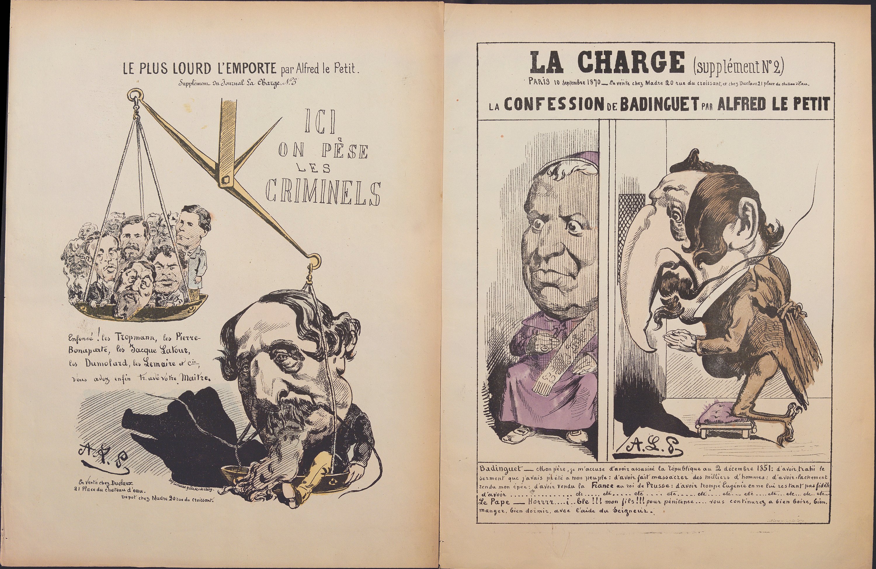 Série « Album de la Charge, caricatures publiées depuis le 4 septembre » : page de titre, n°1 (3 ex.), 2 (2 ex.), n°3, 4, 5, 6, 7, 8 (2 ex.), 9, 10 et 11, env. 36 x 28 cm ;