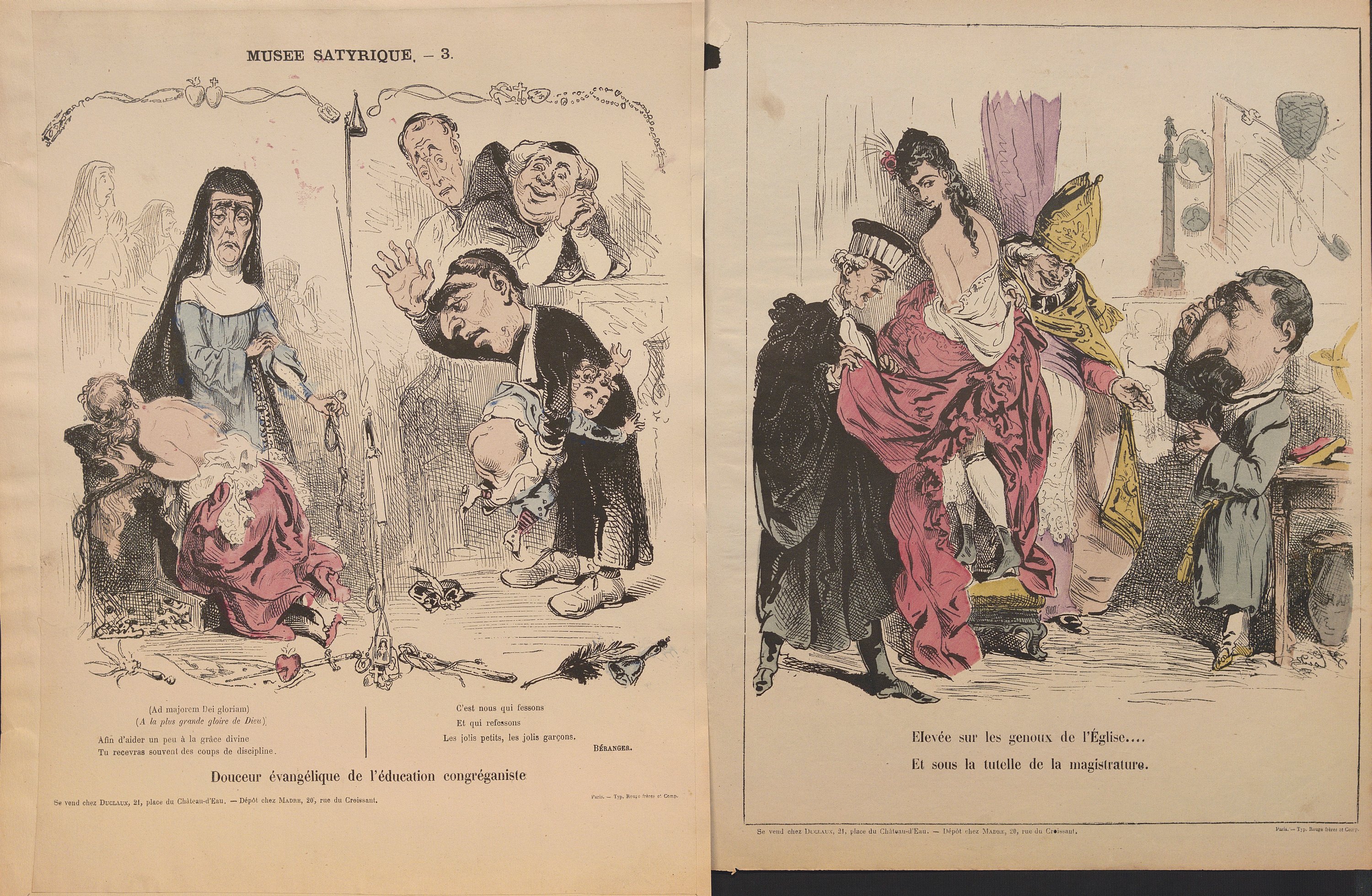 Série du Musée satirique : Elevées sur les genoux de l’Eglise , 34,5 x 26 cm (petite déchirure), n°2 L’Armistice, 26 x 34,5 cm (marge courte), n°3 Douceur évangélique de l’éducation congréganiste, 34 x 25 cm, contrecollé sur feuillet épais ; n°4 Deux journaux trop bien renseignés, 27,5 x 35 cm, contrecollé sur feuillet (plis), n° 5 Ho ! Franc Picard, 35 x 26 cm (petite déchirure, plis) ; La popote des deux très chers cousins, 23,5 x 31 cm (rousseurs) ; Nos ravitaillements, 32 x 23 cm (rouss.) ; La plus petite trouée , 32 x 23 cm (rouss.) ; Les Prétendants zut !, 23,5 x 32 cm ; Nos braves gardiens de la Paix , 32 x 23 cm (rouss.) ; Papa Guillaume à son Augusta, 32,5 x 21,5 cm ; Krupp et son cas non prévu, 32 x 23,5 cm (rouss.) ; Leur tient-il la dragée haute !!, 32 x 23,5 cm ; Les pamphlets illustrés n°2 Les secrets dévoilés du cabinet noir, 4 pp. 34 x 26,5 cm (plis).