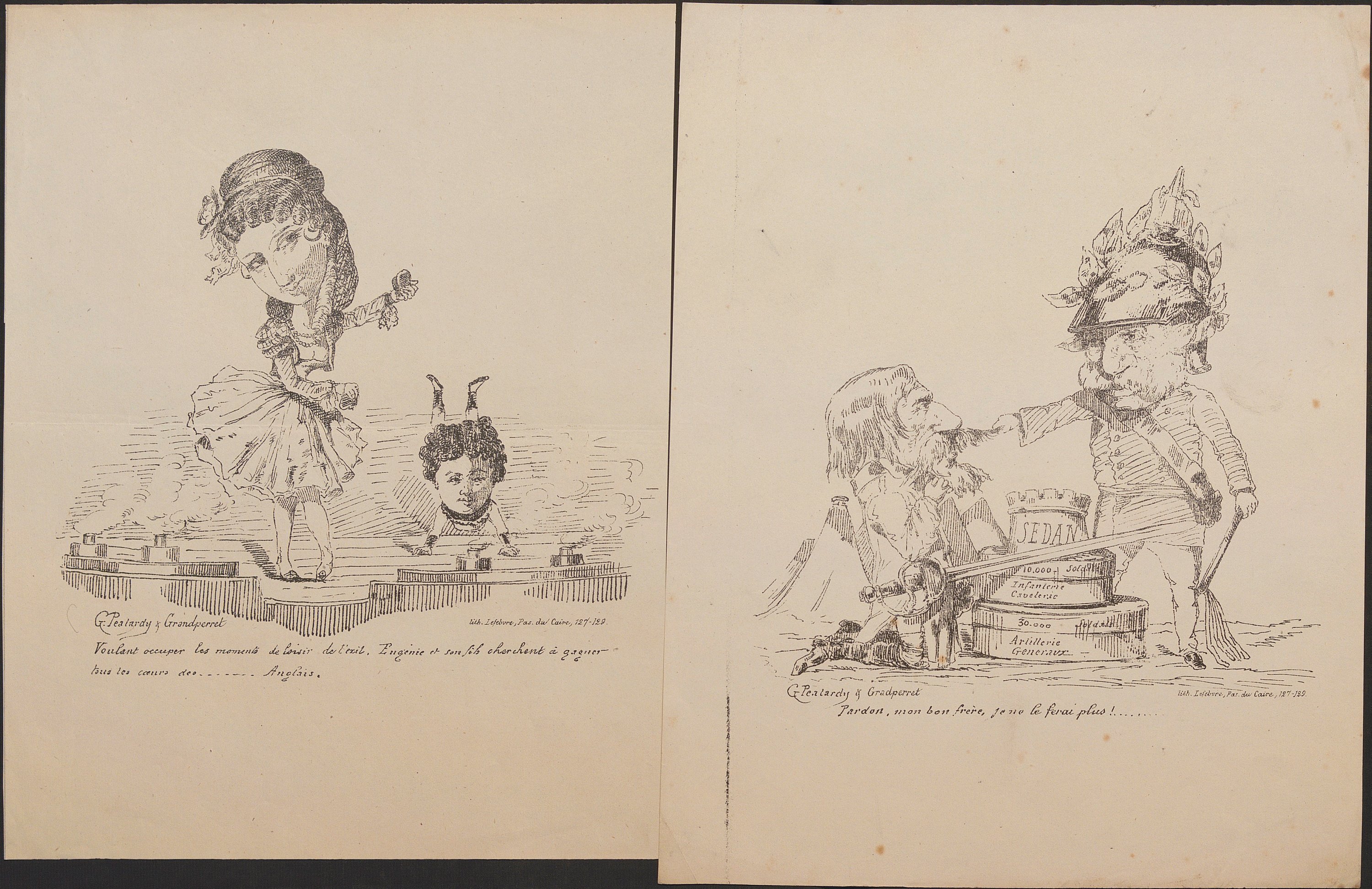 10 pl. en N&B édité par Lefebvre, dont 2 pl. non référencées par Berleux : Partit en guerre contre les ennemis, 17,5 x 26 cm ; Allons ! Rouher bon courage !..., 28,5 x 22,5 cm ; Le coup de balai du 4 septembre 1870 !, 18,5 x 25,5 cm ; Allons ! mon Louis Adieu !..., 15,5 x 27 cm (petite déchirure en marge) ; Voulant occuper les moments de loisir de l’exil , 27 x 21 cm ; Dans une tour obscure , 28,5 x 22,5 cm ; Un laisser pour compte !, 22 x 28,5 cm (petite déchirure) ; Ouvrez-moi c’est moi Rouher , 28 x 22 cm ; Pardon mon beau-frère, je ne le ferai plus !, 28 x 22 cm ; Maintenant il ne reste plus qu’à nettoyer tes ordures !, 27 x 15,5 cm ;