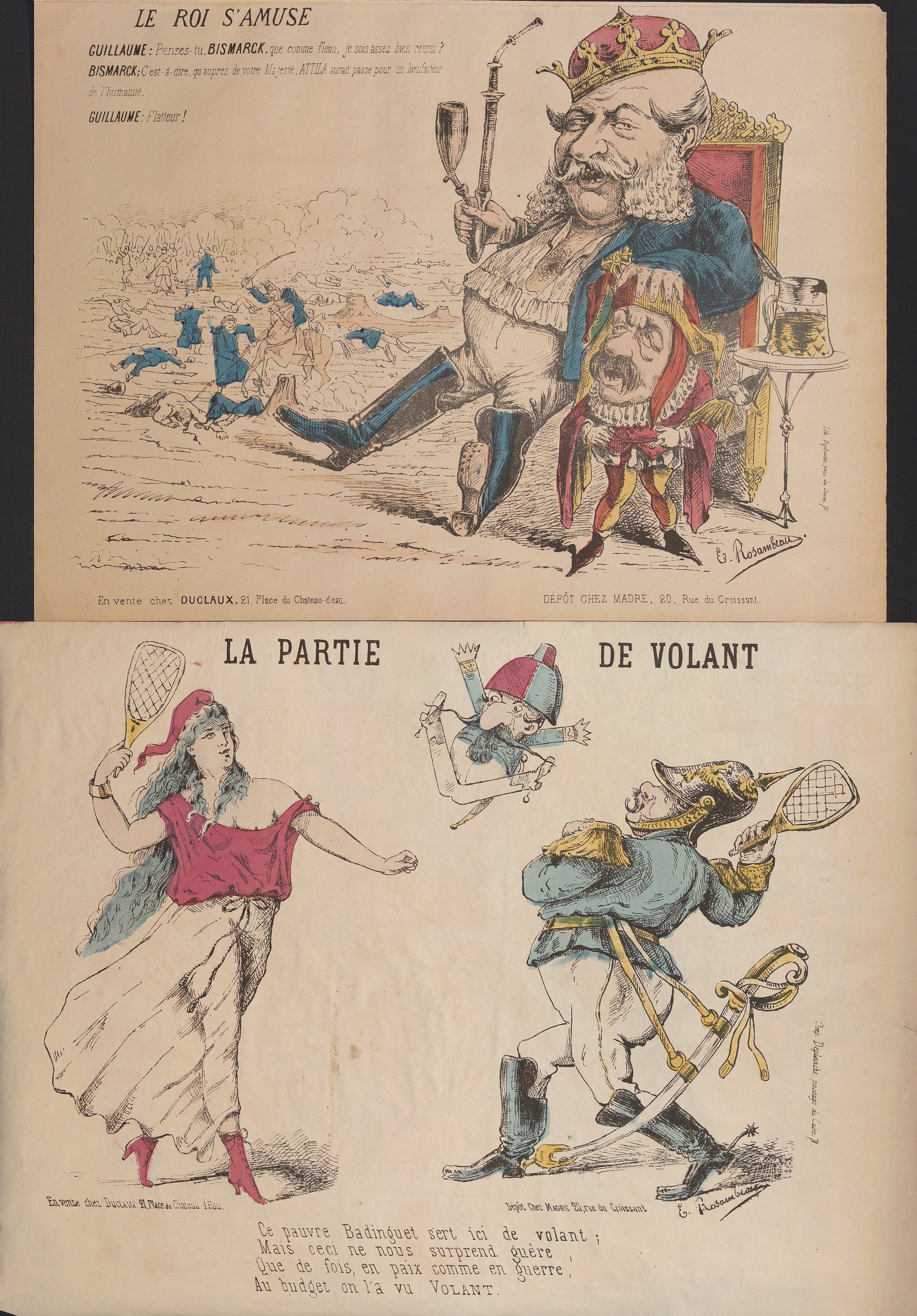 Actualités Grognet : n°50 Les boucheries , 27,5 x 34 cm ; n°52 La chasse aux Prussiens !!!..., 37,5 x 26 cm ; n°53 Essayez votre adresse !..., 26 x 37 cm ; n°57 Le plan Trochu, 37 x 26 cm ; n°58 La chute de Badingue, 33,5 x 28,5 cm ; n°59 Souvenir du siège, Le Bœuf Gras en 1871 !!!, 26,5 x 32 cm ; n°60 Le don des Anglais , 26 x 37 cm ; n°64, Le départ , 34xx 25,5 cm ;