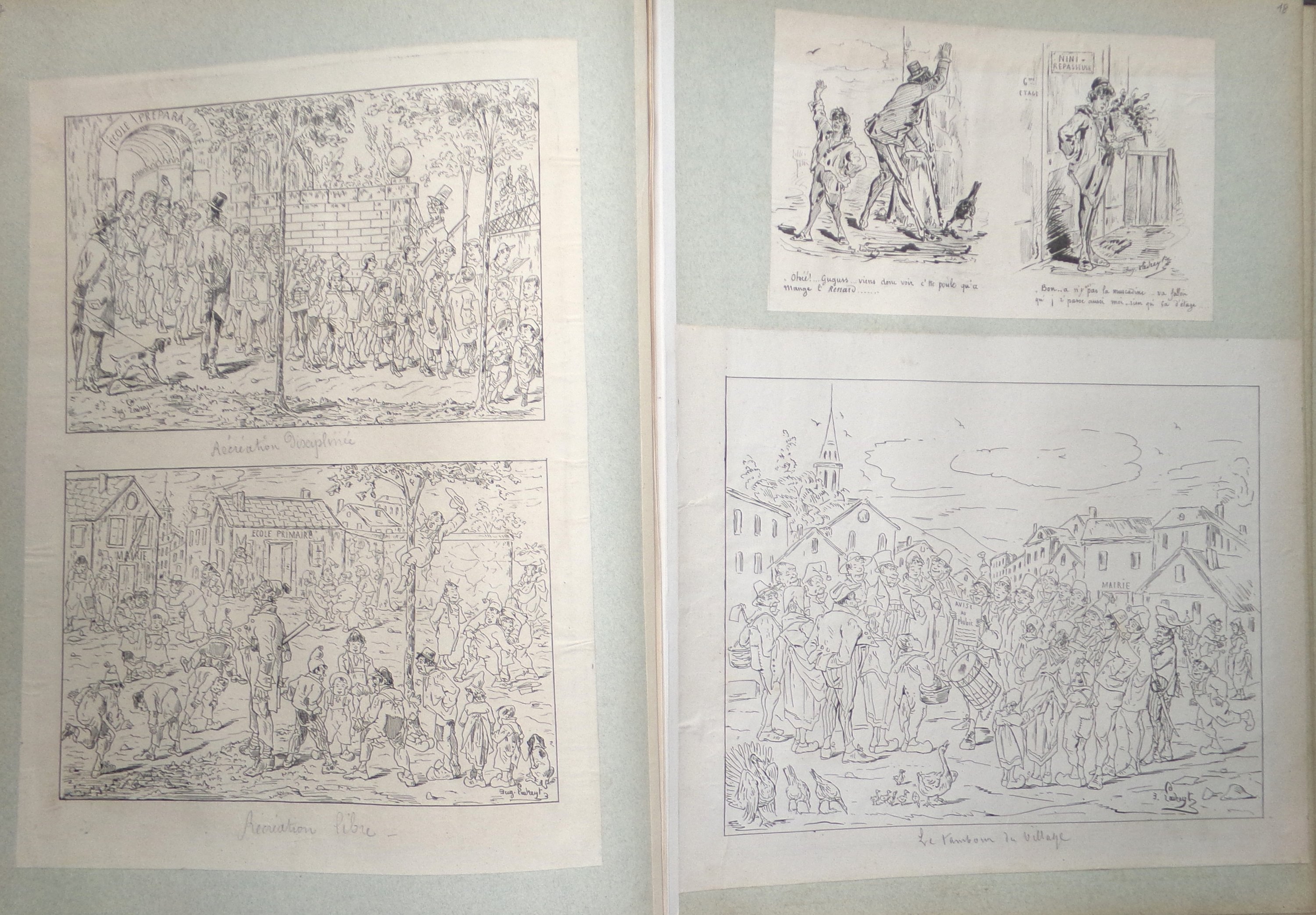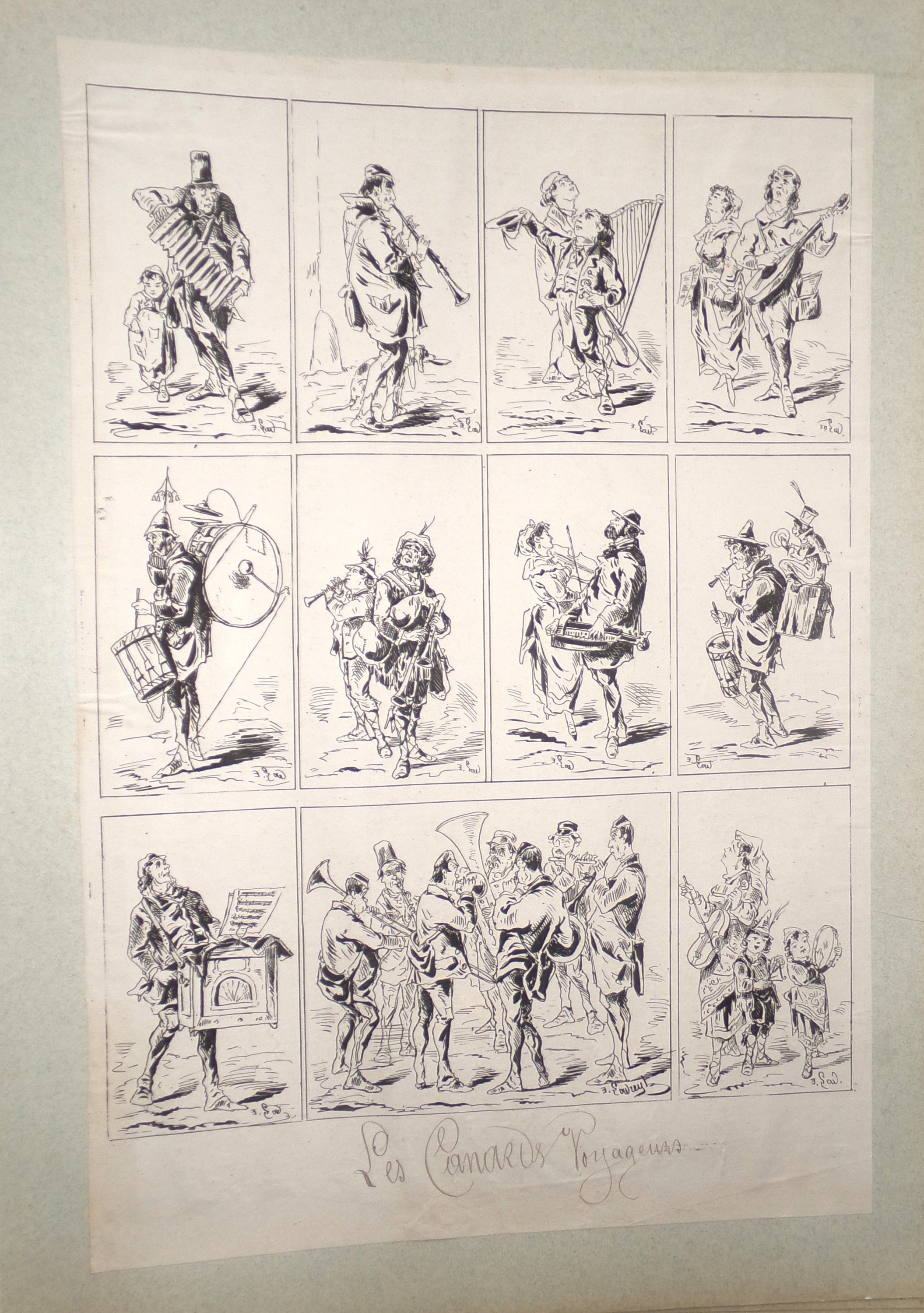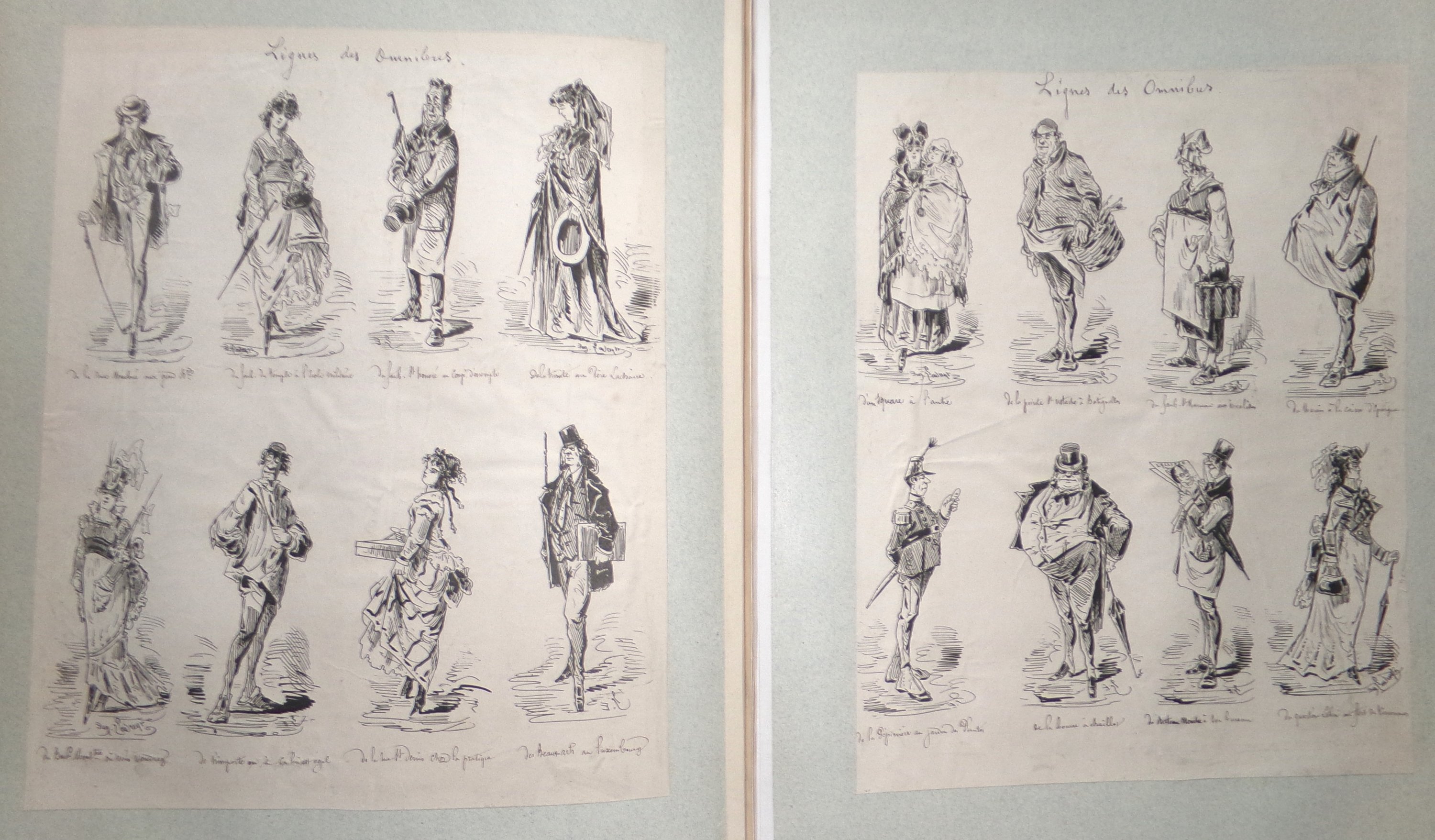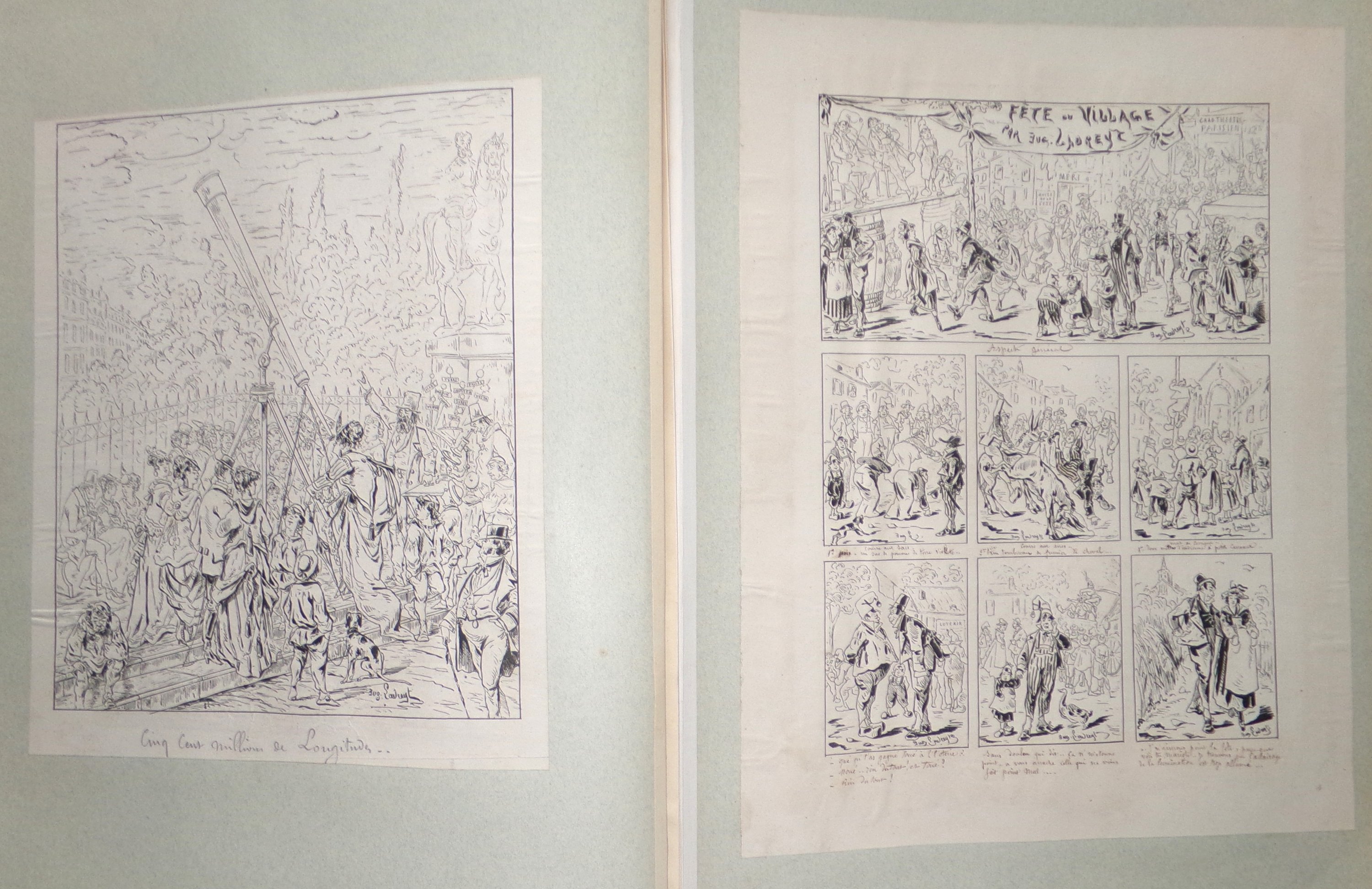 Rare réunion des dessins satiriques d’Eugène Ladreyt, publiés dans la presse de l’époque (La Revue Comique, L’Eclipse, Le Grelot, Le Sifflet, Paris-Comique, ou encore dans Guguss’!!! créé en 1870 par Ladreyt lui-même), figurant les scènes de mœurs de de l’époque : Saltimbanques ; Guignol ; Courses hippiques ; La foire aux jambons ; L’omnibus complet ; La partie de billard ; La farandole ; Le vitrier ; Dix minutes d’arrêts ; Récréations ; Les tambours du village ; Paris carnaval sortie d’un bal masqué ; Les quatre quartiers de lune ; Nos girouettes ; Embellissements de Paris, avenue Napoléon ; Bureau de nourrice ; Bureau de placement ; L’homme à la tête de bois ; Rue du Croissant ; Bains à 4 sous ; Nouvelle salle des Pas-Perdus ; Type des marchés ; Les joueurs de boules ; Le rat et le ratier ; Le lendemain des élections ; Courses de vélocipédistes place de la Bourse ; Foire au pain d’épice ; etc.