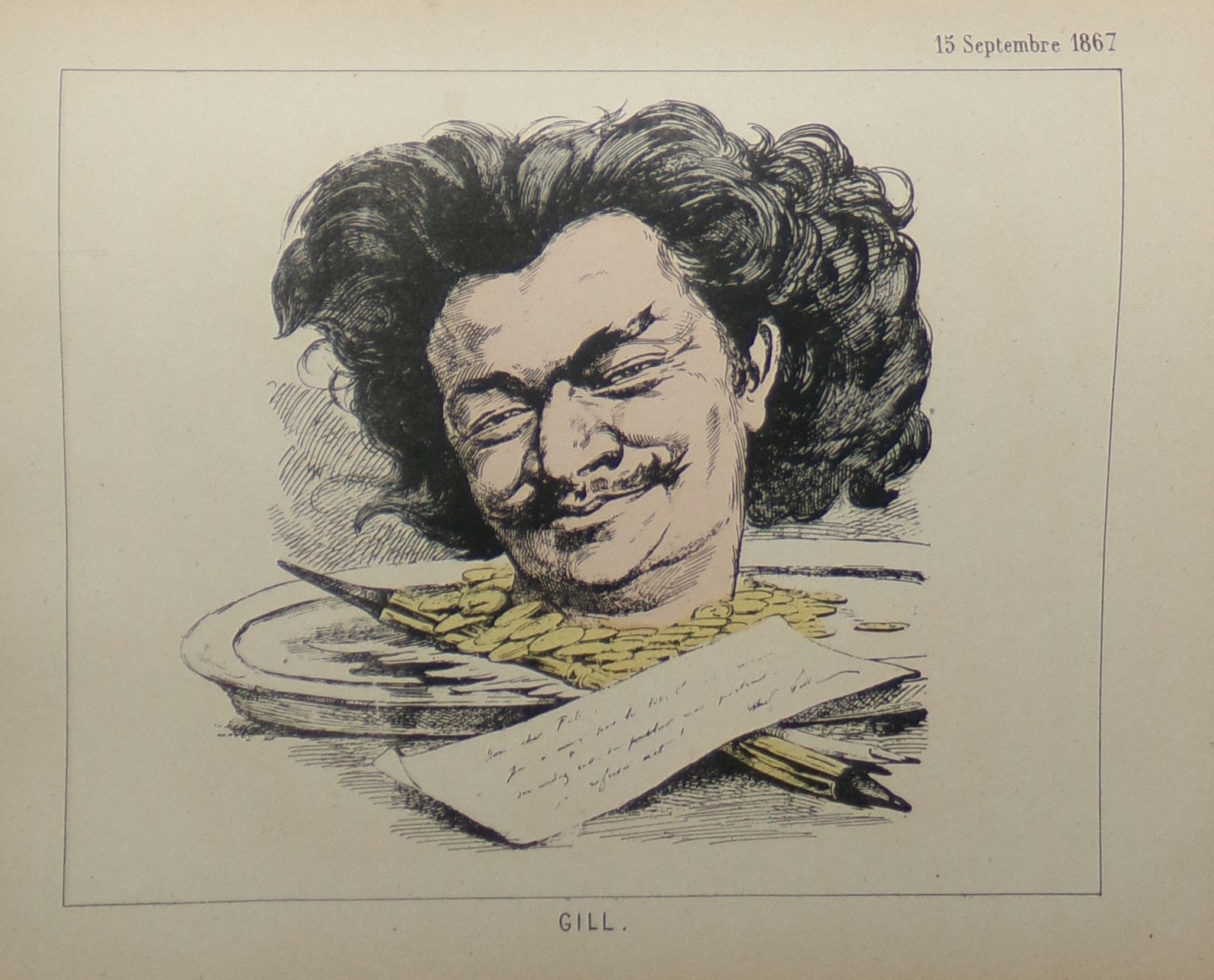 Album de La Lune et de l’Eclipse - 100 dessins de Gill. Paris, rue du Croissant, 16, [1872]. Rel. in-4 ½ toile (mouillures). Réunion de 100 dessins, coloriés et réduits ; Débute par le portrait de Timothée Trimm (23 septembre 1866) et se termine par « La Marseillaise » (28 août 1870) dont Gustave Courbet, Jules Ferry, Victor Hugo, André Gill (autoportrait), Rossini, Offenbach, Nadar, Bismarck, Jules Favre, Richard Wagner, Gustave Doré, etc. Double page de couv. bleutée (mouillures, rest.) et page de titre.