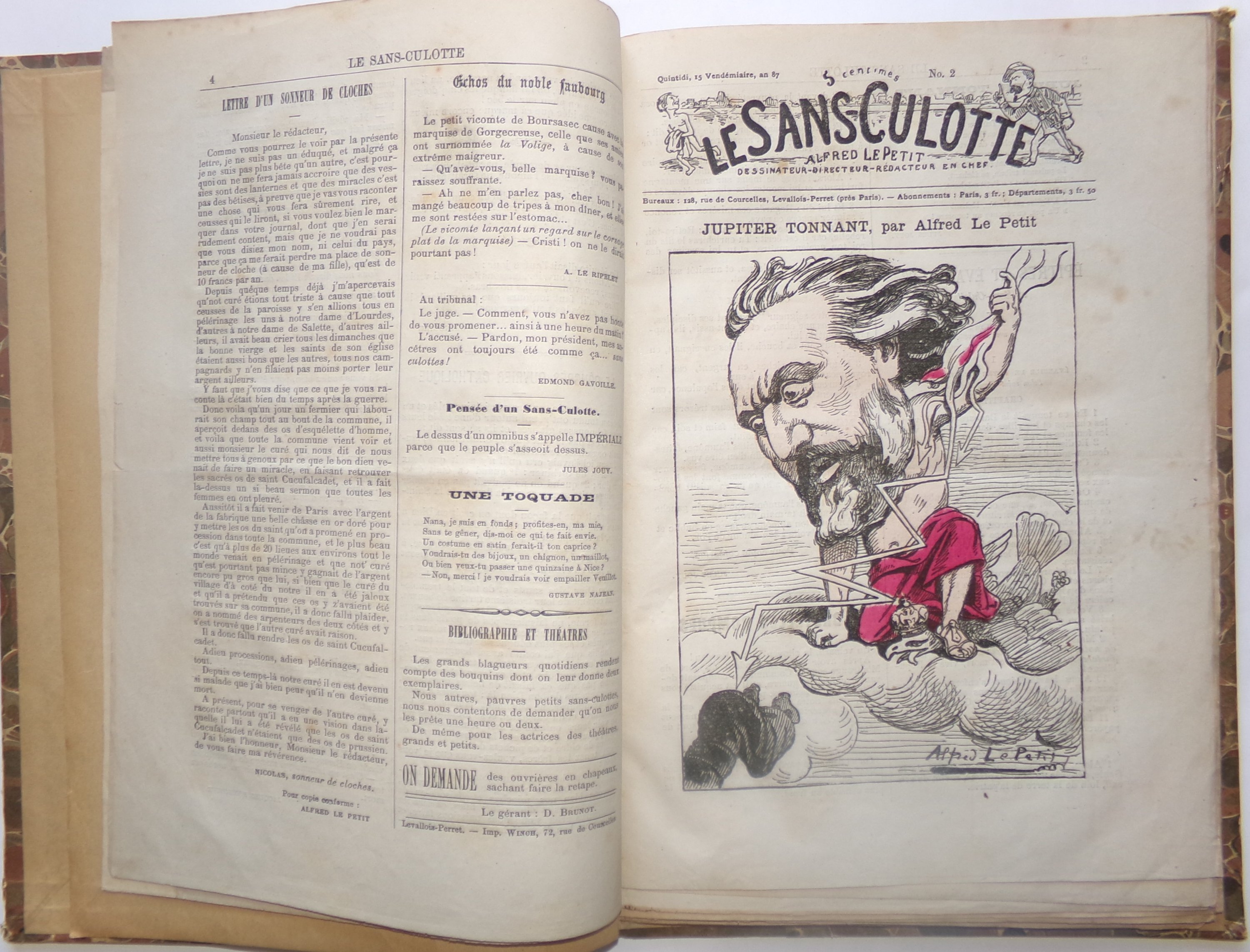 Le Sans-Culotte, n°1 à 29 (1878-1879), in-8 rel. ½ toile. Manque le dernier numéro (30). Dans la mouvance radical-socialiste, Alfred Le Petit vise, par le crayon et le texte, les monarchistes, les bonapartistes, le cléricalisme, militant pour l’amnistie totale des communards et s’intéressant au sort des « travailleurs ». Rare. T.B.E. (rousseurs) ;
