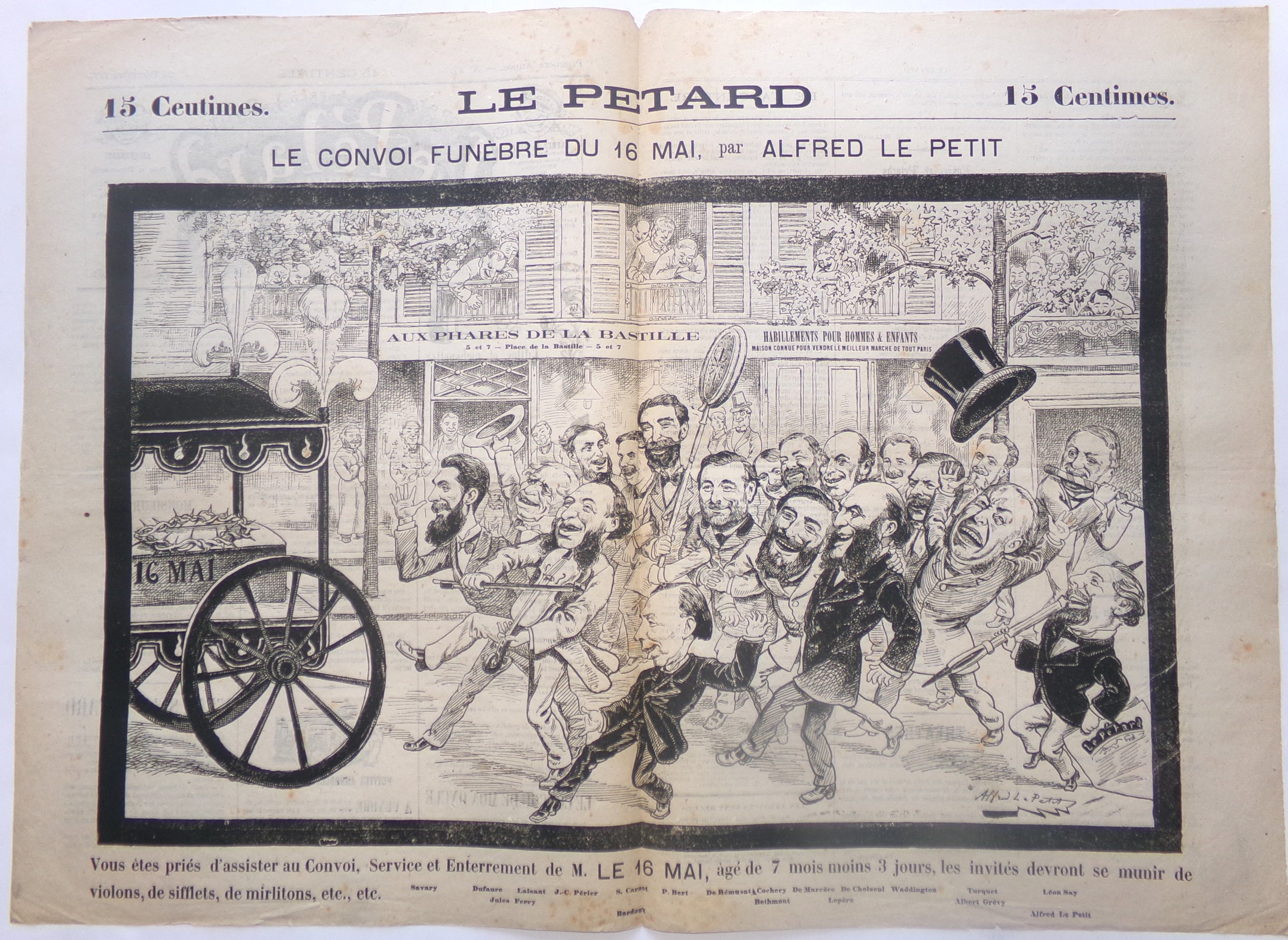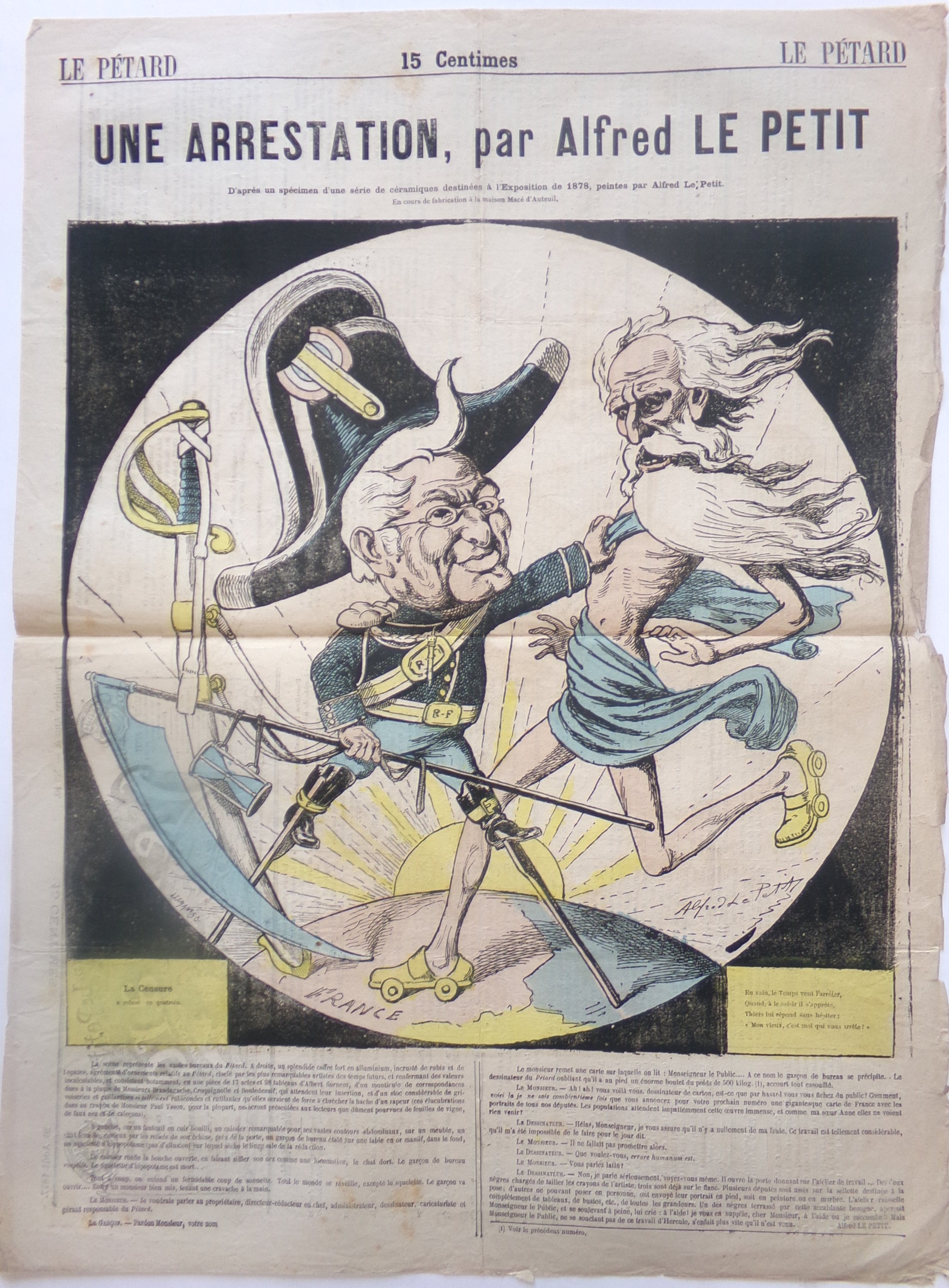 Le Pétard, 85 numéros (avec des doubles) entre le n°2 (1er juillet 1877) et n°99. Journal satirique fait entièrement par Alfred Le Petit qui est paru régulièrement jusqu’au n°97 (1879). Il lui a fallu ensuite attendre 9 ans pour publier les 15 derniers numéros qui se termine au n°112 d’août 1888. Peu courant. Etat moyen à T.B.E.