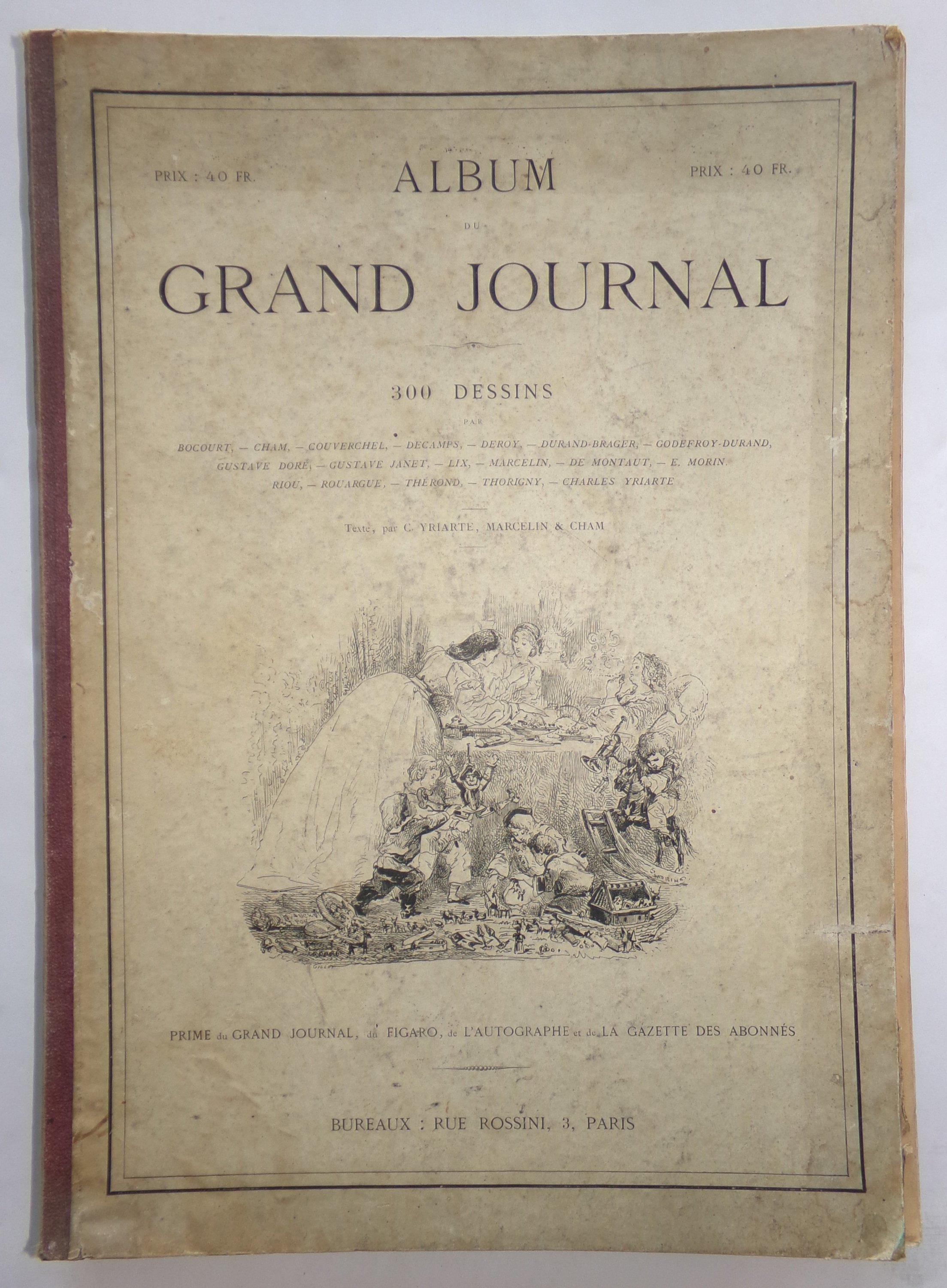 Album du grand journal, 300 dessins par Bocourt, Cham, Couverchel, Decamps, Deroy, Durand-Brager, Godefroy-Durand, G. Doré, G. Janet, Lix, Marcelin, De Montaut, E. Morin, Riou, Rouargue, Thérond, Thorigny, Ch. Yriarte. Prime du Grand Journal, du Figaro, de l’Autographe et de la Gazette des Abonnés, [1865]. In-fol. rel. éditeur, 149 pp. B.E.