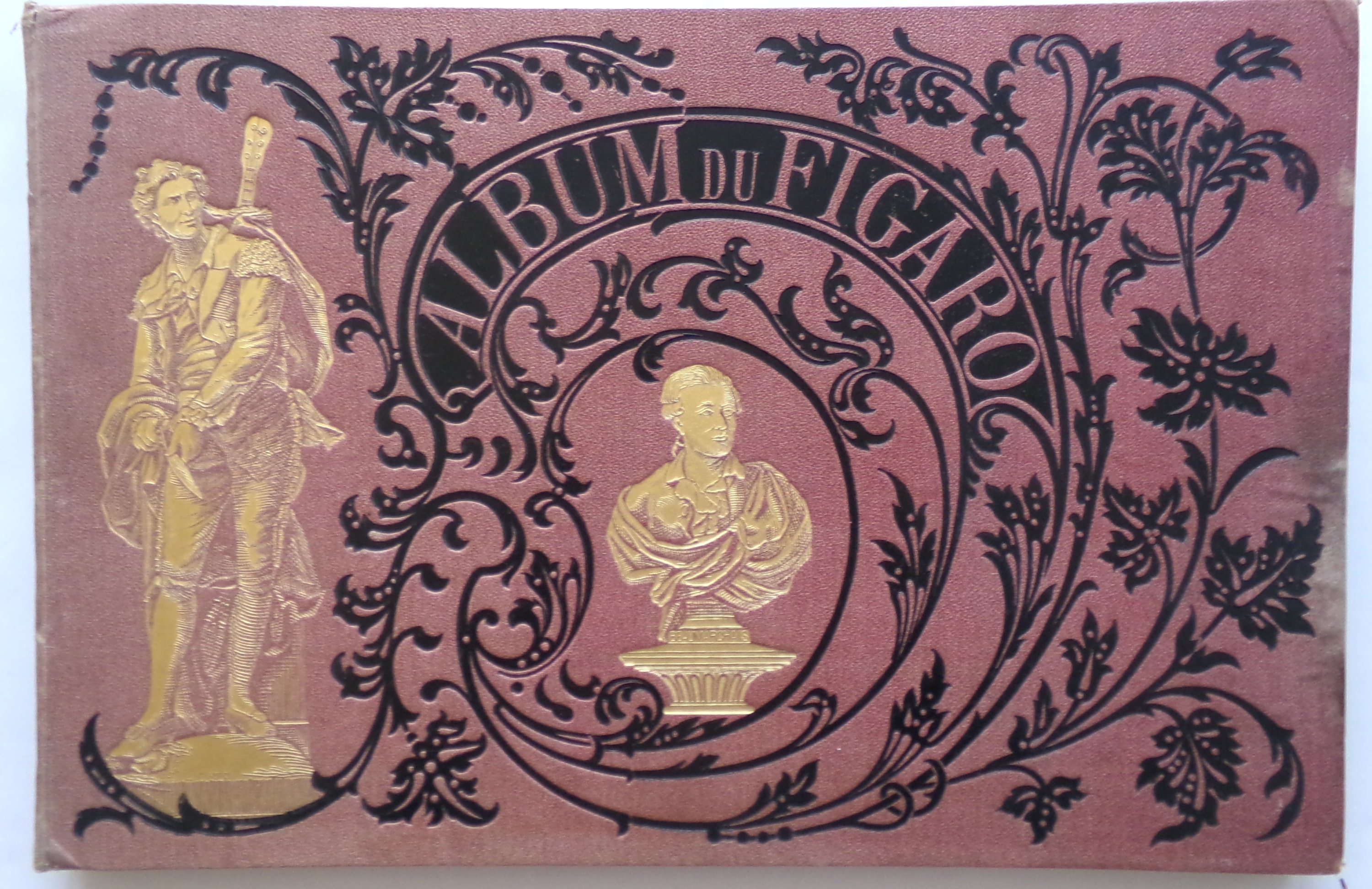 Alfred d’Aunay, L’album du Figaro. 1875. In-folio à l’italienne, 84 ff. et 24 pp. de publicité, percaline violette de l’éditeur (insolée), décor polychrome noir et or sur les plats ;