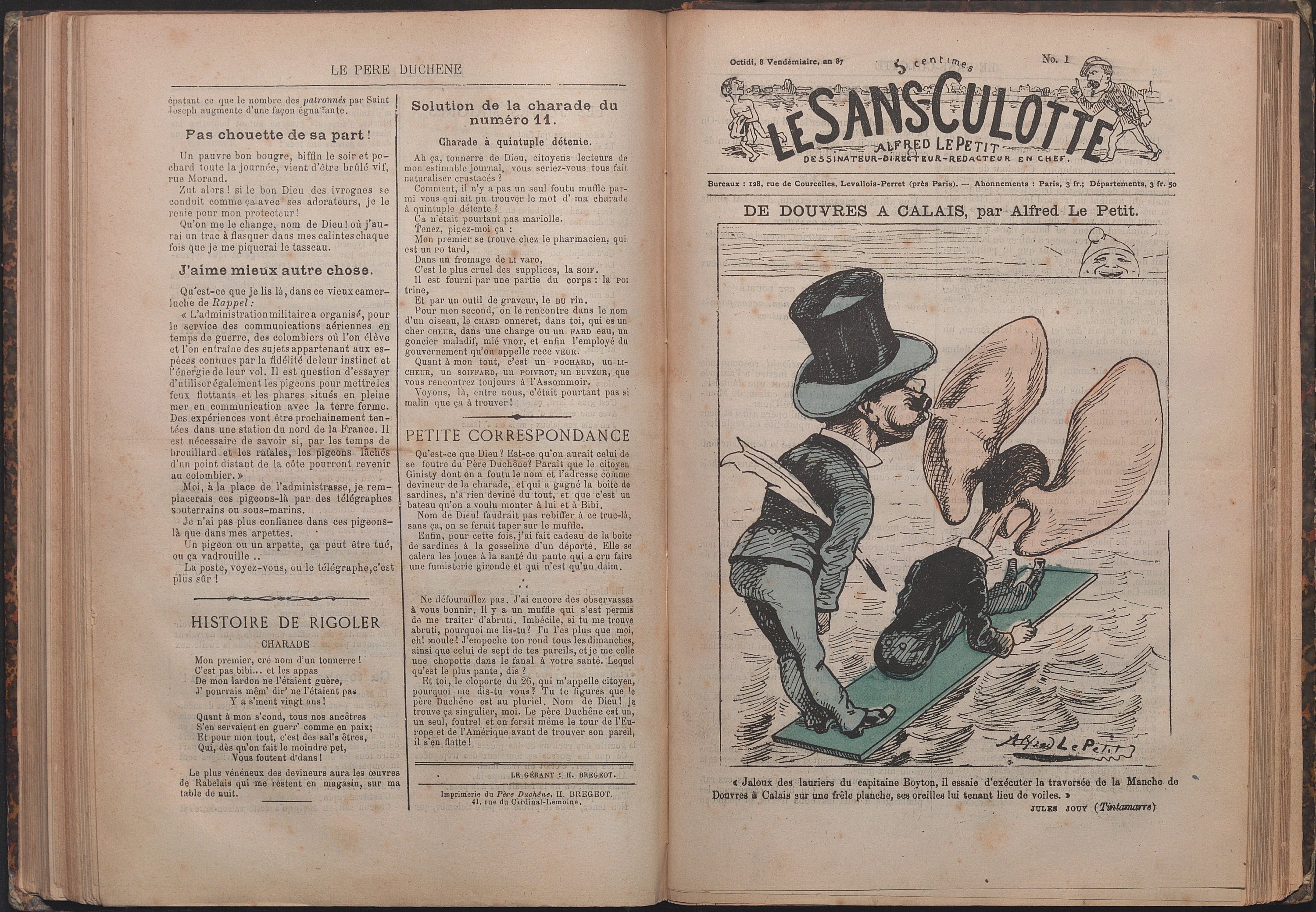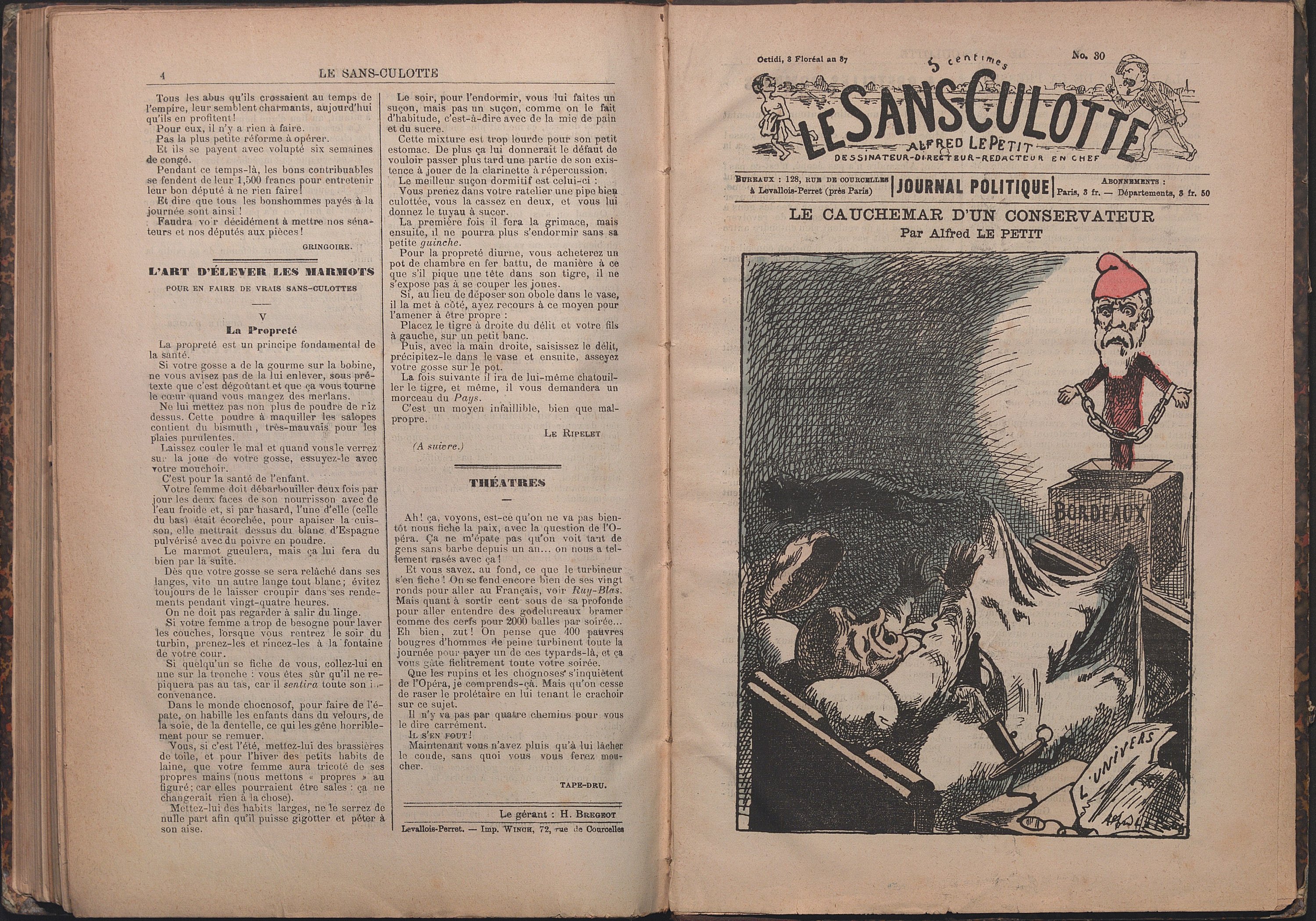 Le Sans-Culotte, n°1 (Octidi, 8 vendémiaire an 87 - 9 oct. 1878) au n°30 (Octidi, 8 floréal an 87 - 7 mai 1879), complet des 30 numéros sur 30 livraisons. « Composé de quatre pages, il se réclame clairement de l’héritage de la Révolution française, avec, en plus, une datation inspirée du calendrier révolutionnaire. Il s’agit de répondre à une situation politique tout à fait particulière. Les républicains cumulent les succès électoraux, avec comme pierre de touche la présidence de la République en janvier 1879, mais les forces réactionnaires demeurent très dynamiques. Ainsi, par le crayon et le texte, Alfred Le Petit ne cesse de viser les monarchistes, les bonapartistes, le cléricalisme. Il milite pour l’amnistie totale des communards, s’intéresse au sort des «?travailleurs?». Il se situe alors dans la mouvance radical-socialiste qui dénonce aussi bien les opposants à la République que la tiédeur et les trahisons des opportunistes » (La Presse satirique française, n° 18).