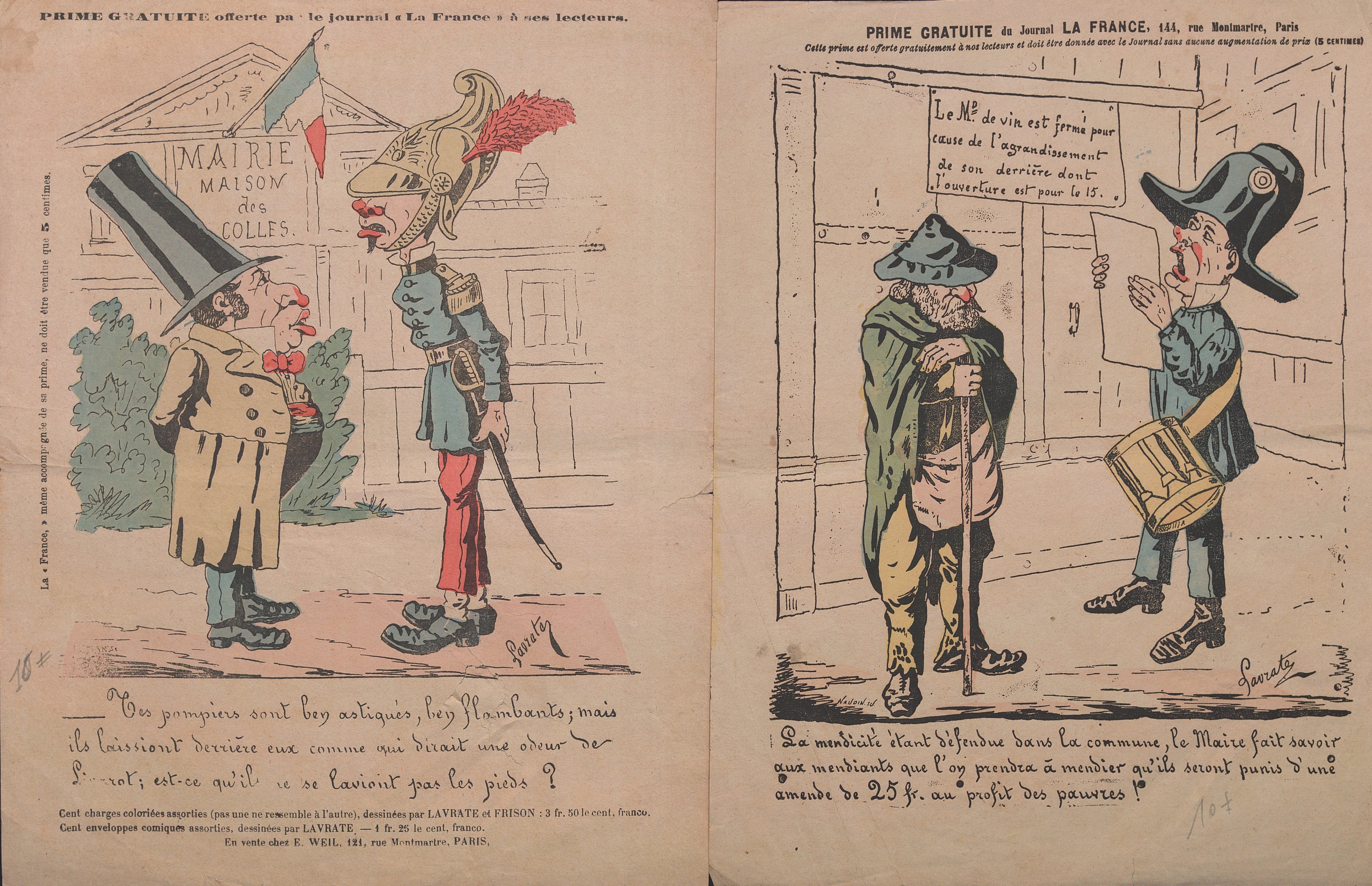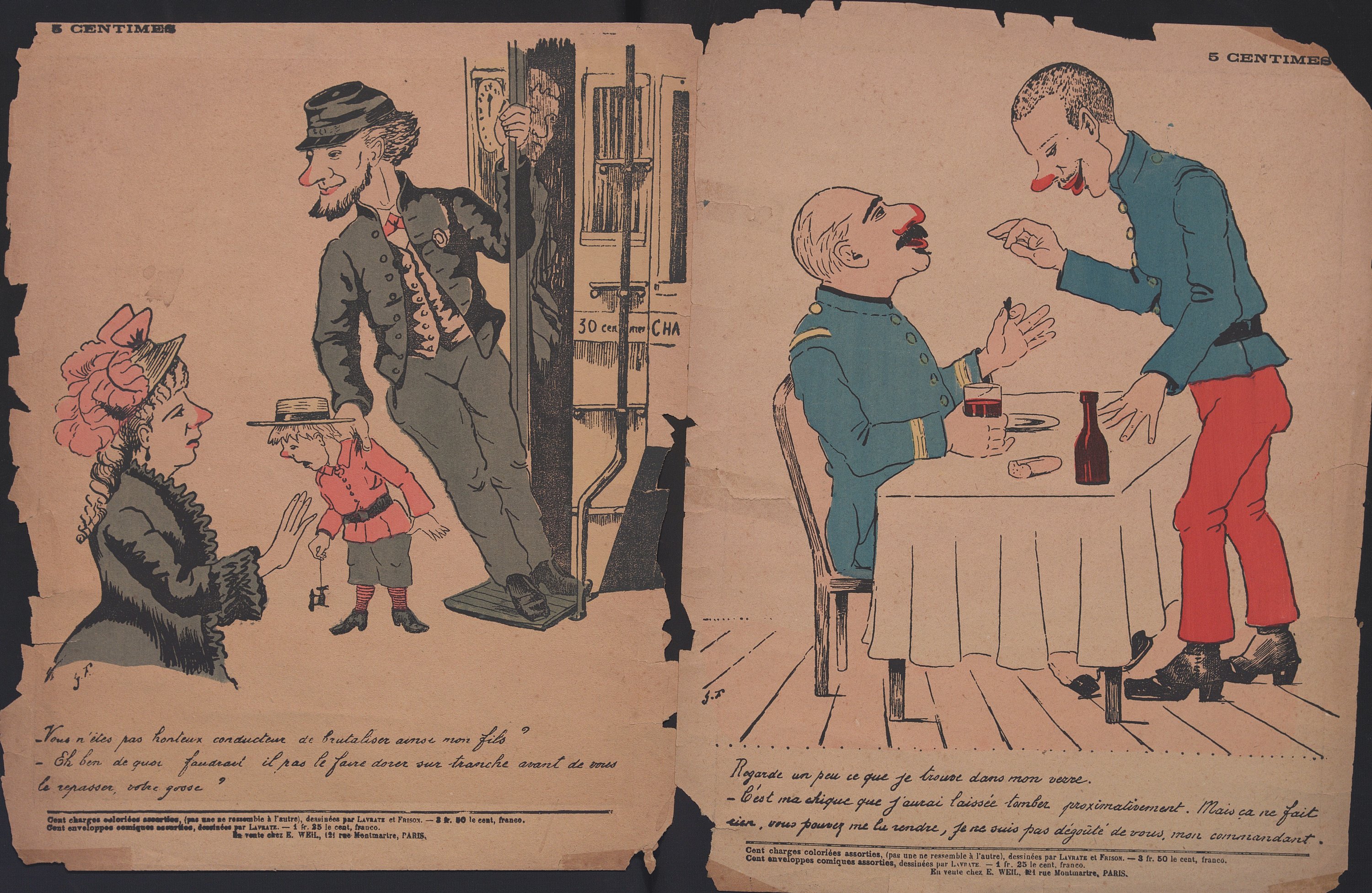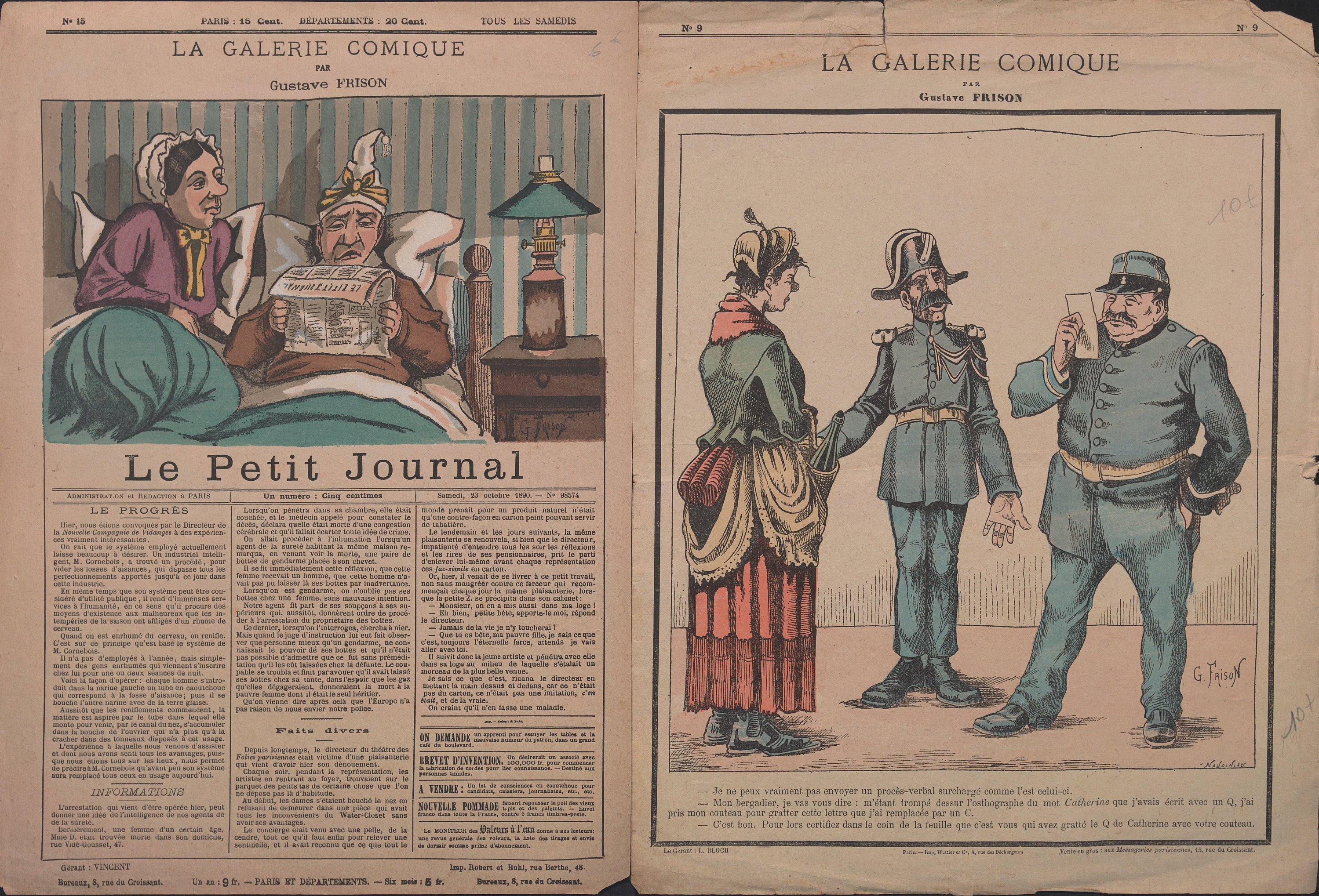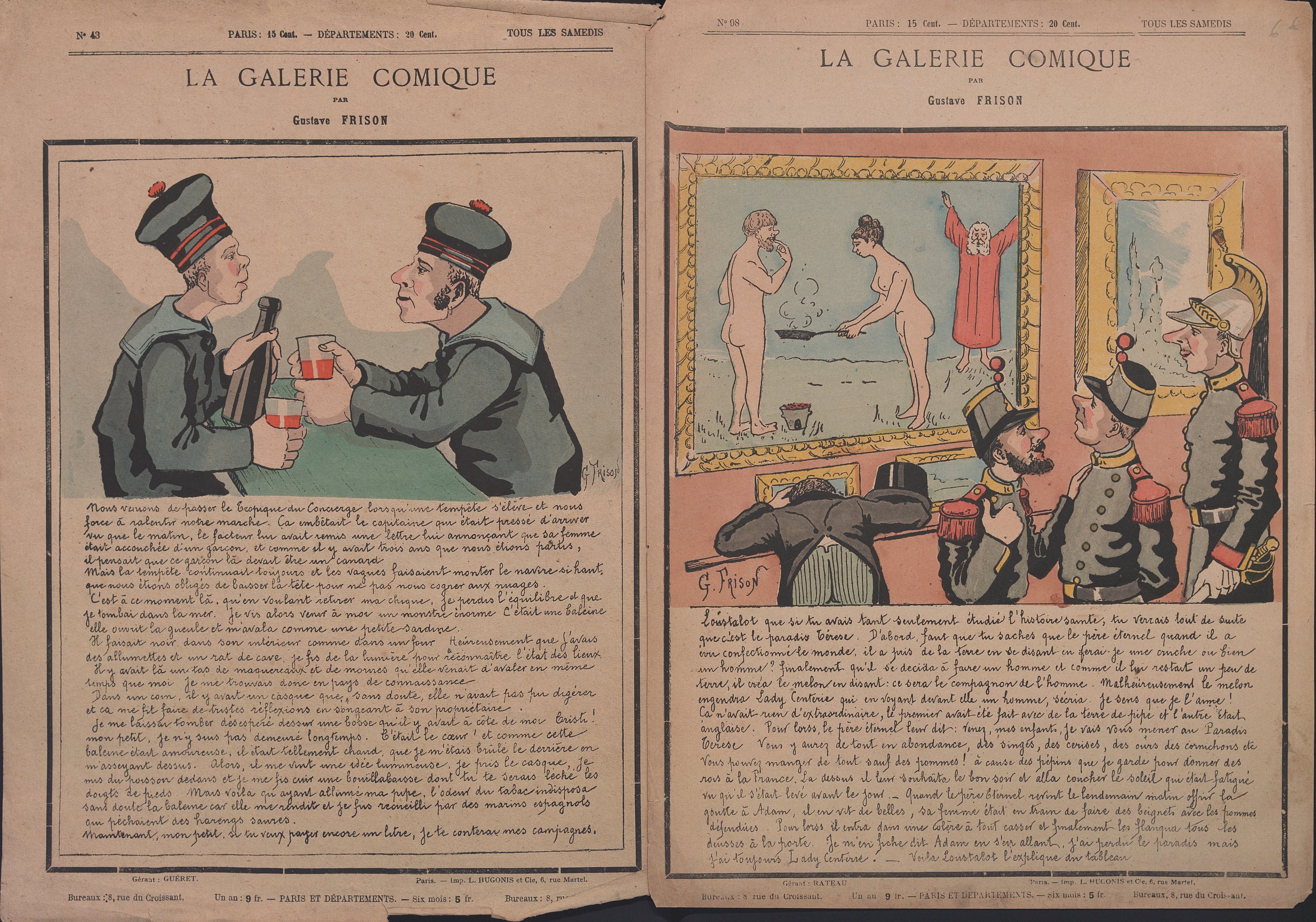 25 ex. par Gustave Frison et 10 ex. par Edmond Lavrate ; scènes de militaires, anticléricales, mariage, justice, etc.