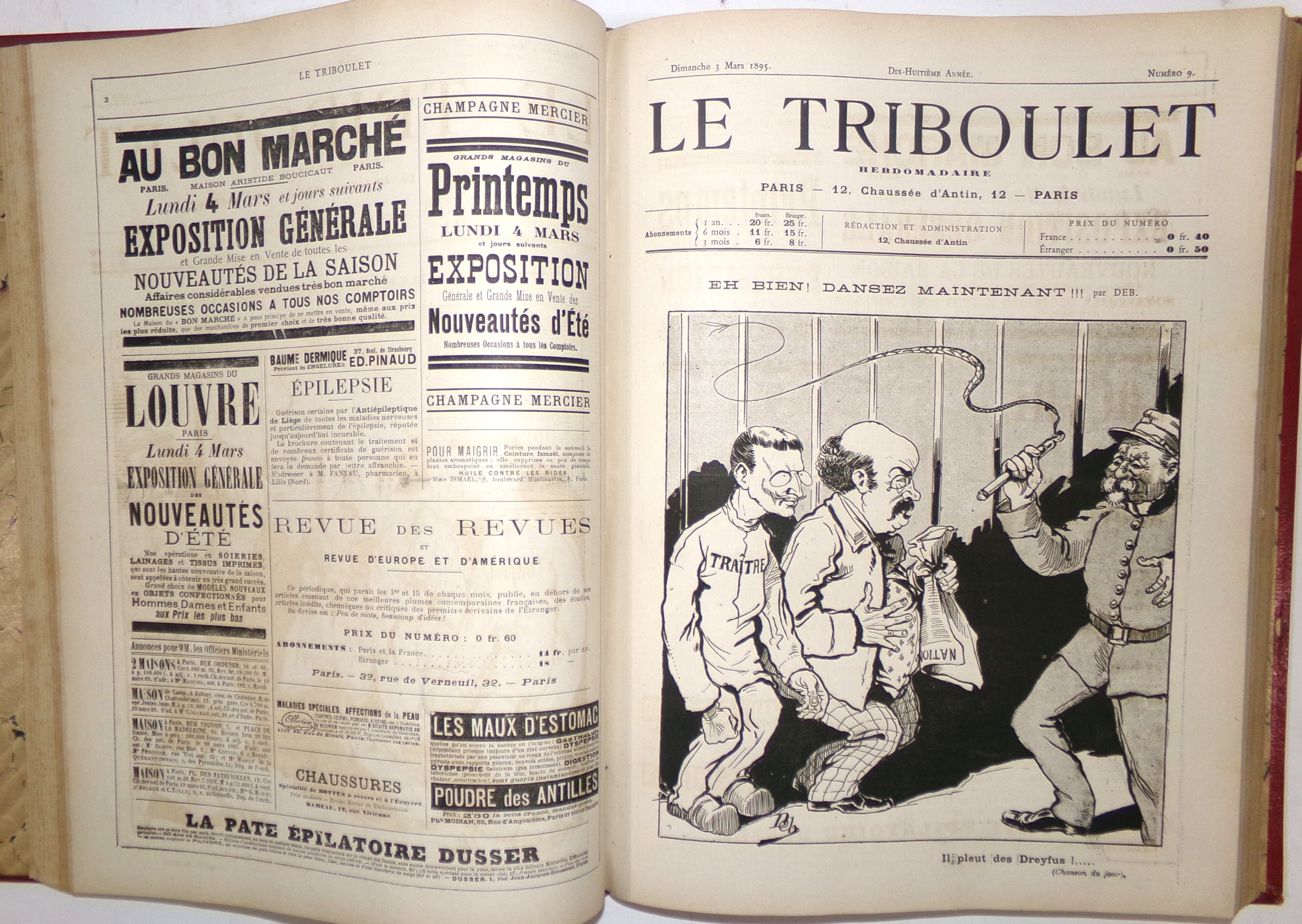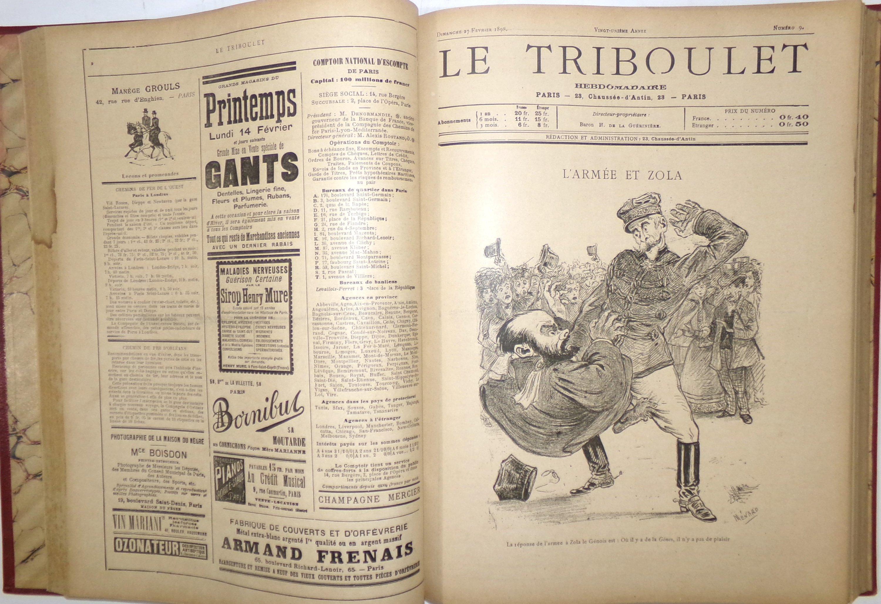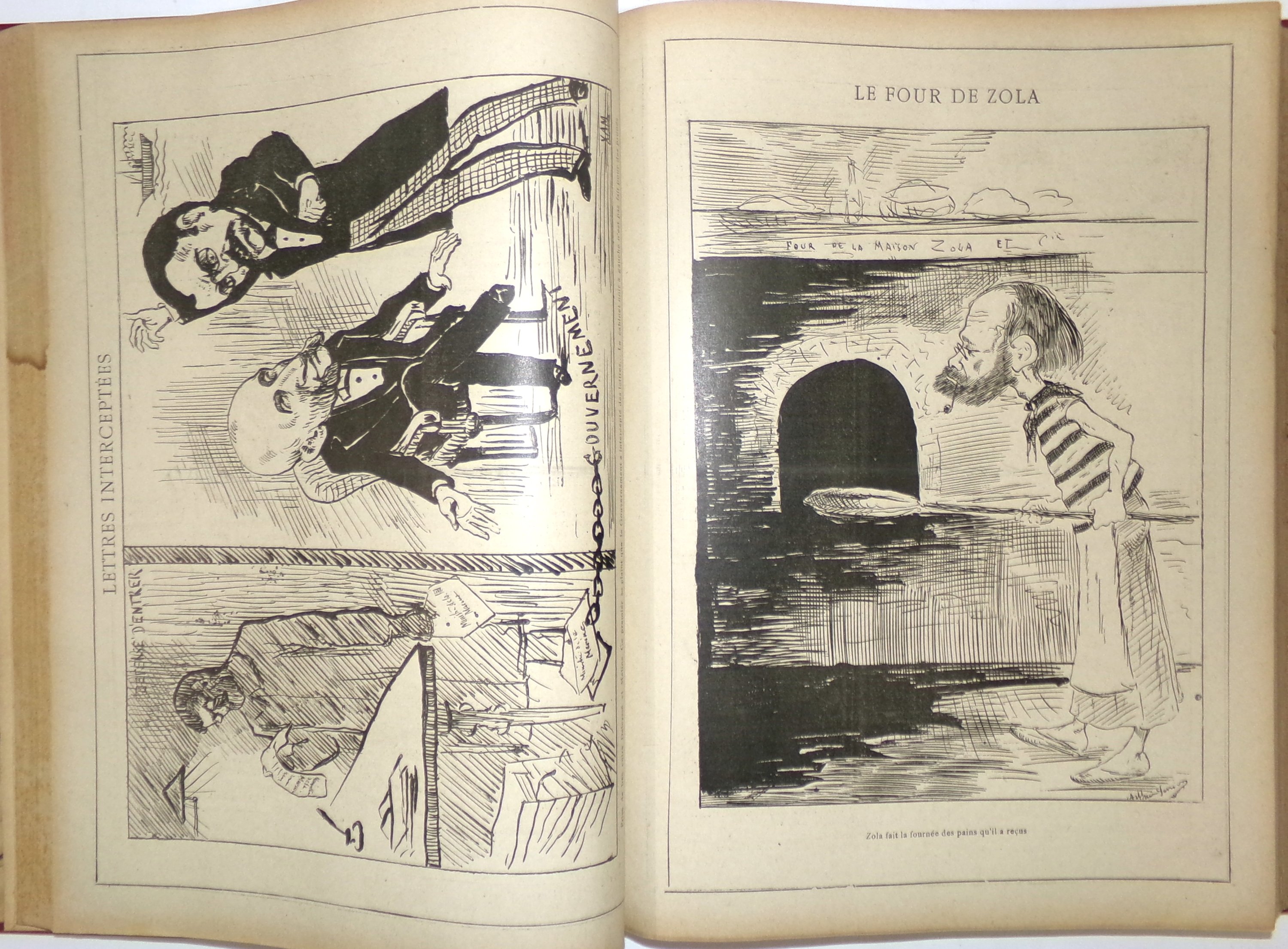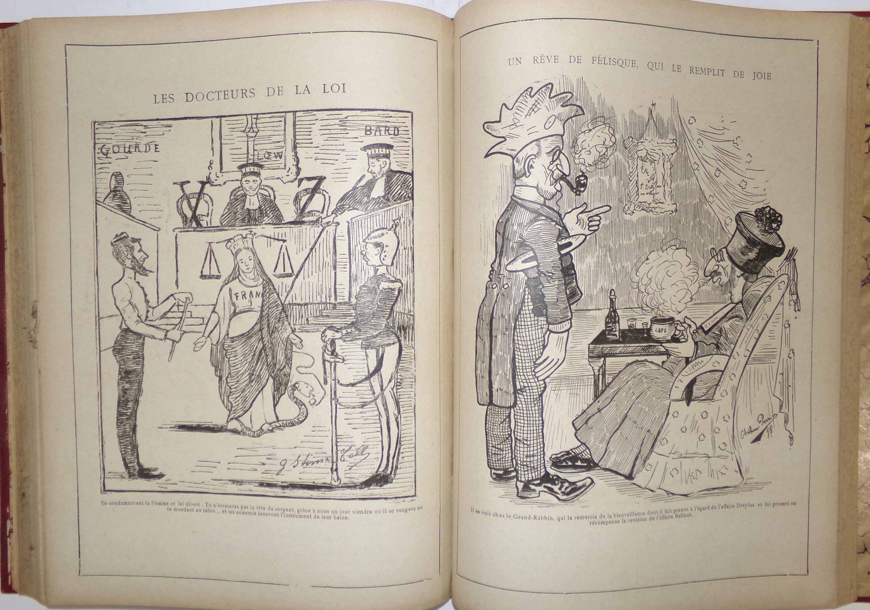 (2 vol.) n°1 (2 janvier 1898) au n°26 (26 juin 1898) (mque n°3) ; n°28 (10 juillet 1898) au n°52 (25 décembre 1898) (mque n°27, 42, 44 et 51) ; nombreuses caricatures contre Emile Zola et l’affaire Dreyfus ;