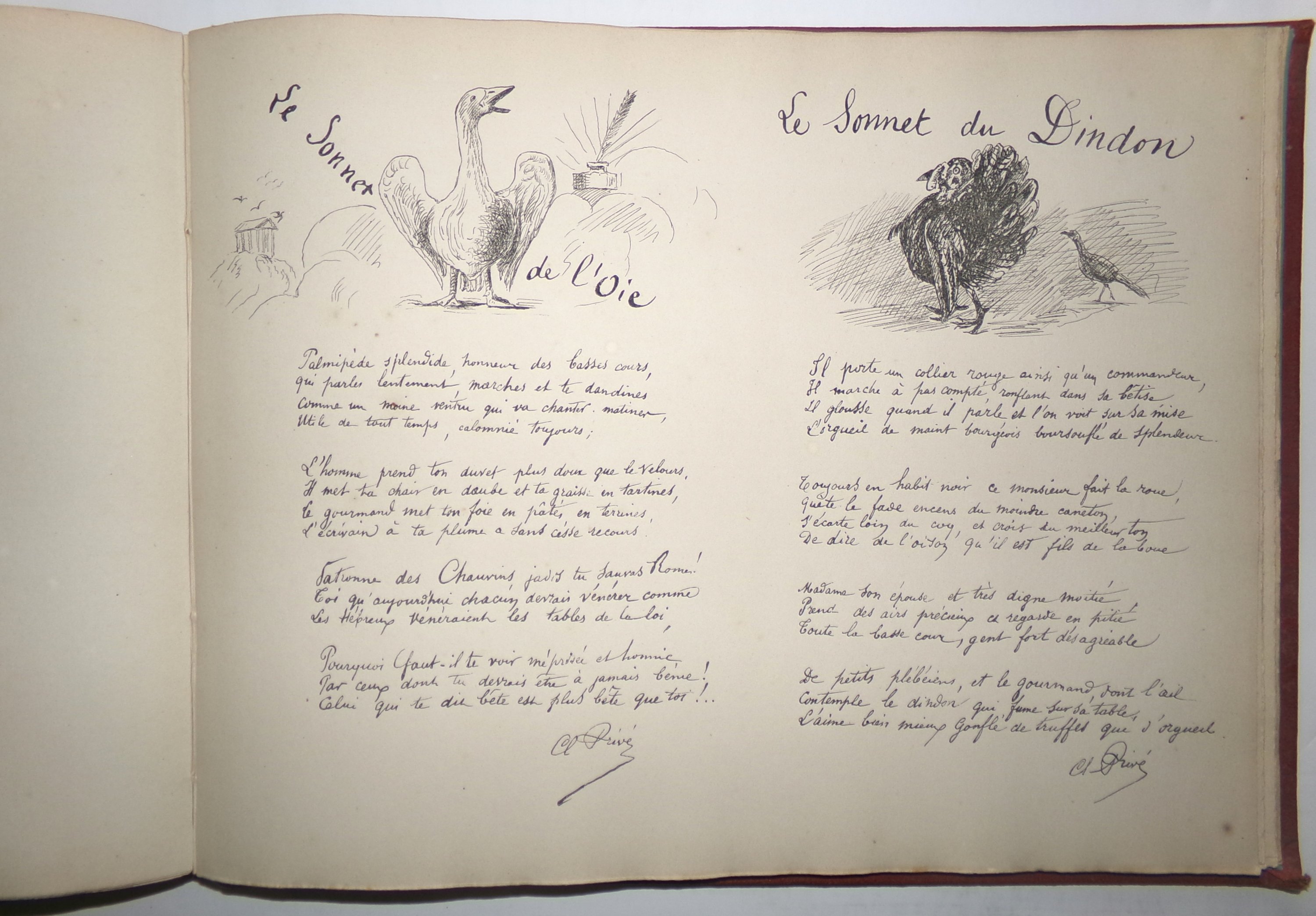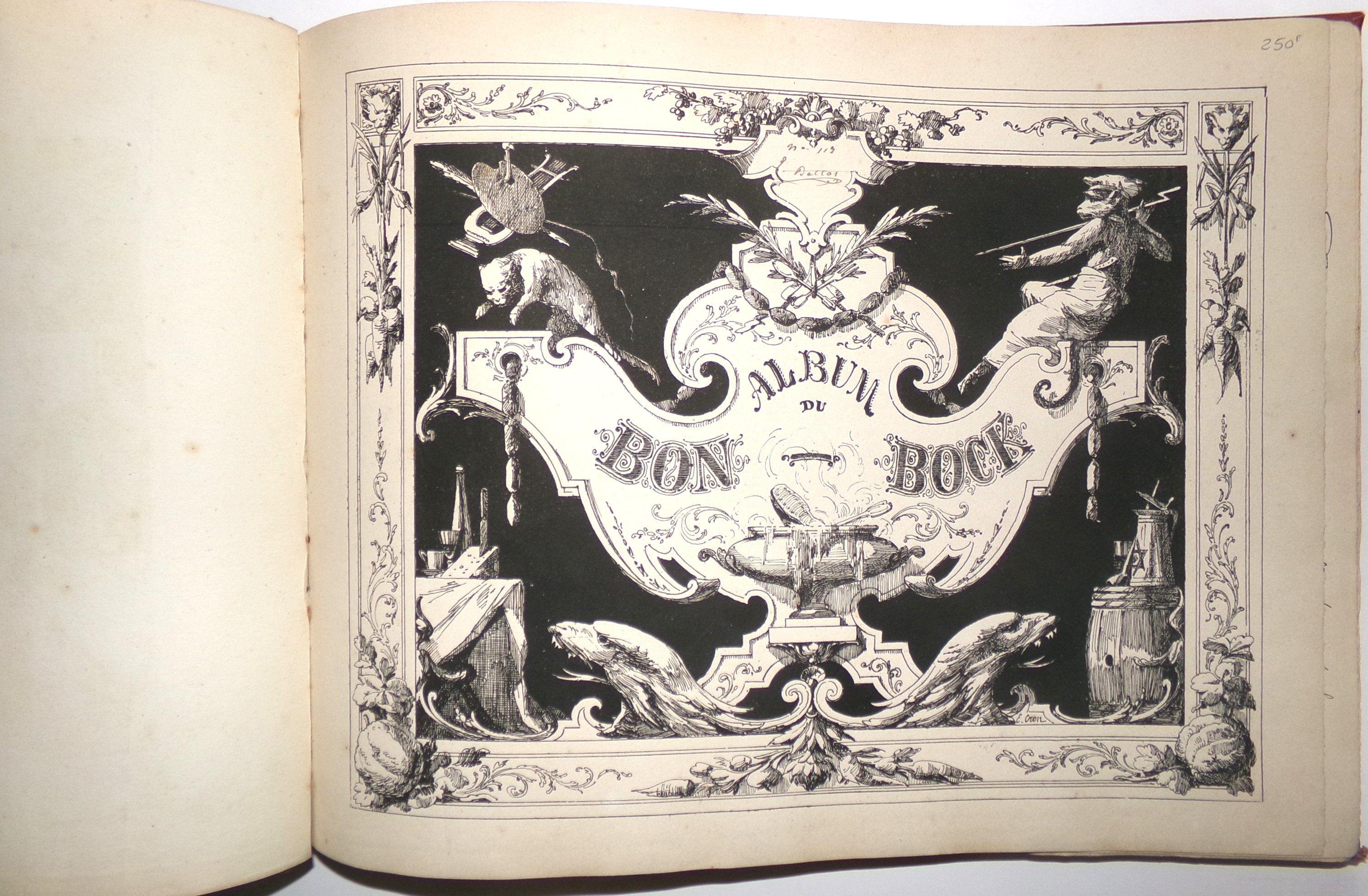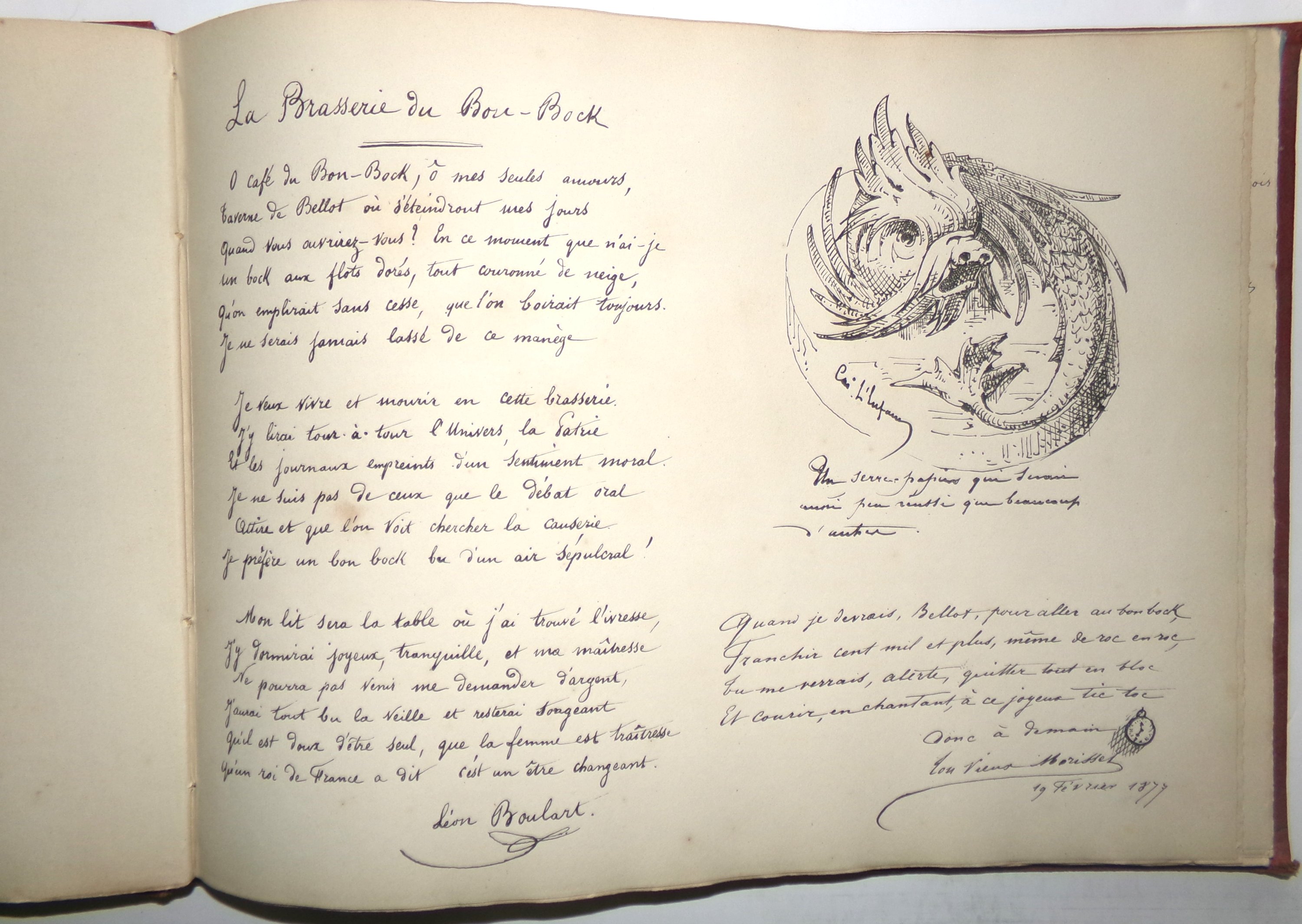 Album du Bon Bock. Deuxième et Troisième année. Pau, Ludovic Baschet, 1878. In-4 rel. à l’italienne percaline chagrinée rouge éditeur. Second album tiré à 500 exemplaires. Numéroté à la main n°117 et signature autographe d’Emile Bellot. Texte et dessins autographiés sur papier fort. 2 portraits de E. Bellot (dont "le Bon Bock" de Manet, salon de 1873), dessins de H. Pille, H. Somm, K. Daubigny, Monselet (autoportrait), etc ; poésies de Paul Arène, Carjat, Ch. Monselet, G. Aimard, etc ; musique et poésie d'Alexandre Schanne (le schaunard de "La vie de Bohème"). Bon exemplaire (usures et tâches à la couv., rouss. éparses).