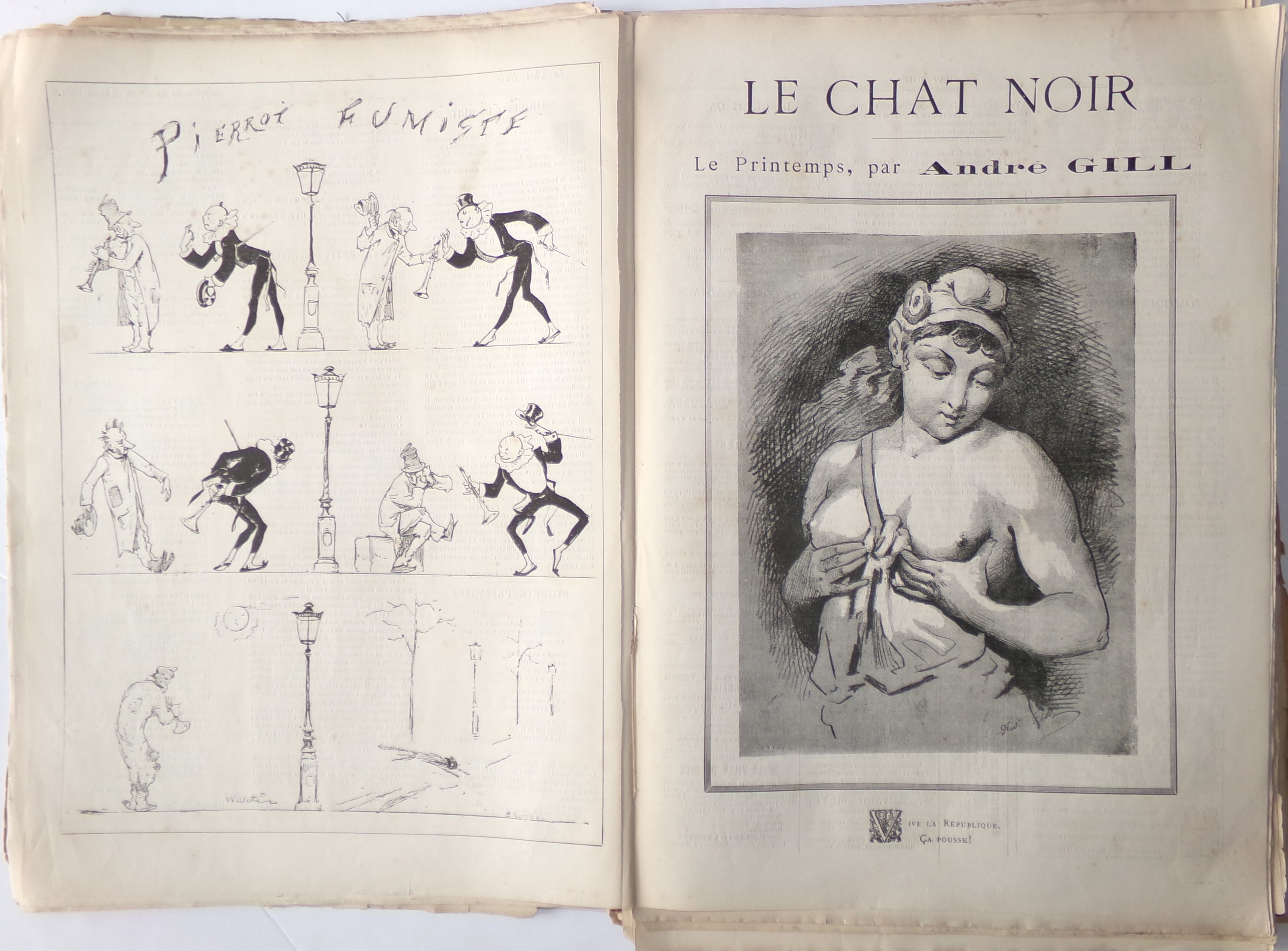 Le Chat noir est une revue hebdomadaire créée par Rodolphe Salis et Emile Goudeau, publiée de 1882 à 1897, dans le but de promouvoir le célèbre cabaret du même nom dont elle se veut la mémoire. On y publie les textes déclamés durant les spectacles. Il s'agit, en outre, d'un important témoignage littéraire et artistique de la fin du XIXe siècle, autour de la bohème et de l'effervescence parisienne qui lui est propre.