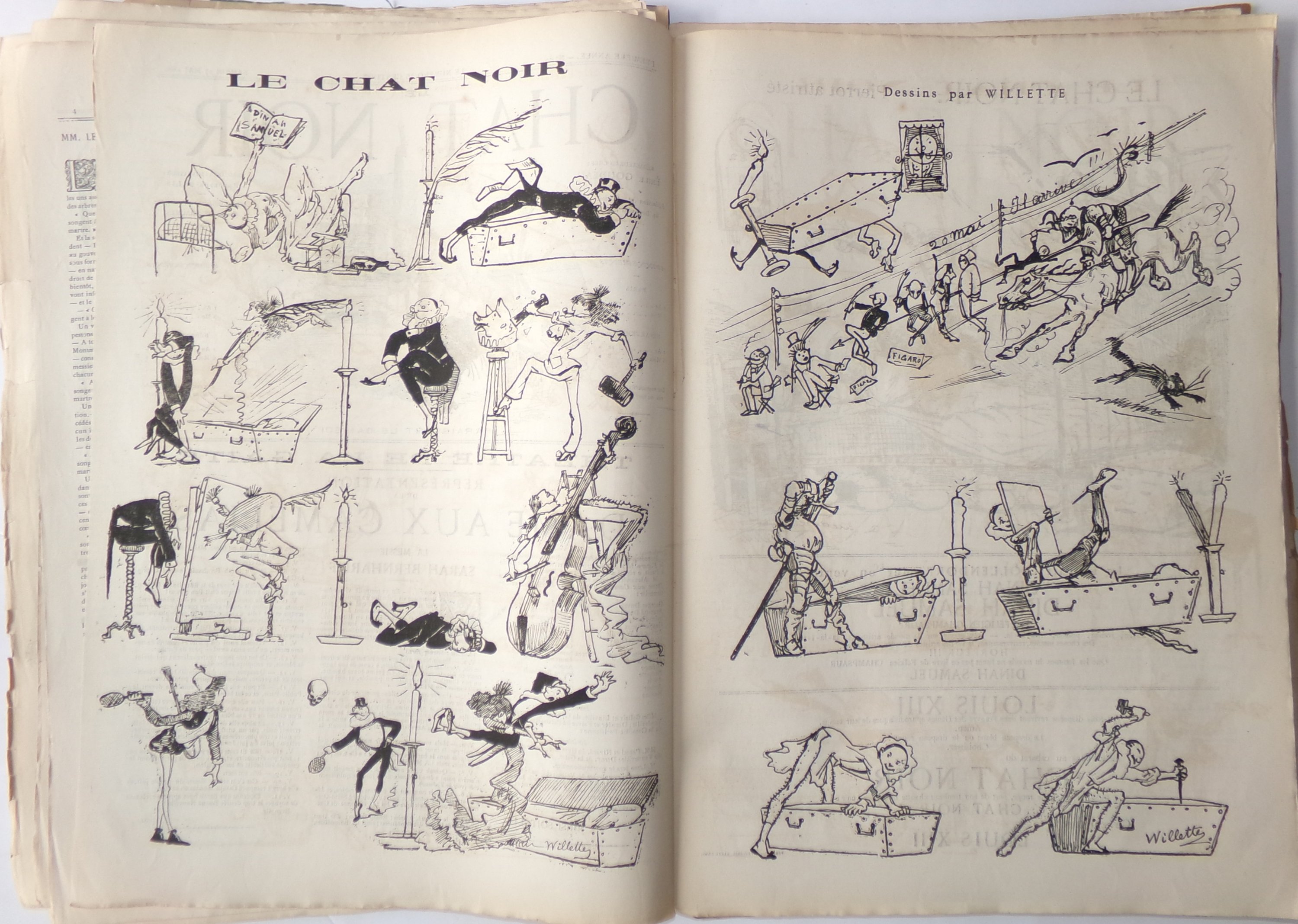 n°1 (14 janv. 1882) au n°52 (6 janv. 1883), tête de collection. Textes de Alphonse Allais, George Auriol, Léon Bloy, Emile Goudeau, Jean Lorrain, Jean Richepin, Paul Verlaine, etc. Illustrations de Caran d’Ache, Henri Rivière, Rodolphe Salis, Henri de Sta, Steinlen, Adolphe Willette, etc. Etat moyen à B.E. (déchirures, qqs ex. insolés) ;