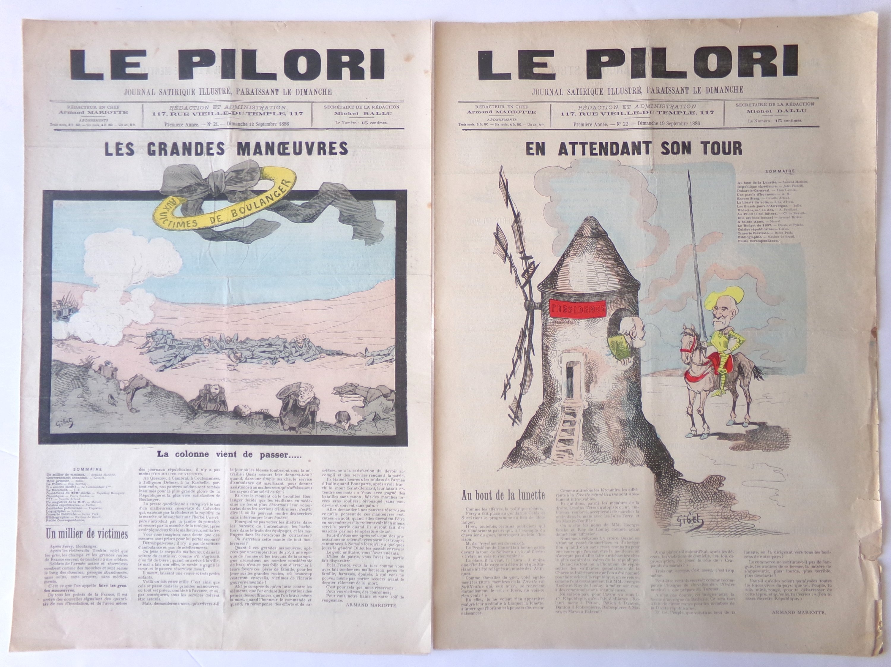 Hebdomadaire satirique fondé par le journaliste bonapartiste Armand Mariotte, Le Pilori, présentant à la Une une grande caricature illustrée par Blass, Vignola et divers, est très vite confronté à plusieurs procès. Deux mois à peine après sa création, l'un de ses articles, intitulé « Vive le coup d’Etat », vaut à son rédacteur en chef d'être poursuivi pour « provocation au pillage et à commettre un attentat ayant pour but de changer la forme du gouvernement ». Clérical, antisémite, antimaçonnique et nationaliste, Le Pilori soutient le mouvement boulangiste en 1889.