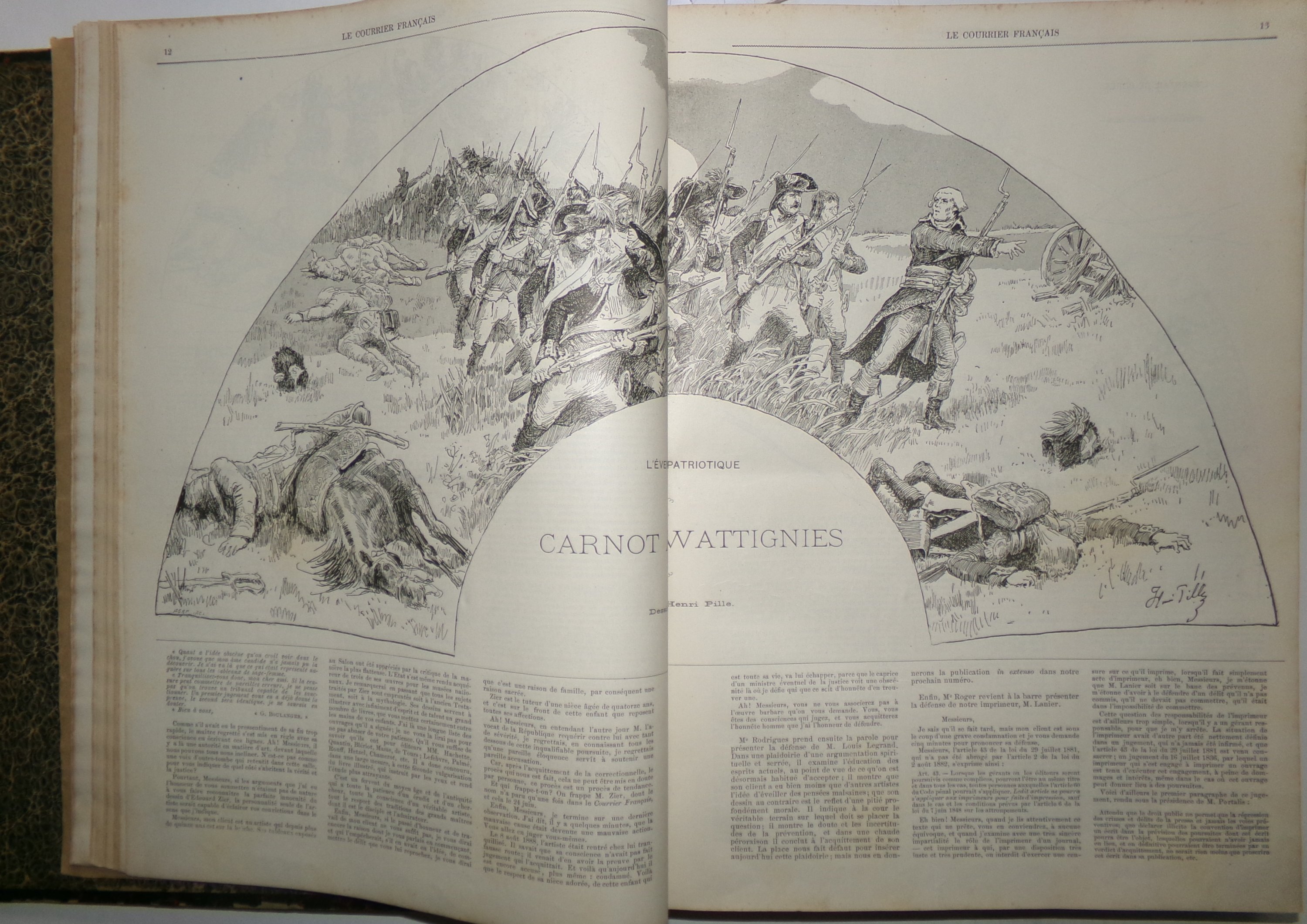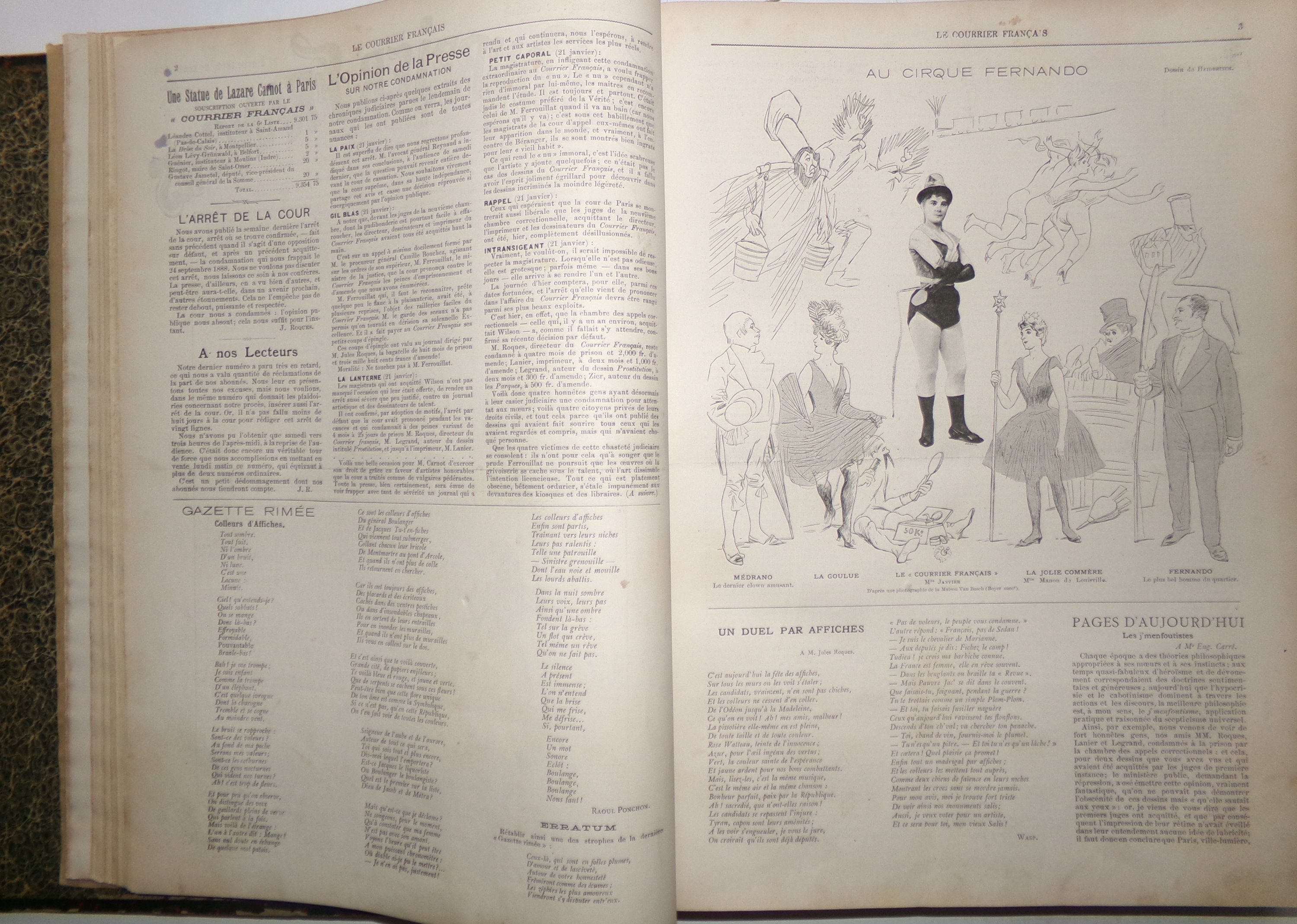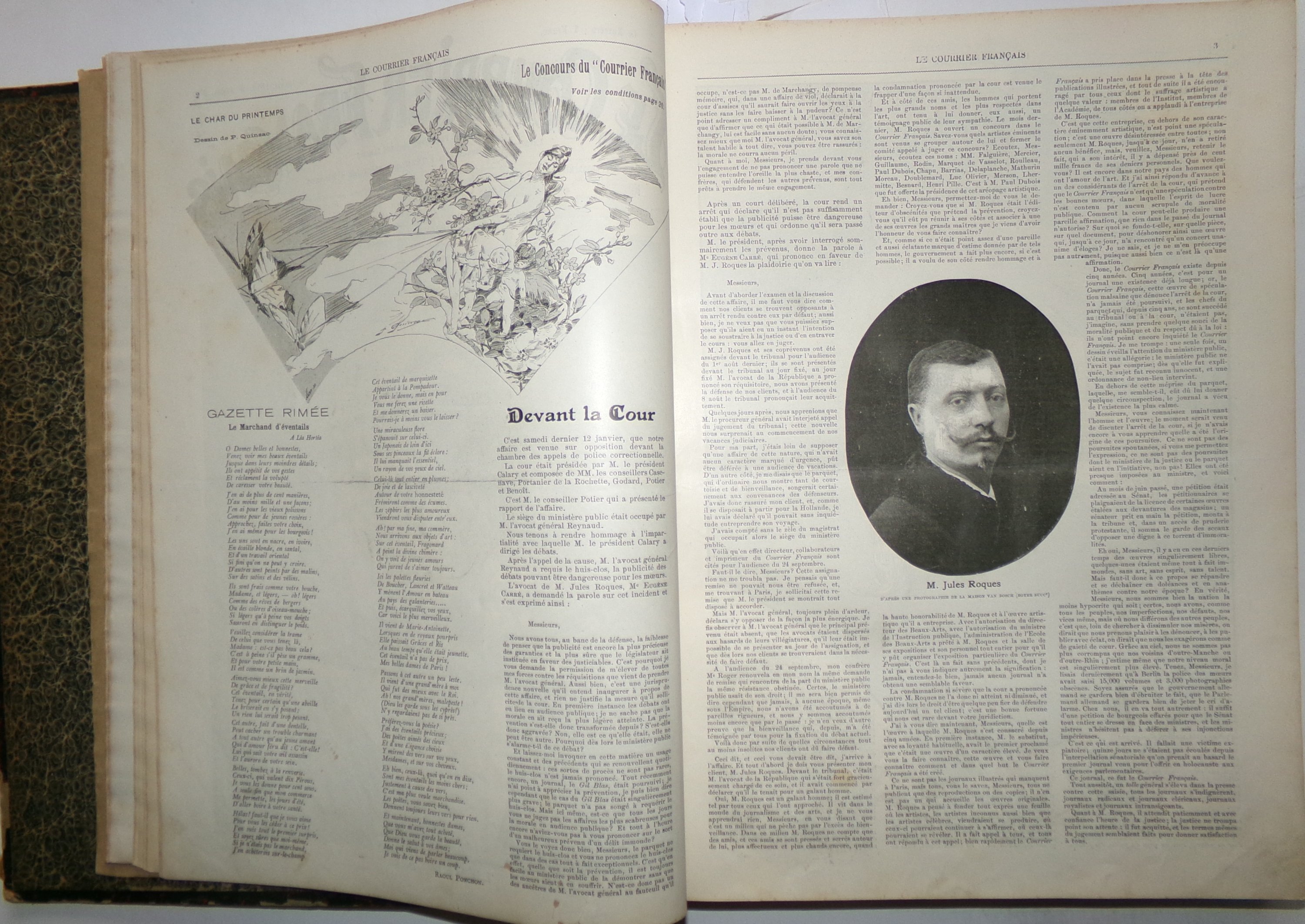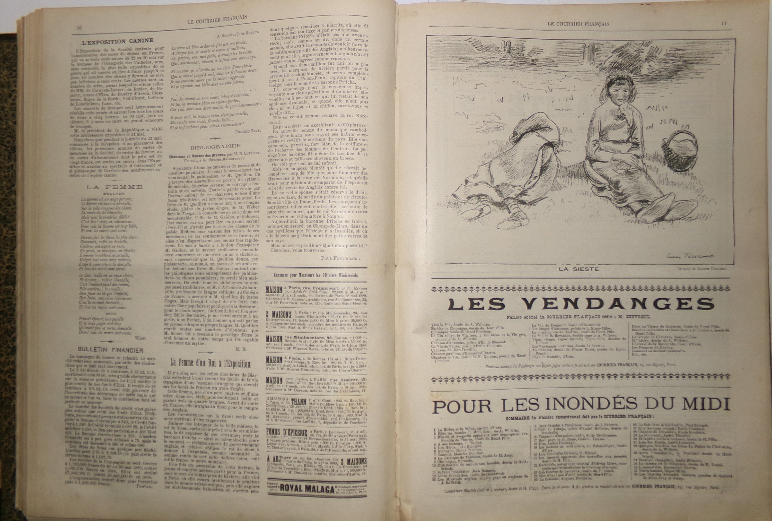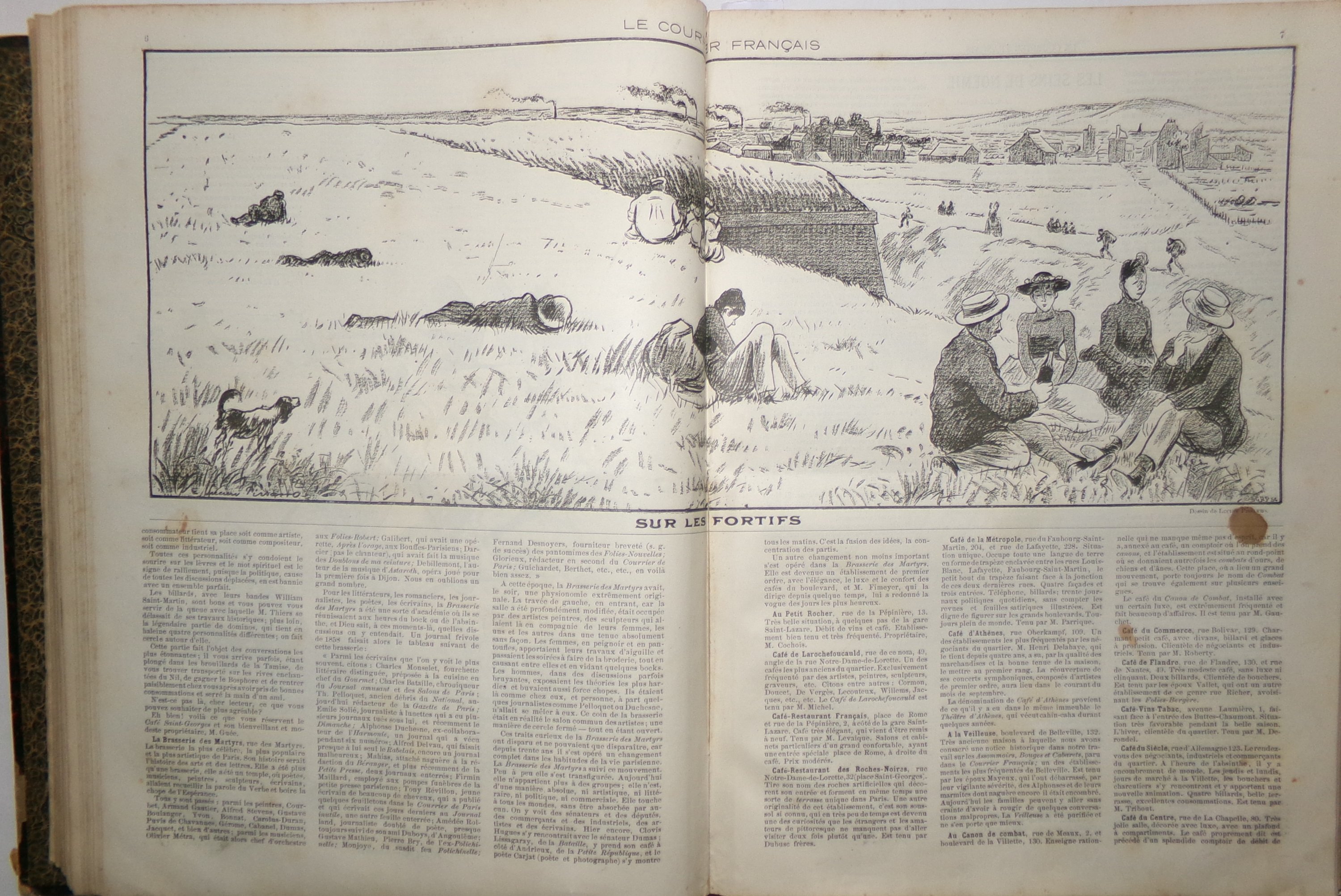 « Fondé par le publicitaire Jules Roques en novembre 1884, Le Courrier Français est un « hebdomadaire illustré humoristique, littéraire et artistique », issus de la sociabilité montmartroise des années 1880. Nous sommes donc au cœur de ce que l’on appelle improprement la « Bohème Montmartroise », même si les bureaux du journal sont au 14 rue Séguier. Sa dimension Montmartroise, outre la géographie de ses lieux d’élection et du séjour de ses auteurs, réside aussi dans les dessins qui évoquent régulièrement la population contrastée de la Butte (artistes, modèles, lingères, bourgeois, employés, ouvriers travaillant sur le chantier du Sacré Cœur), moulins, bals, cabarets artistiques et bouges infâmes, assommoirs, les salles du boulevard Rochechouart, Moulin Rouge et surtout l’Elysée Montmartre. » (Extrait « Le Courrier Français » par Laurent Bihl, 2007)