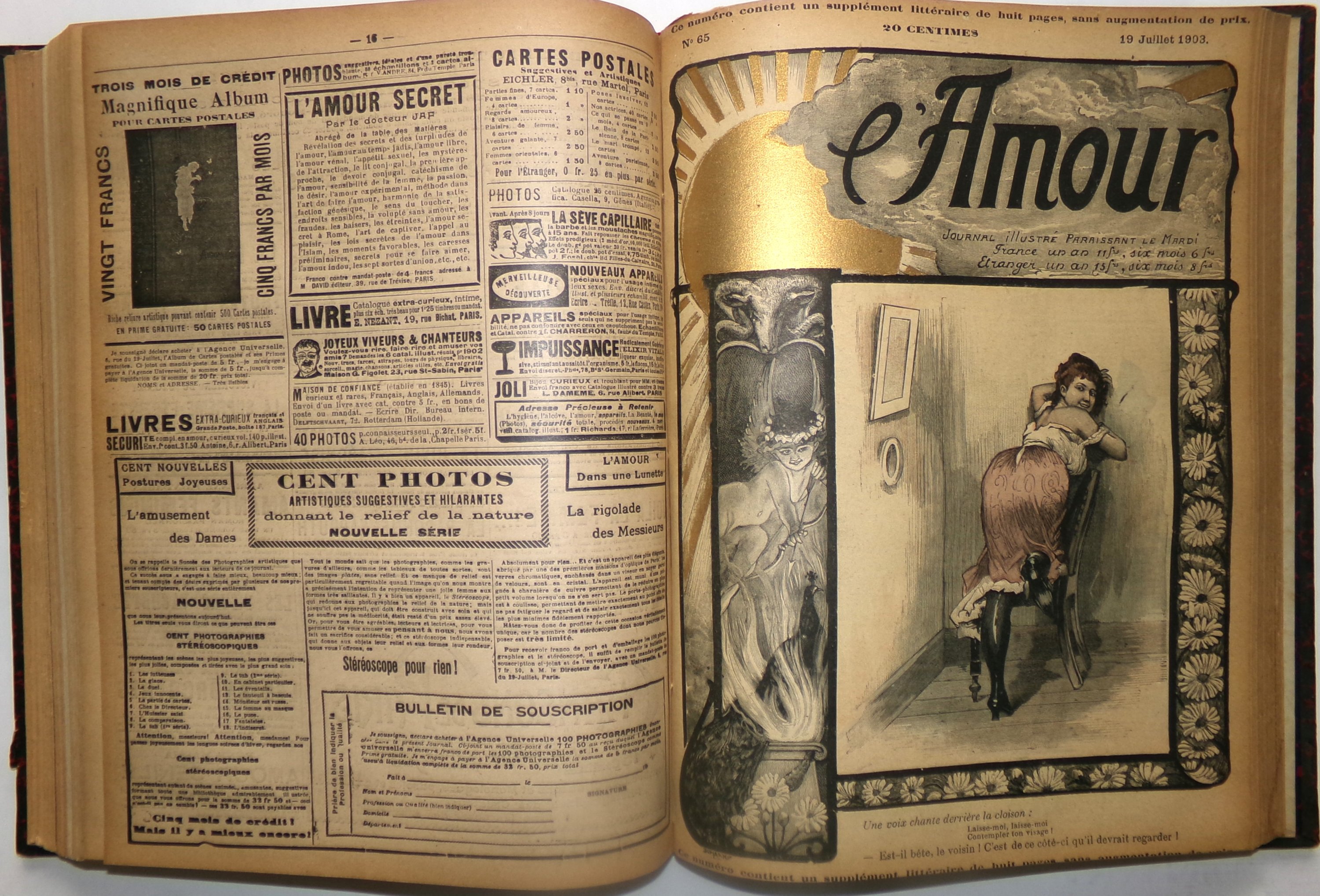 L’Amour, journal illustré hebdomadaire, 1 vol. in-4 rel. n°36 (28 déc. 1902) au n°151 (12 mars 1905), incomplet ;