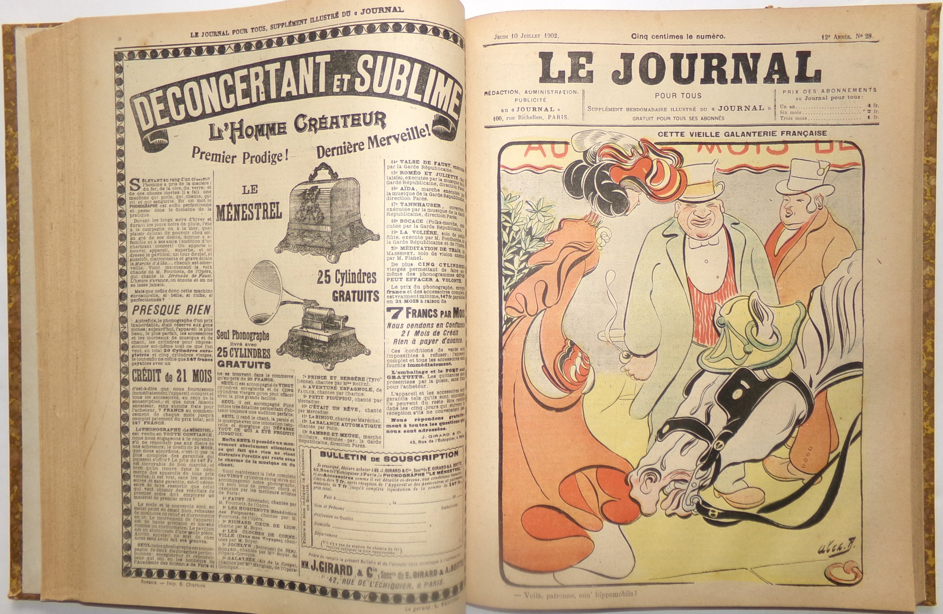 Le Journal pour tous, hebdomadaire illustré, 2 vol. in-4 rel. : (1 vol.) n°1 (17 janv. 1901) au n°50 (26 déc. 1901), complet ; (1 vol.) n°1 (2 janv.1902) au n°52 (25 déc. 1902) (mque 15) Ill. de Gottlob, Radiguet, Benjamin Rabier, Ferdinand Bac, Edouard Bernard, Guydo, d’Ostoya, Poulbot, Weiluc, etc.